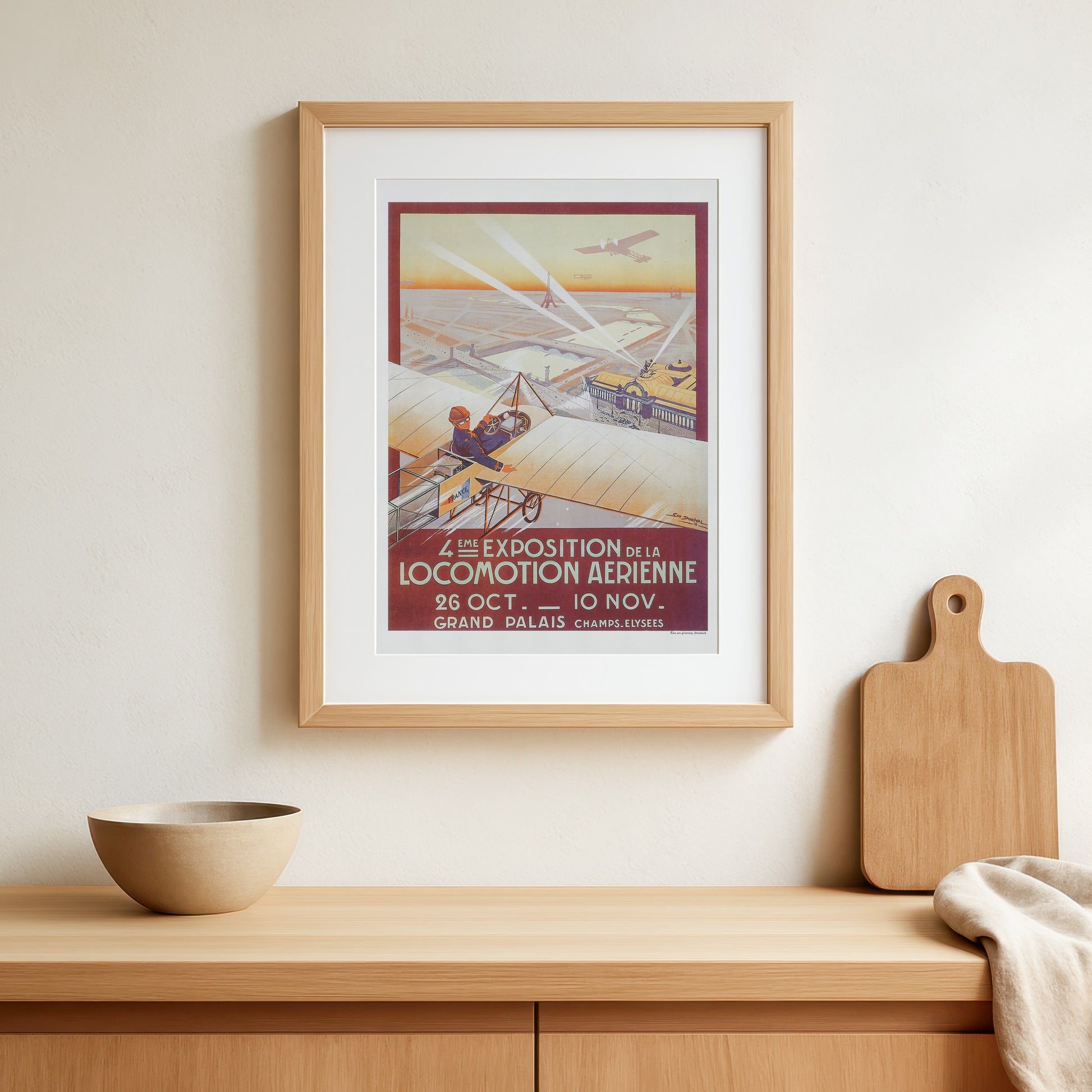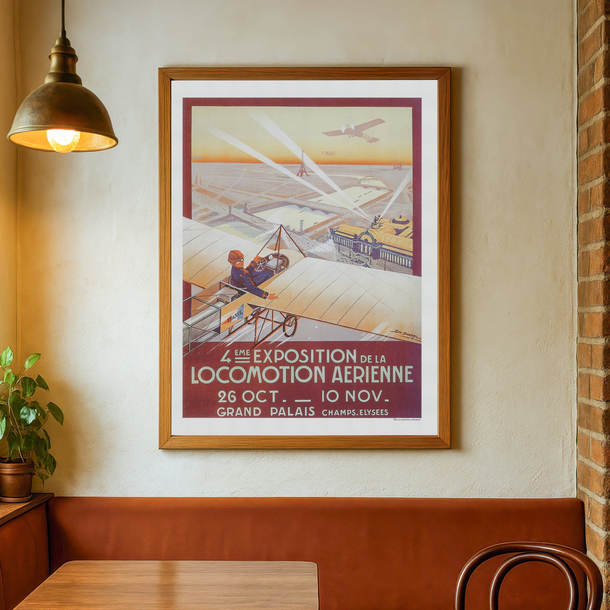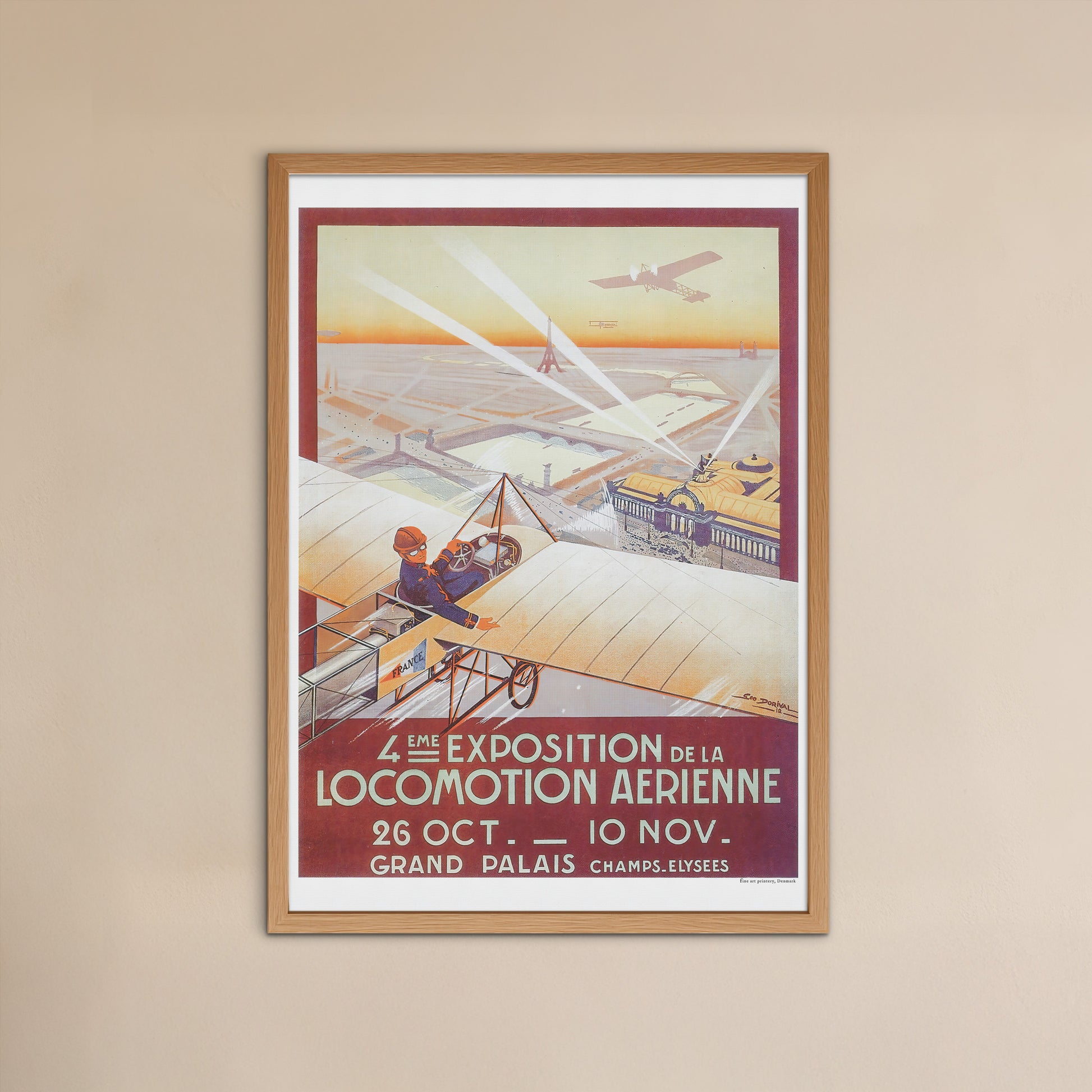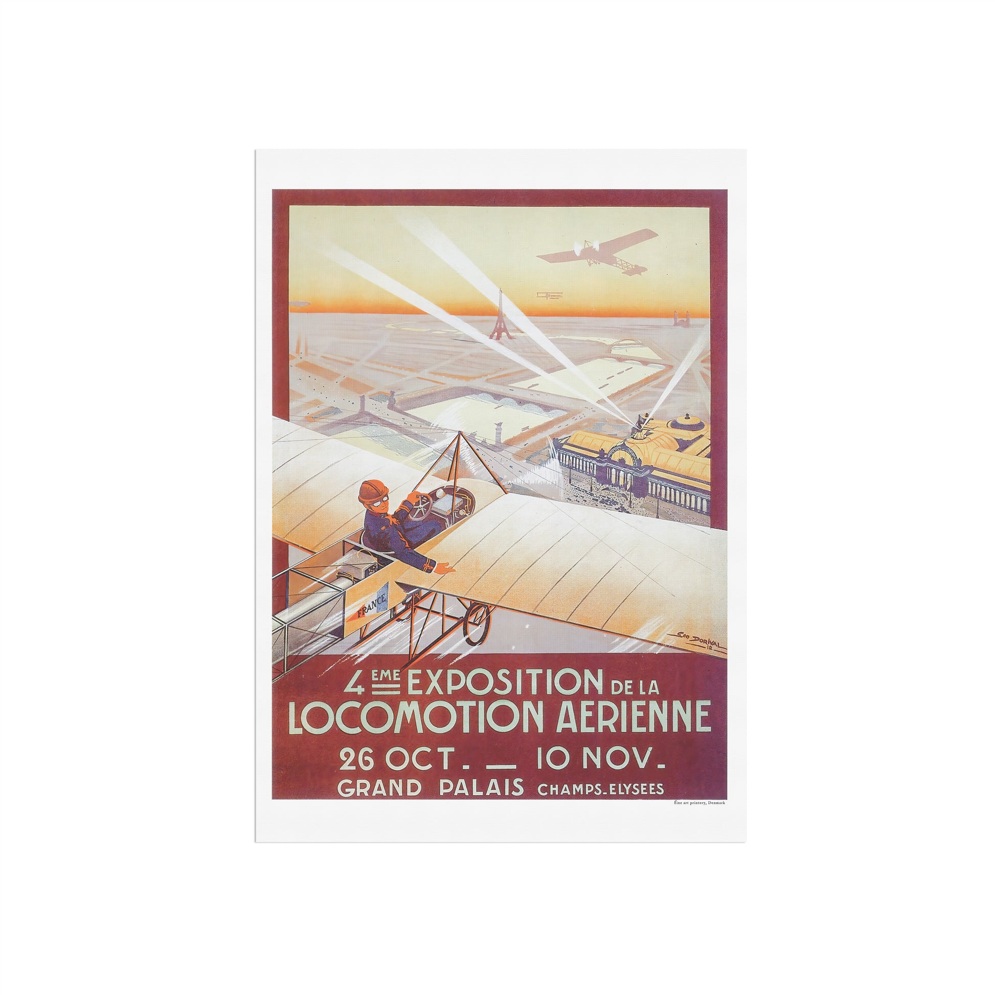 "4eme Exposition de la Locomotion Aerienne" Den 4. udstilling/show for alt hvad der skete indenfor luftfart, var en storslået begivenhed afholdt på det prestigefyldte Grand Palais i 1912. Udstillingen blev promoveret og slået stort op gennem flere medier, blandt andet denne plakat, illustreret af den talentfulde Géo Dorival. Plakaten viste fly i Bleriot-stil, der svævede højt over den parisiske skyline, med Grand Palais og Champs-Elysees i baggrunden. Plakaten fangede også storheden ved Eiffeltårnet og Notre Dame, hvilket tilføjede begivenhedens overordnede storslåethed. Denne udstilling var en fejring af fremskridtene inden for luftteknologi og var et must-see for alle interesserede i luftfart.