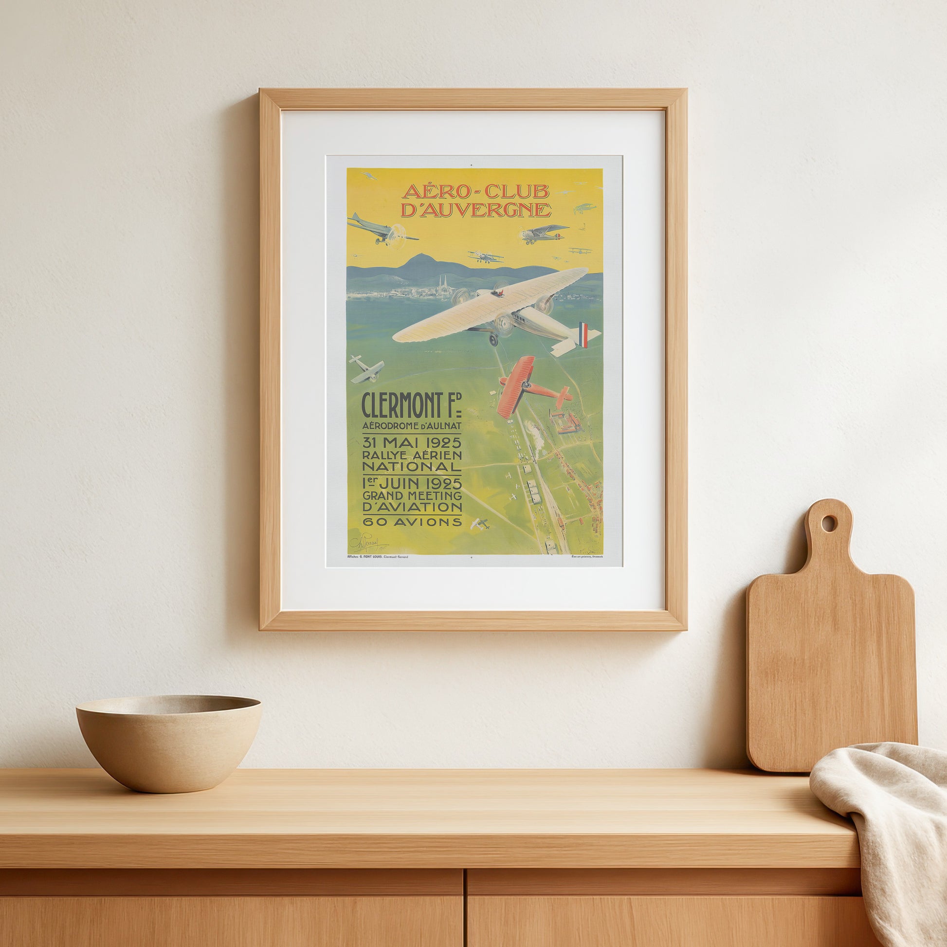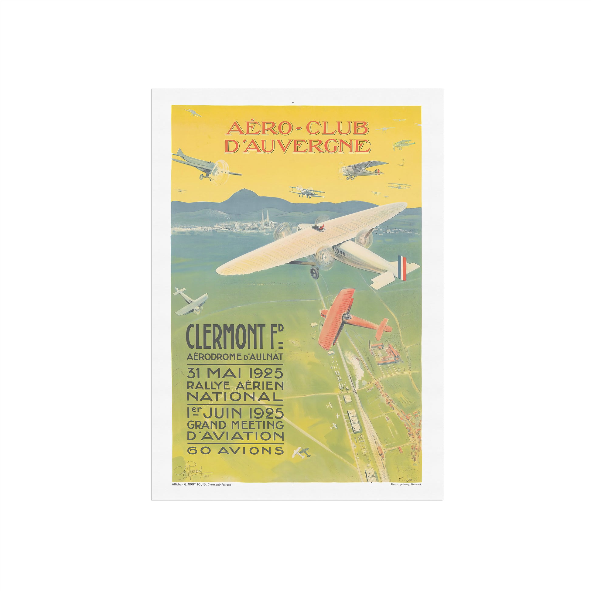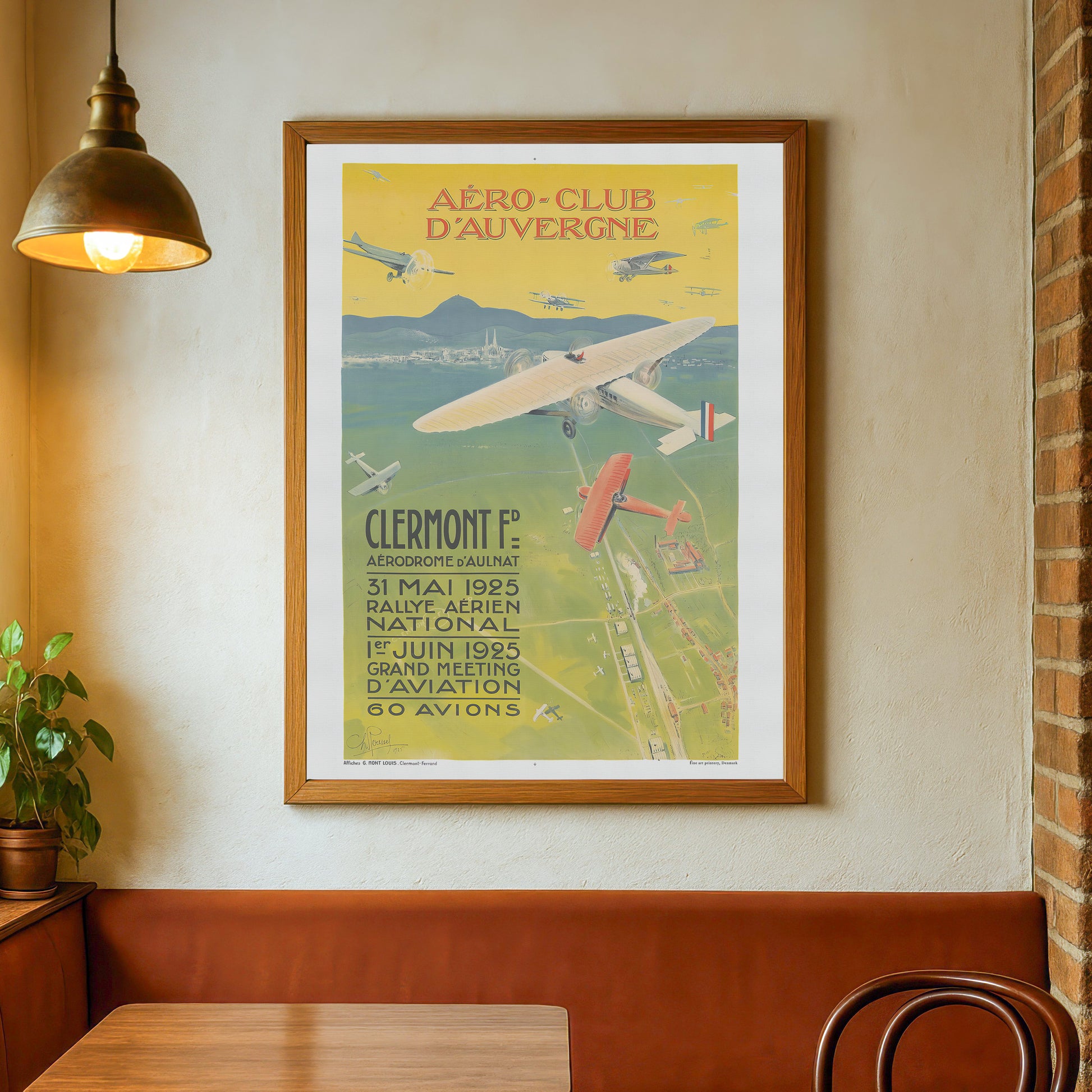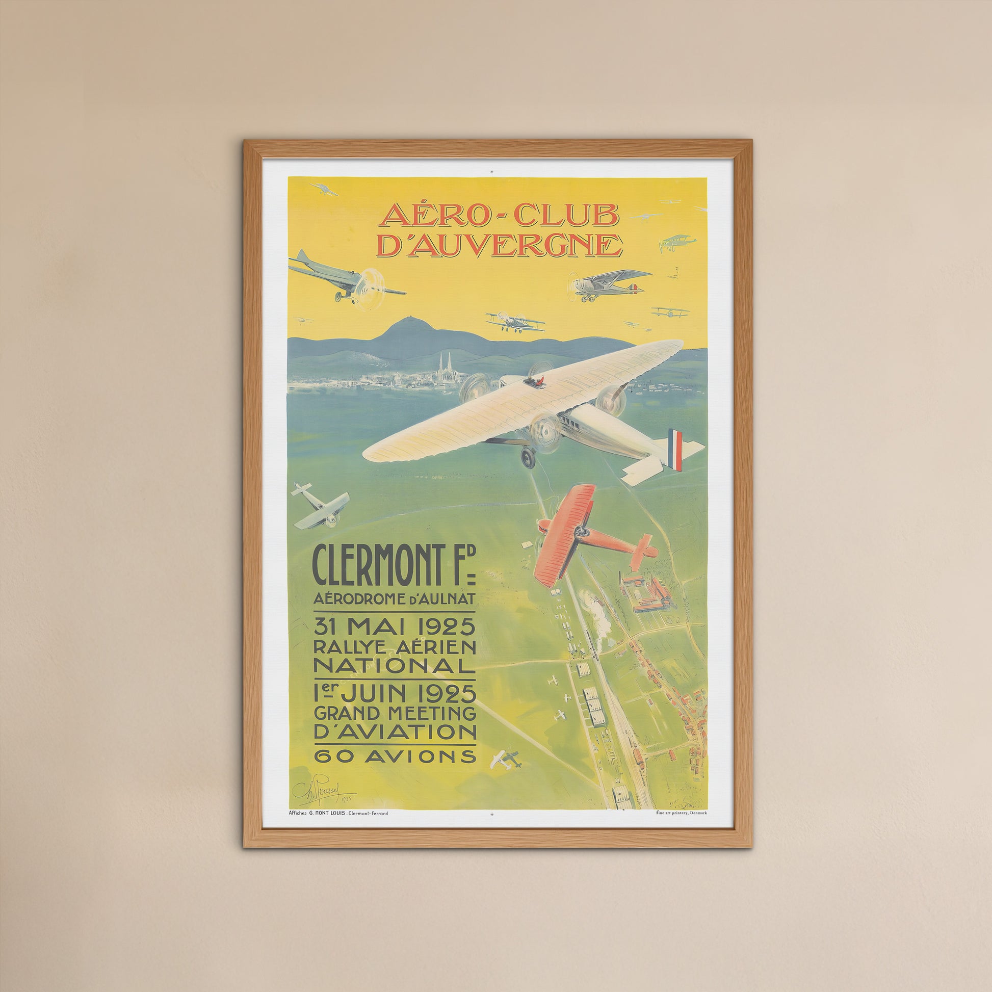 Dette fængslende kunstværk viser en betagende scene af fly, der flyver gennem himlen, på vej til det store Auvergne National Air Rally og Grand Aviation Meet. En betydningsfuld begivenhed med 60 fly til stede. Auvergne Aero Club, etableret i 1920, fortsætter sin arv i dag med flyklasser og spændende sightseeingture.