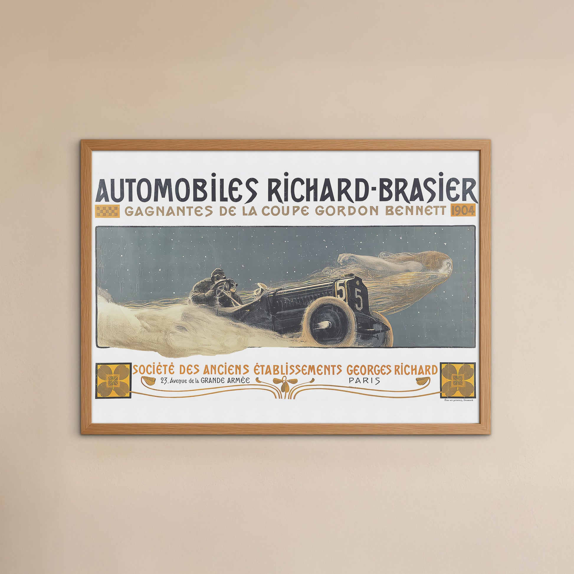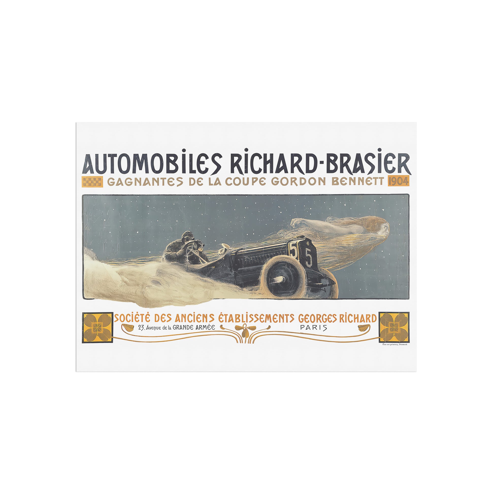 Georges Richards trang til bilvæddeløb får vi også en lille smag på via plakaten her, da den udover at være en reklame for Richard-Brasier automobiler, også er illustrationen af en Richard-Brasier bil der vinder det berømte Gordon Bennett Cup i 1904. Føren af bilen var Léon Théry, og ruten der blev kørt lå i Taunus bjergene i Hessen, Tyskland.