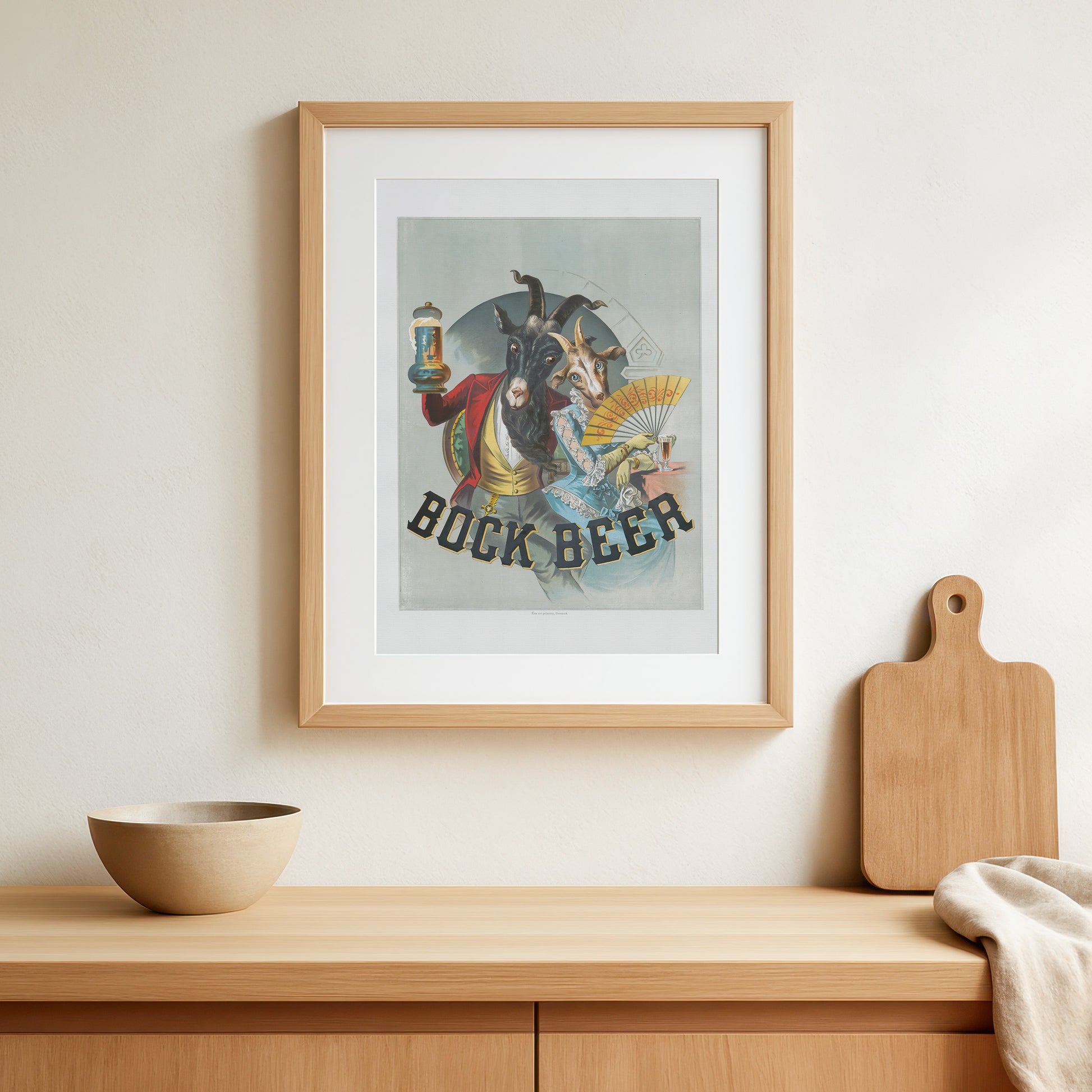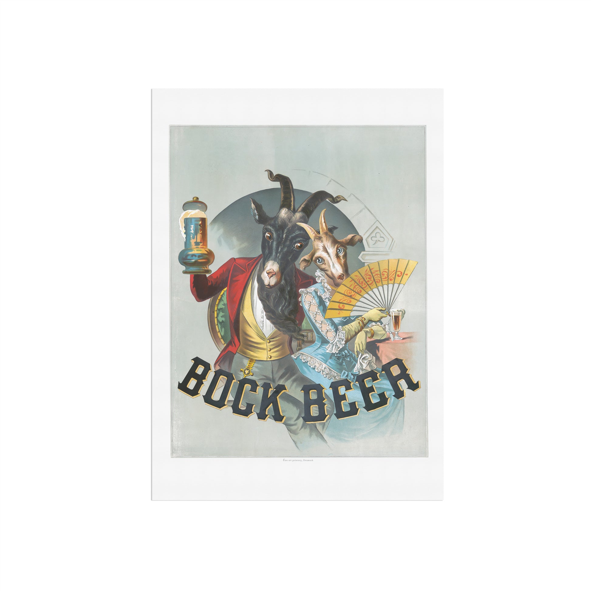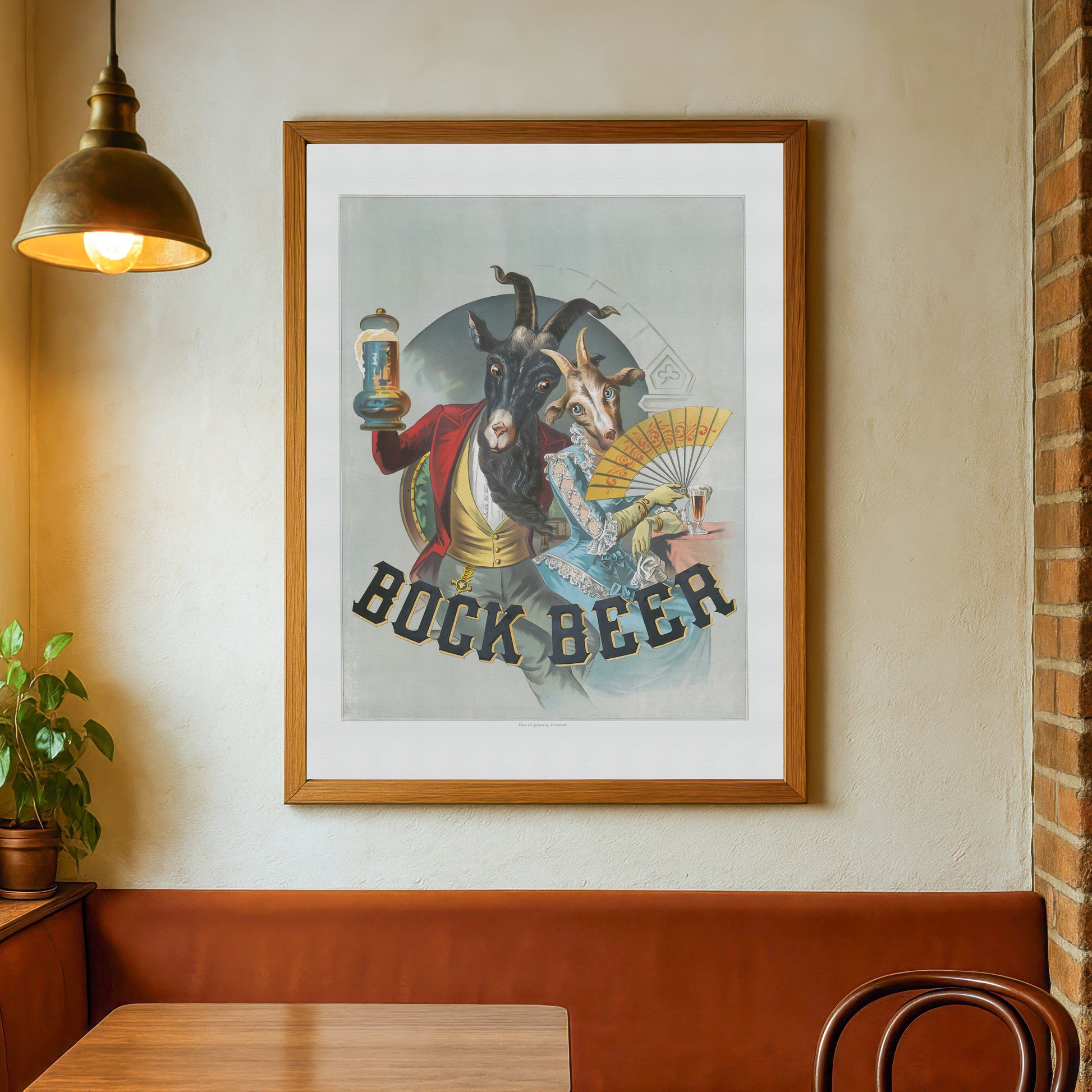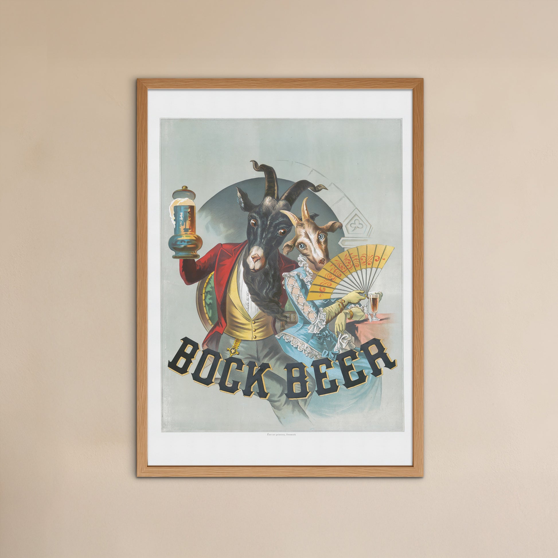 Denne smukke reklameplakat for Bock øl, viser to geder i flot "mennesketøj", hvorfra den ene ged holder en dejlig skummende Bock øl. Øl plakaten er oprindeligt fra 1883.