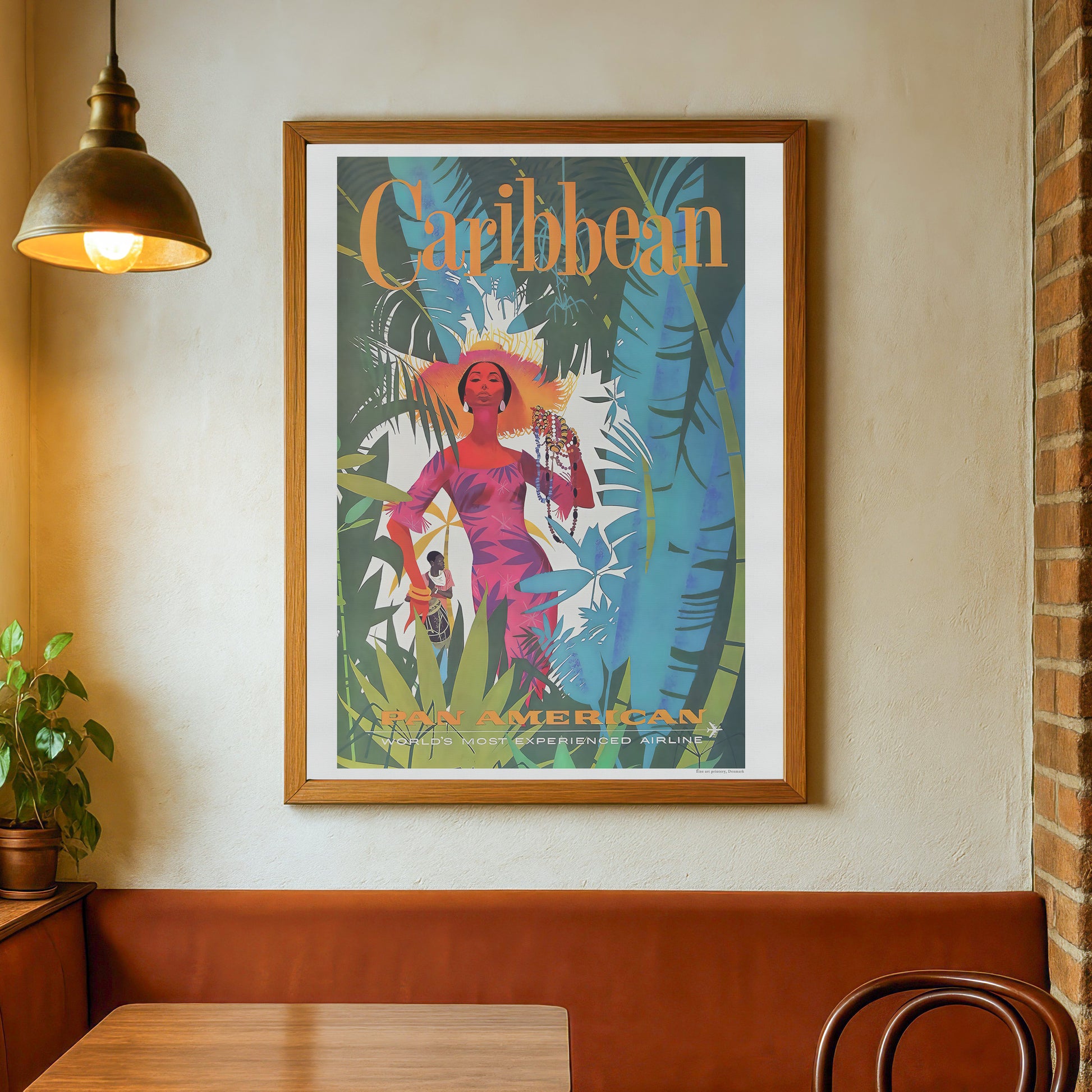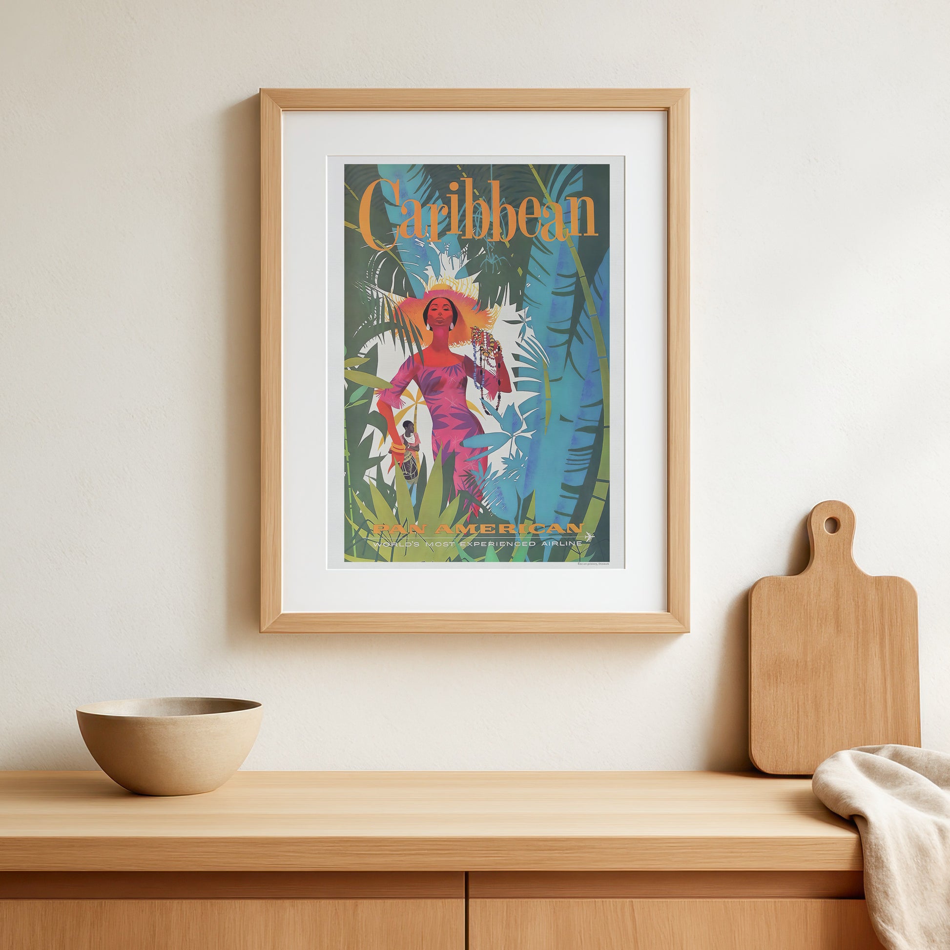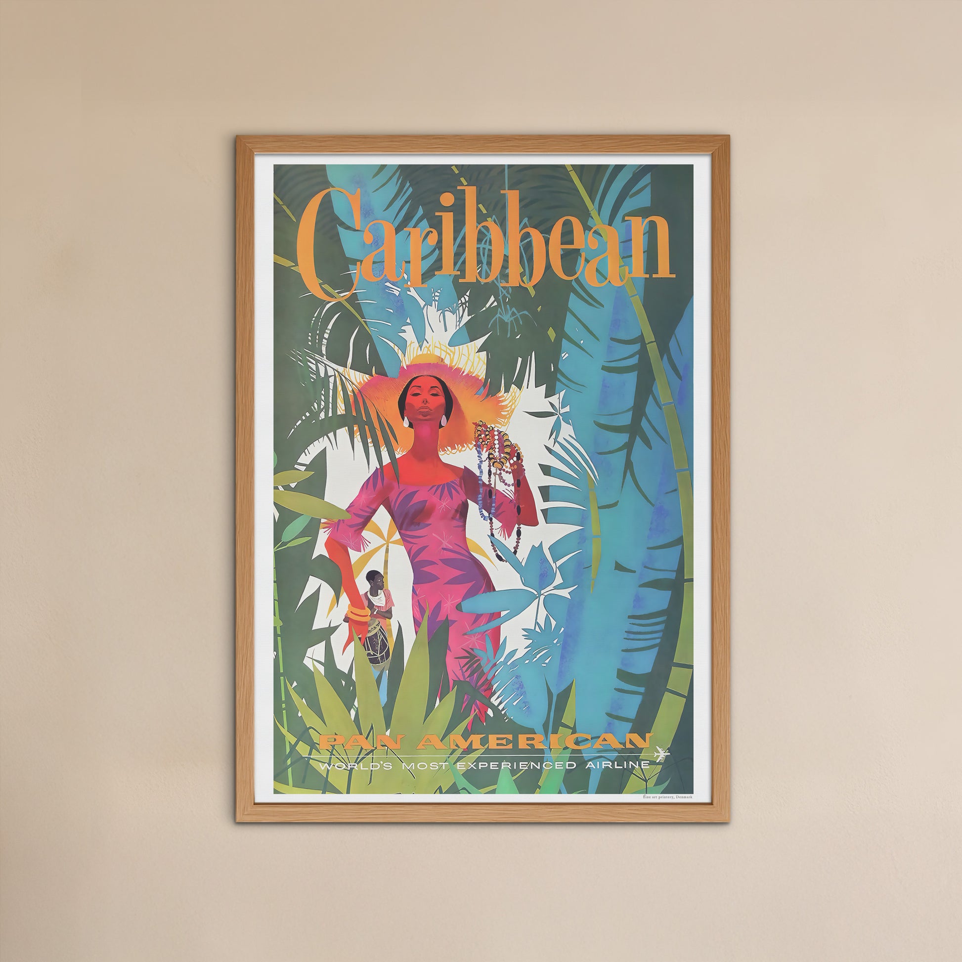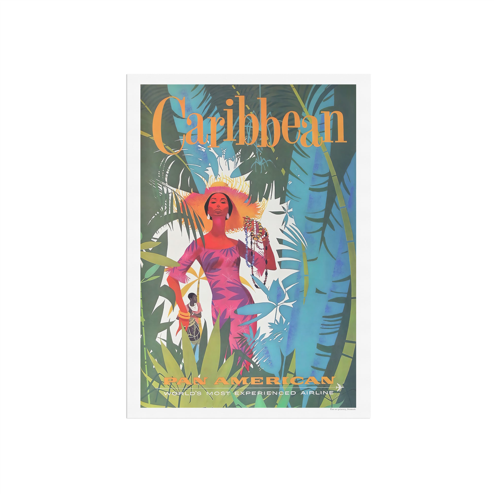 Den smukke rejseplakat fra Pan American World Airways (Pan Am), der viser en bid af det fængslende Caribien. Med sine dybe og kraftfulde farver giver dette kunstværk et indblik i Caribiens fortryllende mystik og atmosfære. Måske har du besøgt Caribien, måske kommer du aldrig til det, men her har du muligheden for at få lidt af Caribien hjem på væggen.