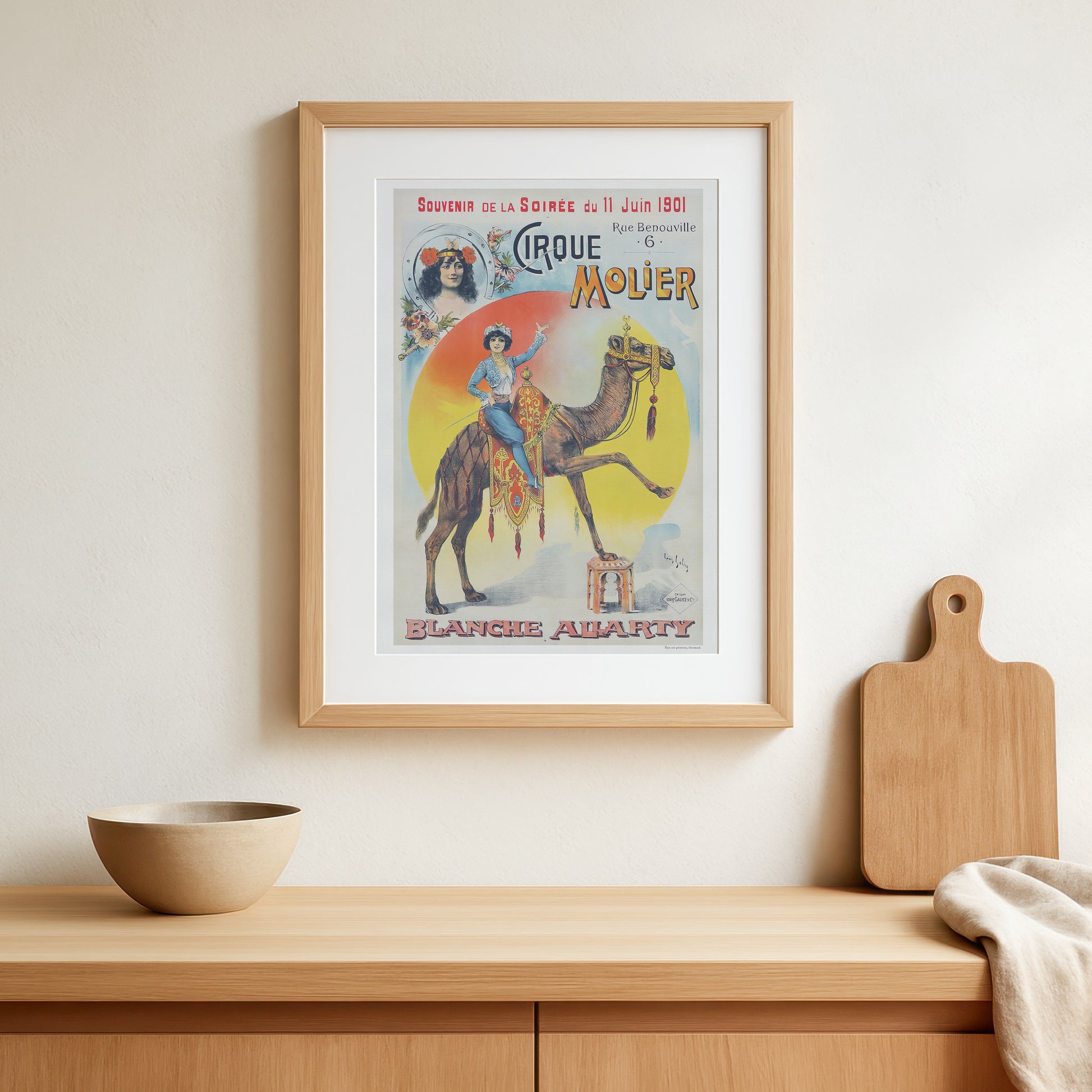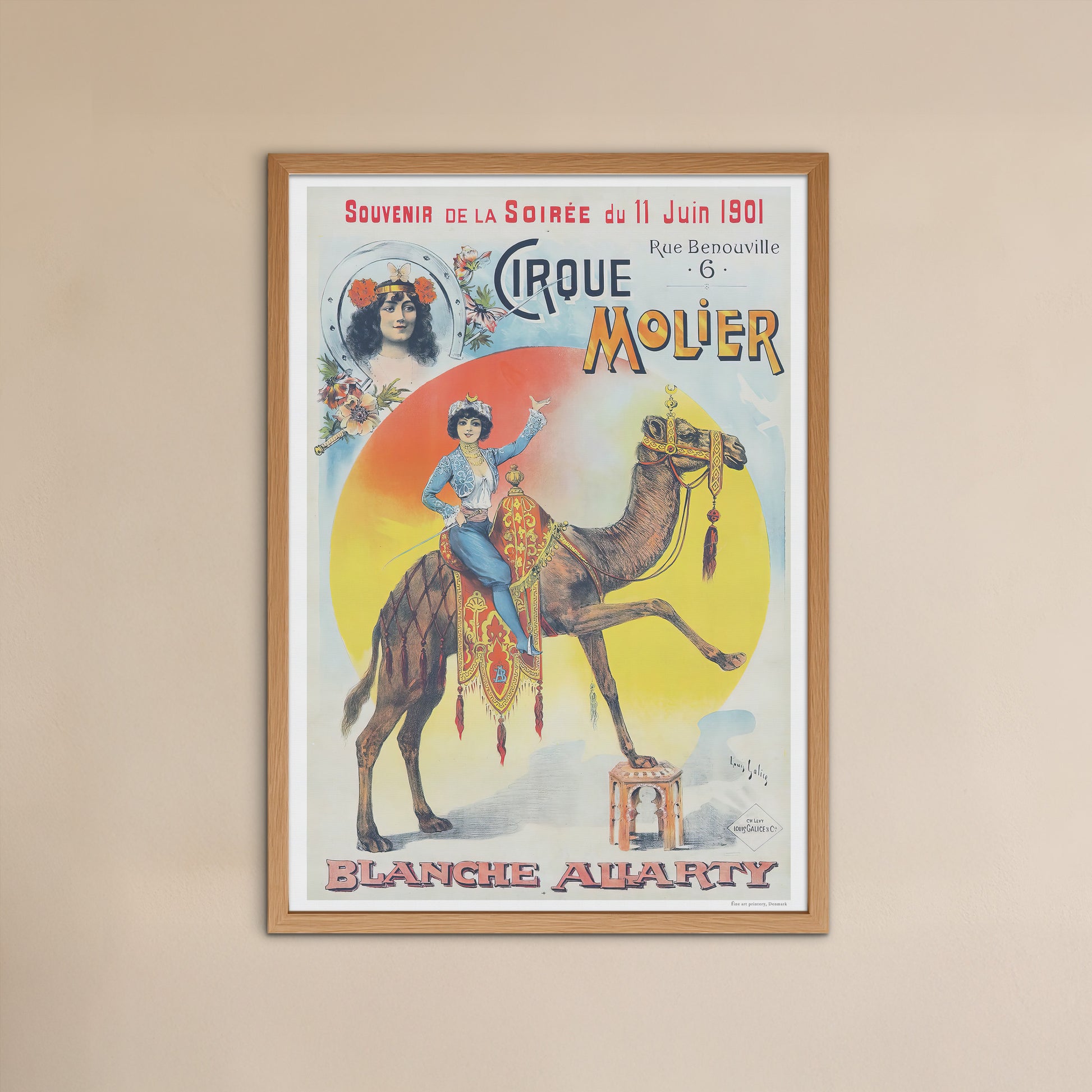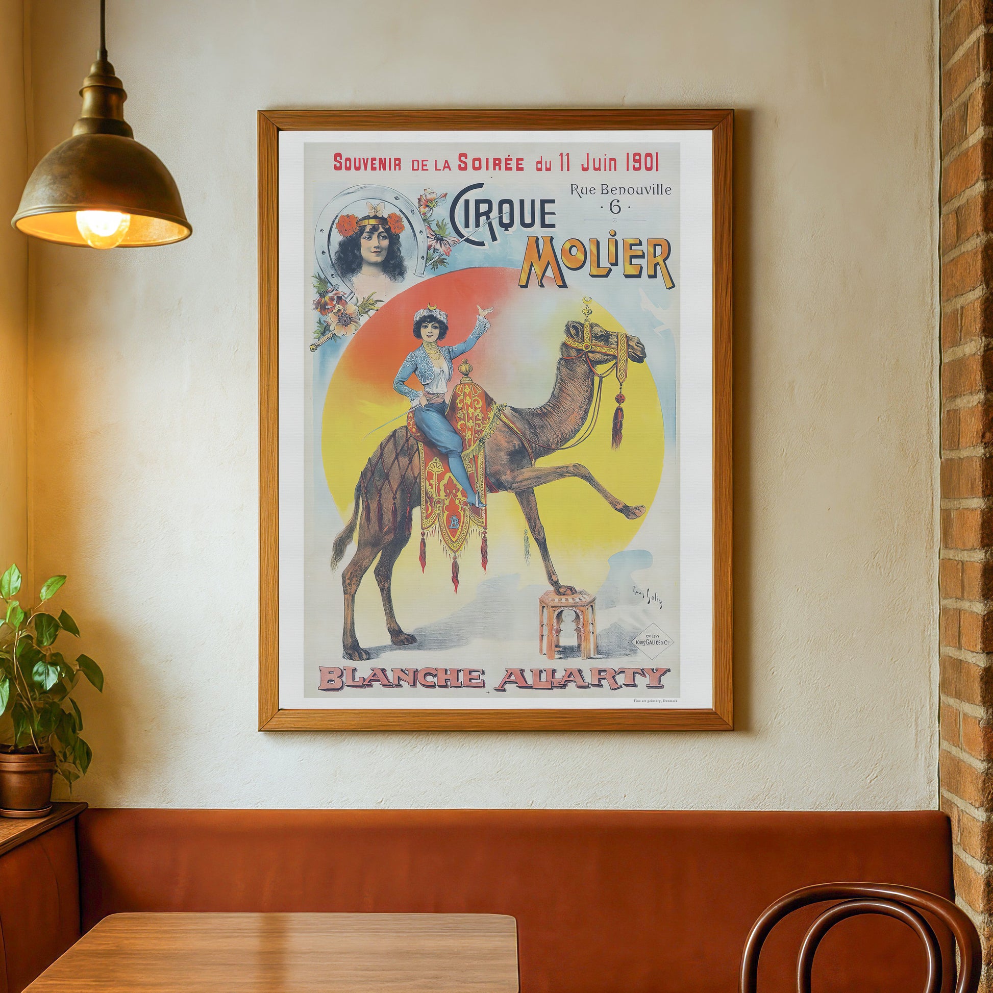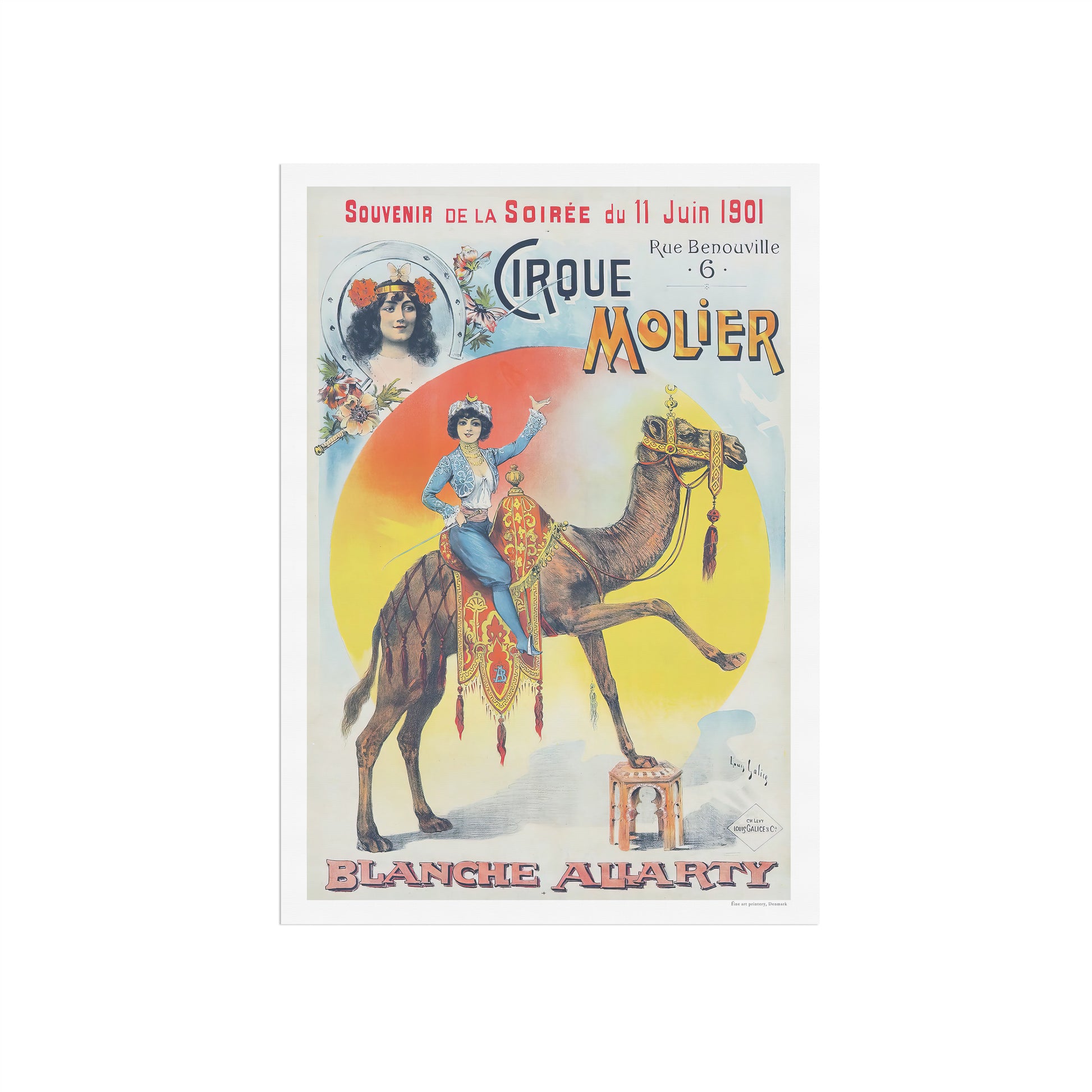 Har du haft fornøjelsen af at se Cirque Molier Cirkusplakaten fra 1901? Det er virkelig et mesterværk, der fanger essensen af Blanche Allarty og hendes kamelshow.