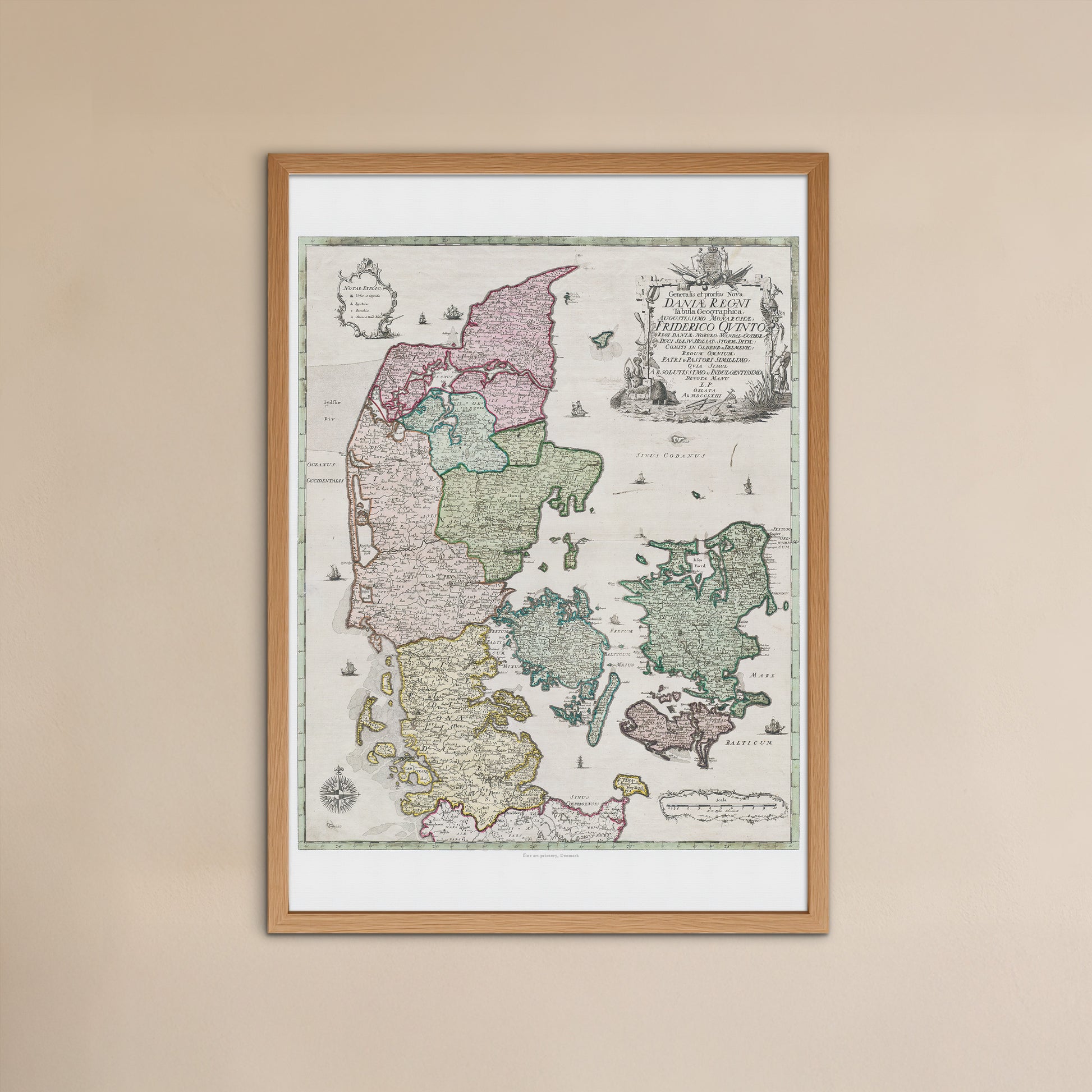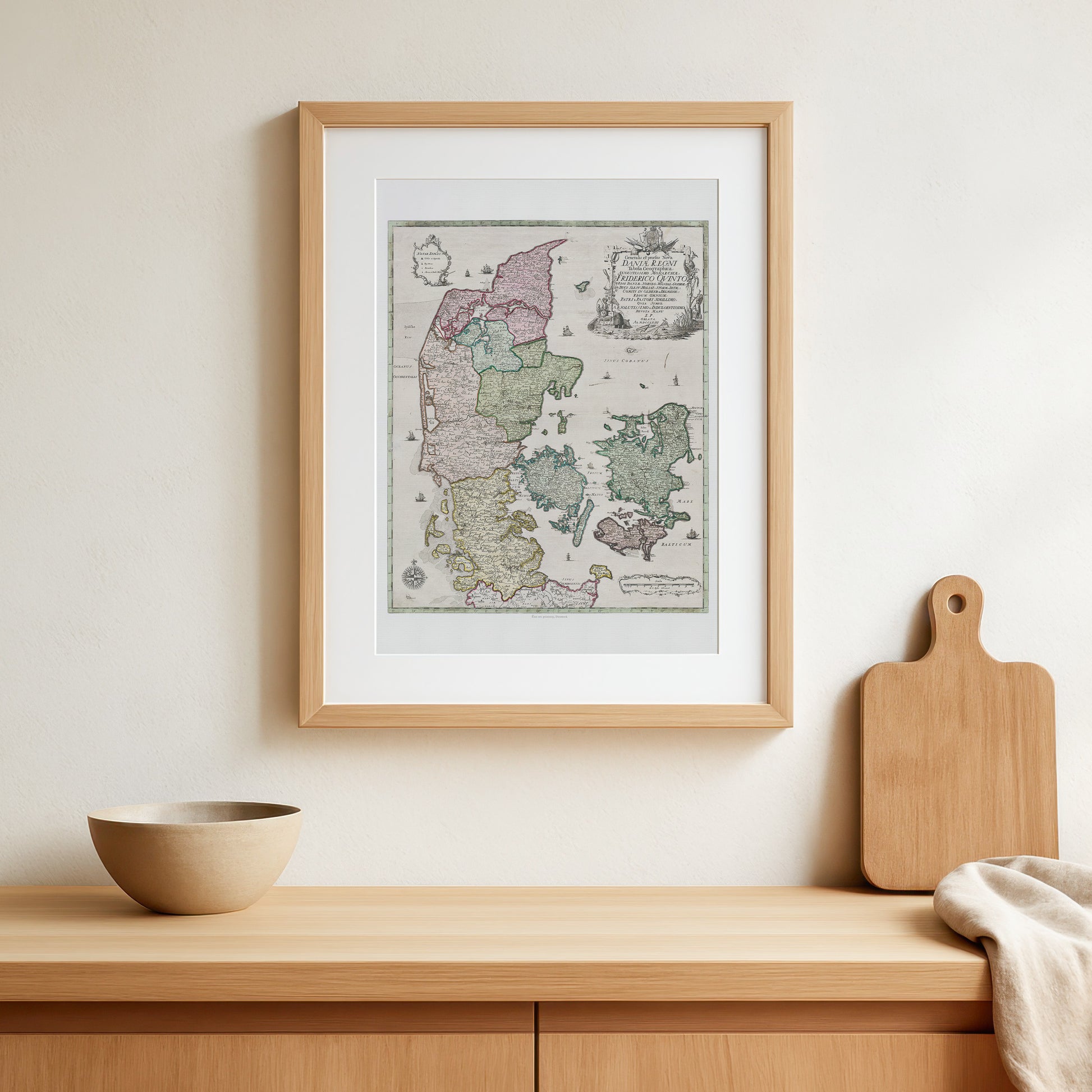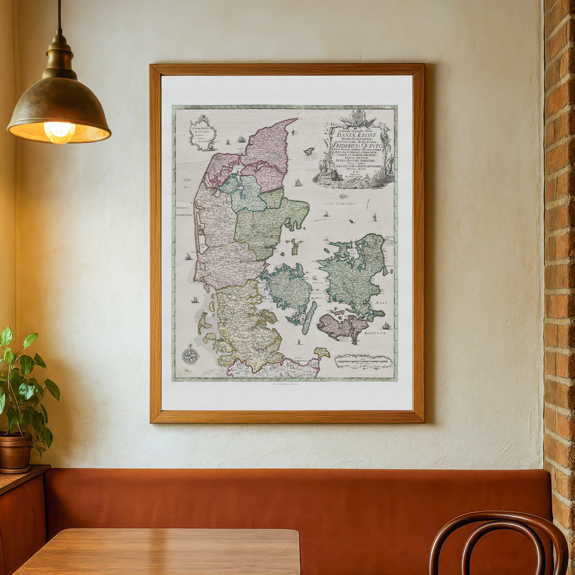 En smuk og elegant reproduktion af det gamle Danmarkskort Generalis et prorsus Nova Daniæ Regni Tabula fra ca 1764., Kortet her, over Danmark var oprindeligt lavet og udgivet af Diderich Fester og Erik Pontoppidan.
