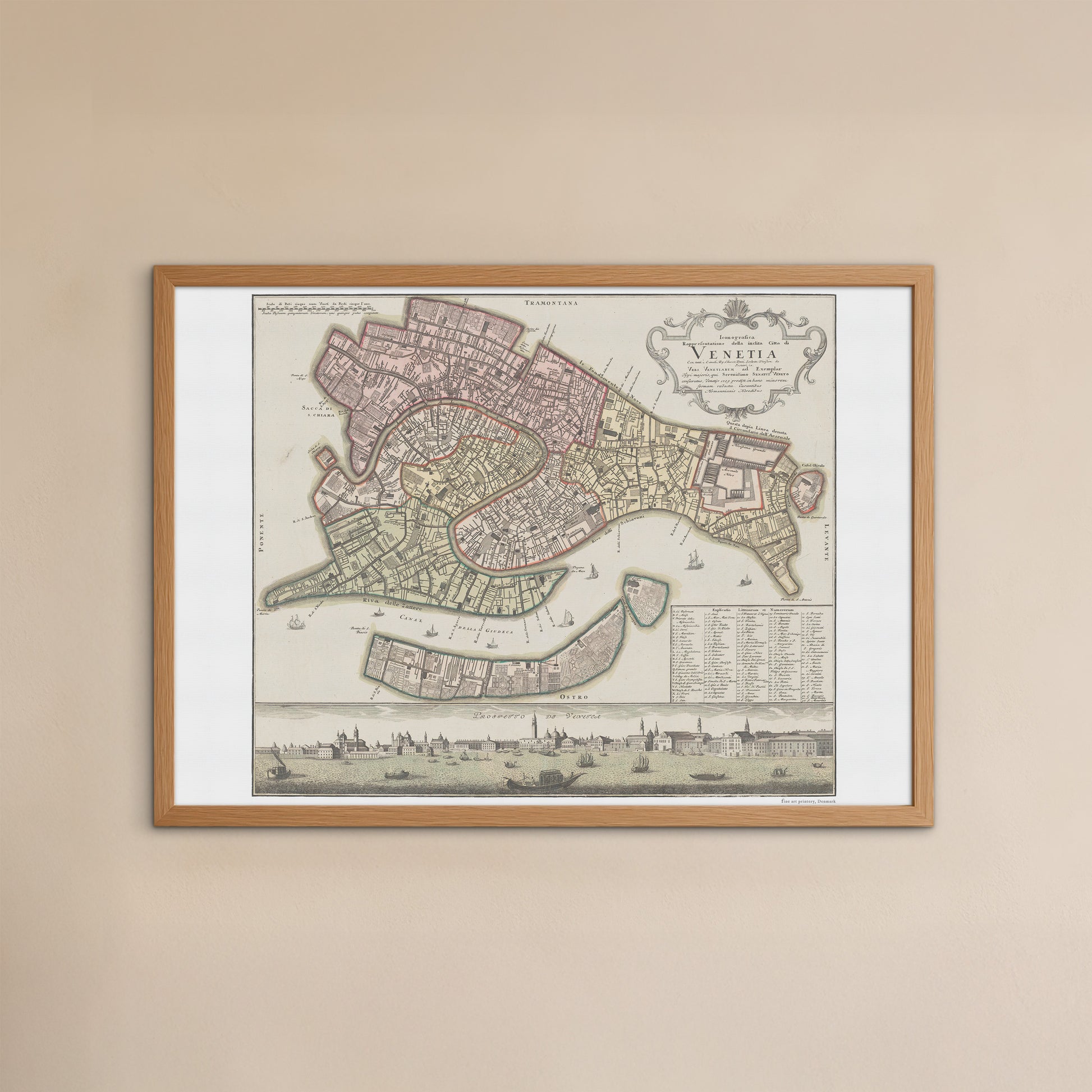 En fantastisk kopi af et gammelt kort over Den berømte by Venedig, med den noget længere originaltitel: Icongrafica rappresentatione della inclita citta di Venetia : con tutti i canali Ry. Chiese Ponti. isolette, division de sestieri, i.e., vrbs Venetiarum ad exemplar typi majoris qui serenissimo senatui Veneto.