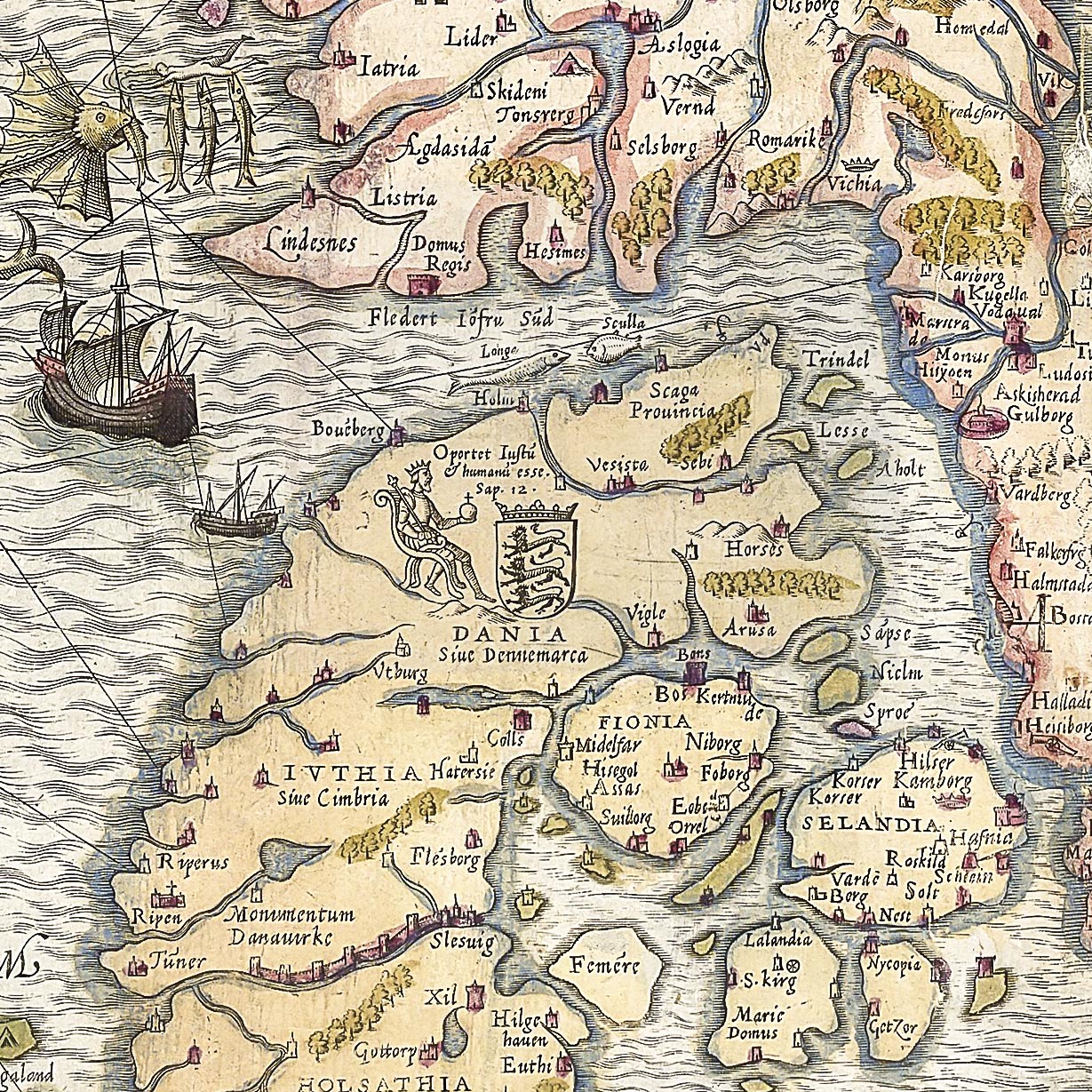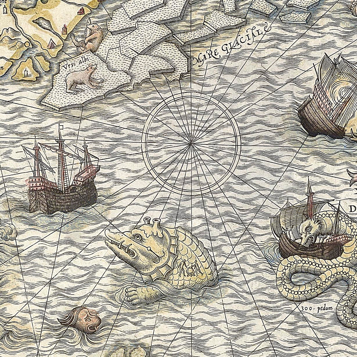 Det er et rigtig flot kort med mange detaljer og mange scener, blandt andet ses arbejdende mennesker, jagende dyr, søuhyrer der angriber skibe, vulkaner i udbrud og meget mere.
