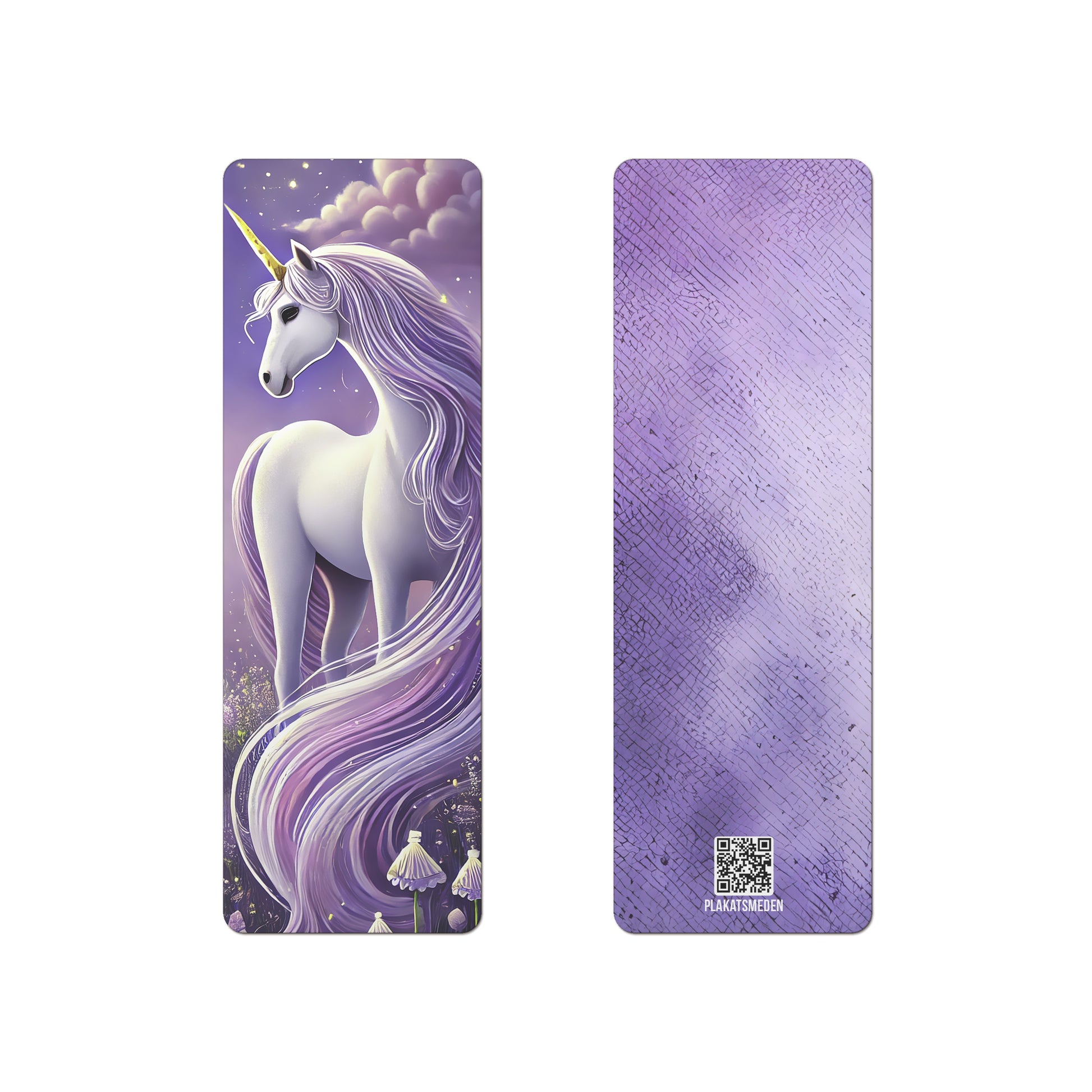 Dette poetiske bogmærke præsenterer en yndefuld enhjørning med langt, bølgende hår i lyslilla og sølvhvide nuancer. Enhjørningen står med ynde og værdighed blandt fine blomster under en lilla nattehimmel fyldt med stjerner og drømmende skyer. Dens gyldne horn og rolige blik udstråler mystik og tryghed – som et væsen hentet direkte fra en fortryllet drømmeverden.