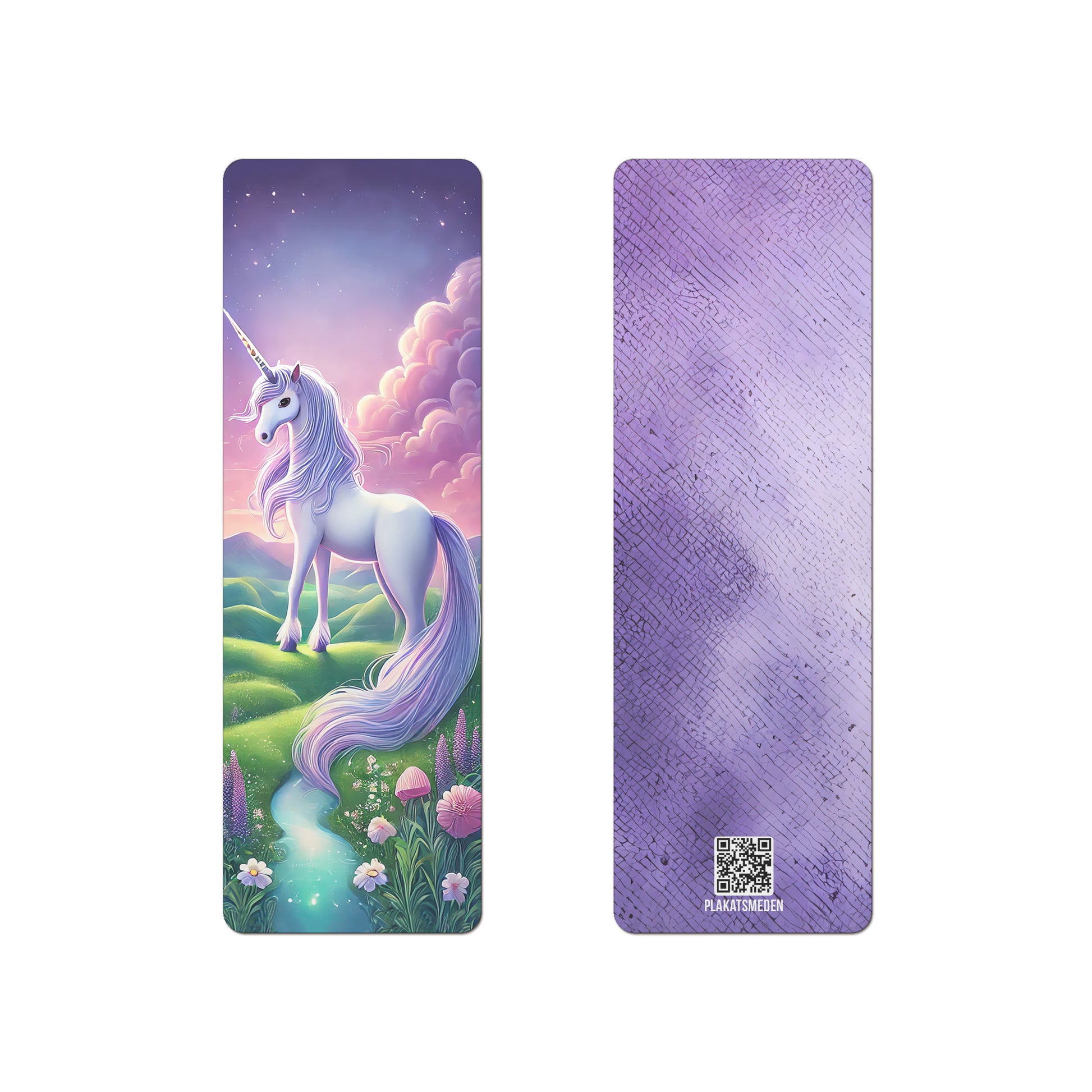 Dette eventyrlige bogmærke viser en yndefuld enhjørning med svajende man og hale i pastelfarver, stående på en blomstereng omgivet af smukke blomster. Baggrunden er badet i varme solopgangsfarver med rosa skyer og en glitrende, blå bæk, der slynger sig gennem det grønne landskab. Enhjørningen står med stolt løftet hoved og kigger mod horisonten – et billede på håb, fantasi og renhed.