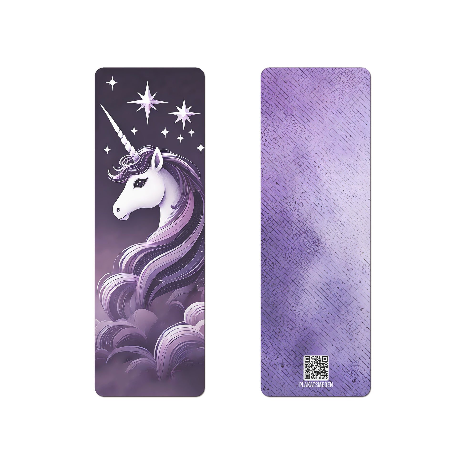 Dette fantasifulde bogmærke viser en elegant enhjørning med lange, bølgende lokker i lilla nuancer, der svæver op af bløde skyer. Baggrunden er en mørklilla nattehimmel, fyldt med stjerner og glitrende lys, som om enhjørningen stiger op fra drømmenes rige. Dens rolige blik og spiralformede horn understreger det magiske og eventyrlige udtryk, der vækker barnlig forundring hos både store og små.