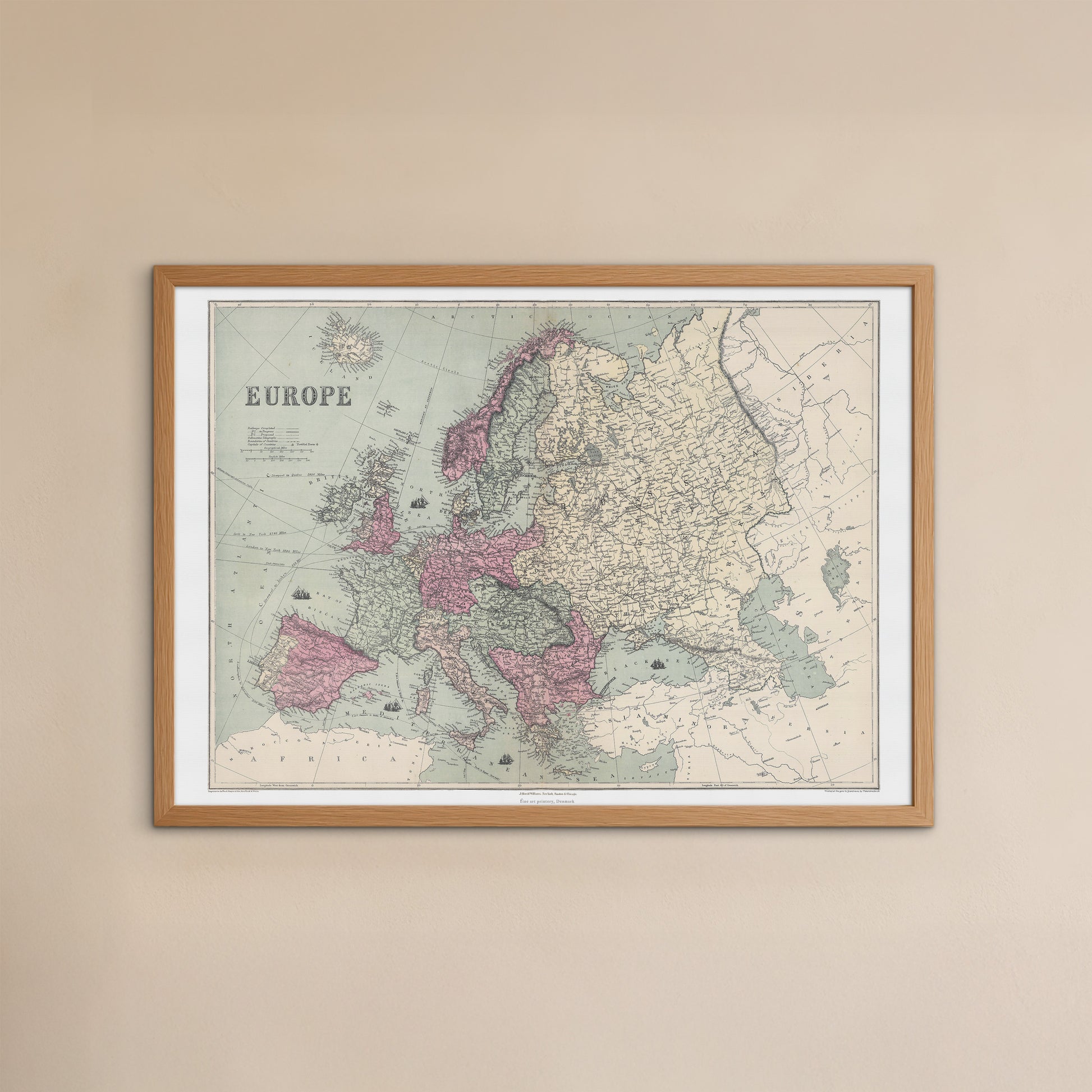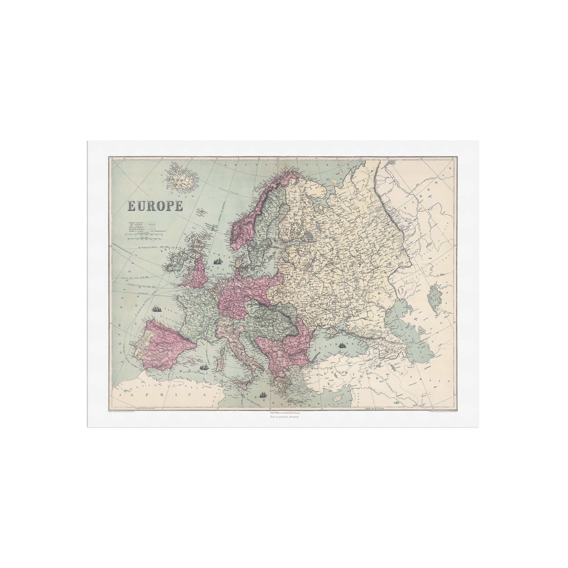 Et smukt, simpelt og veldetaljeret kort over Europa som det så ud i 1873. En af de sjovere detaljer ved kortet er at det viser passagerskibsruter over Atlanterhavet, hvilket minder én om at det er et ældre kort, for i dag har flyruterne overtaget hverdagsrejserne. Det er tekstmæssigt et meget omfattende kort, og byerne læses derfor bedst på de største versioner, men har man allerede styr på sin europageografi og derfor ikke noget behov for at læse hver eneste by, så kan de mindre versioner også sagtens være en fryd for øjet.