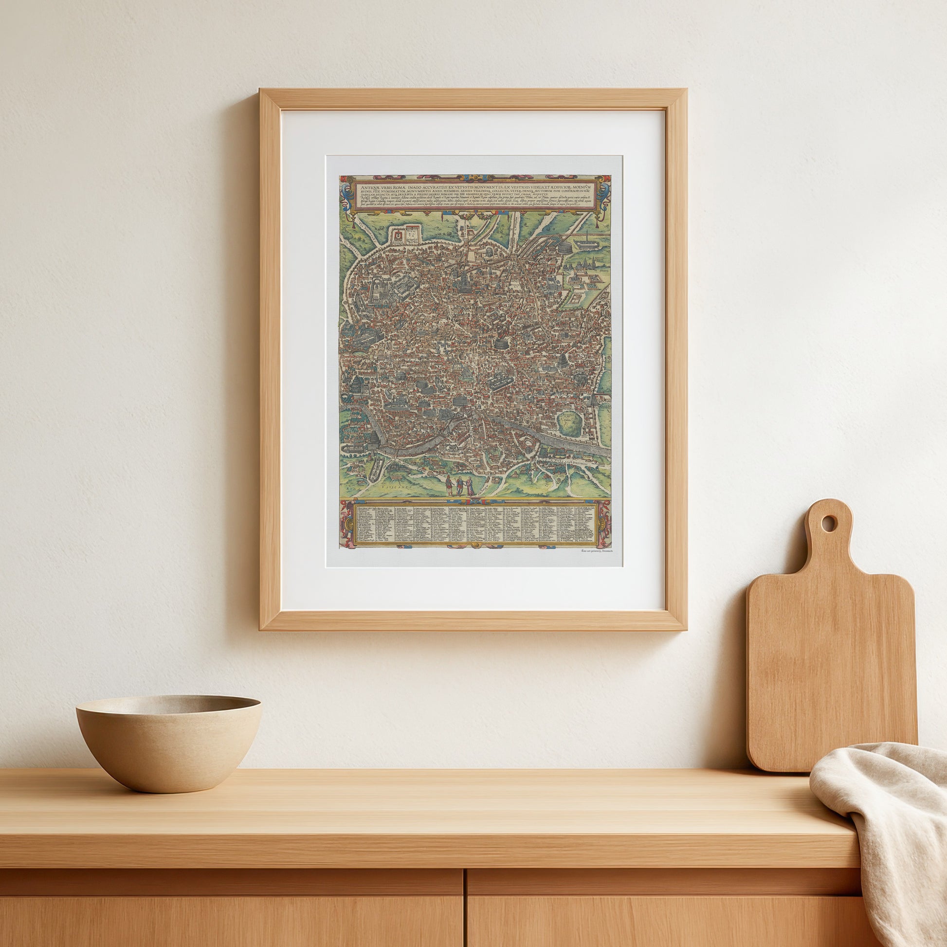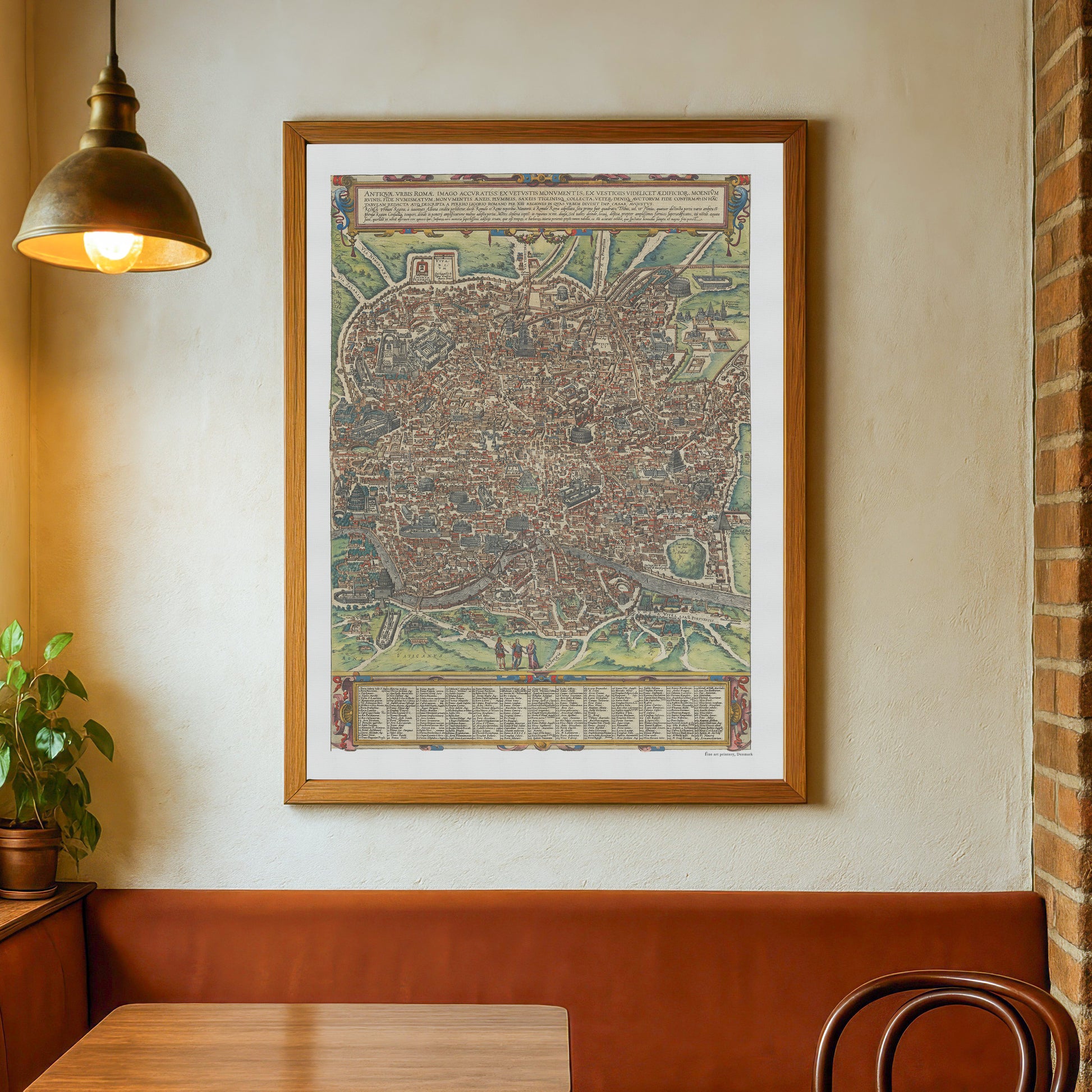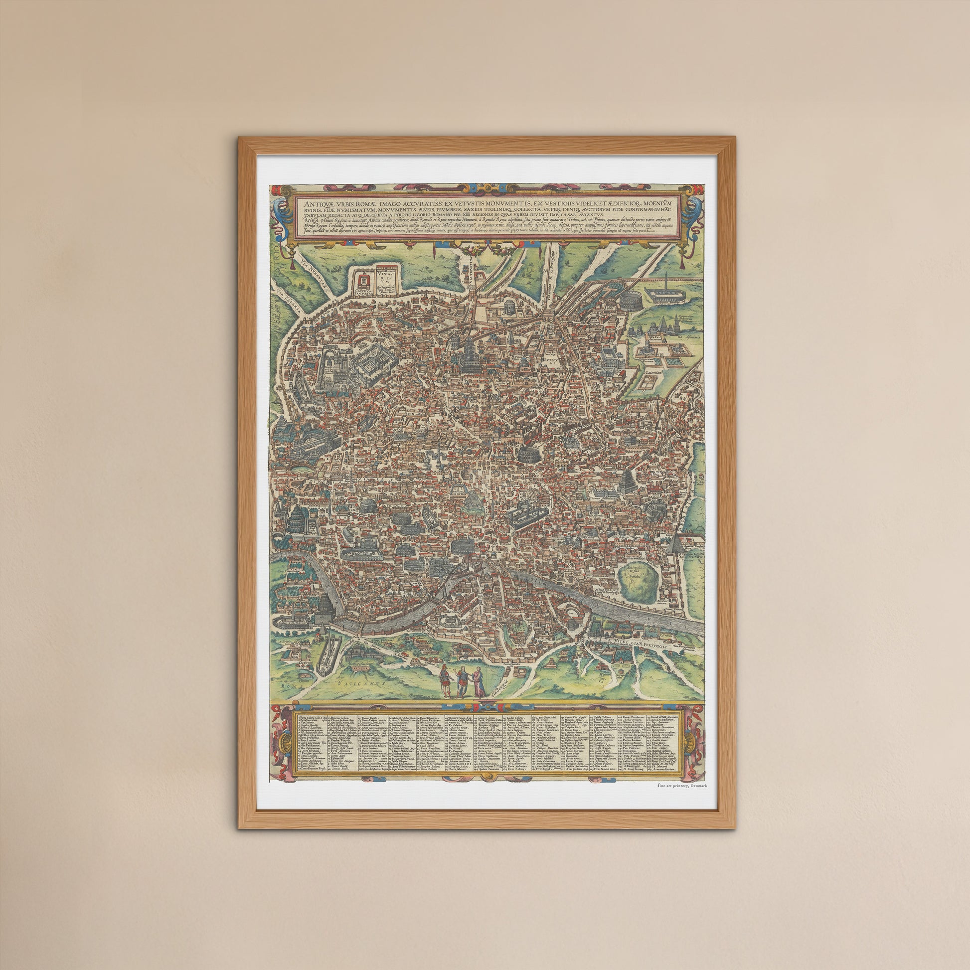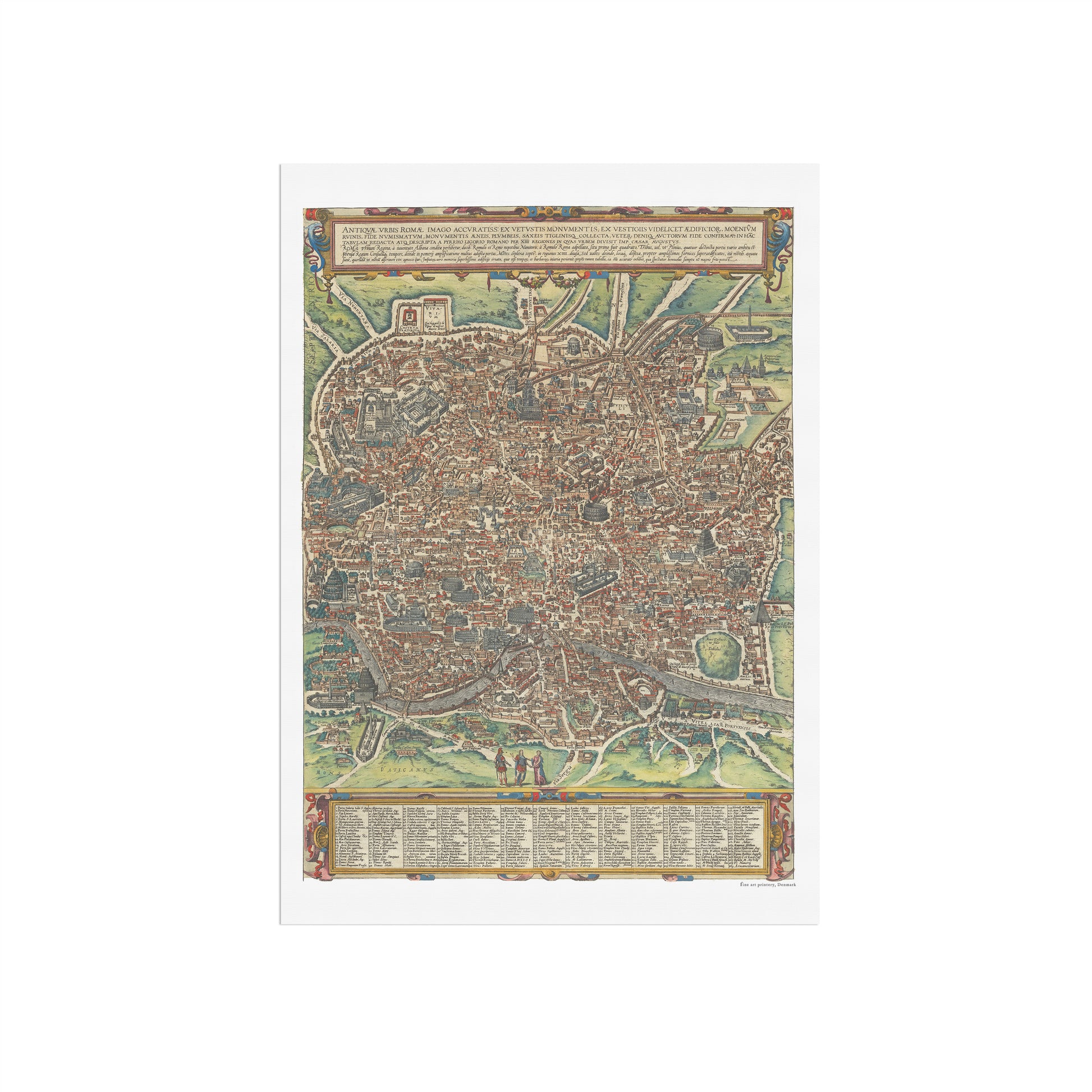 En smuk kopi af Brauns kort over Rom fra 1588. Kortet forestiller Rom i et fugleperspektiv fra vest, og indeholder de mest betydningsfulde bygninger, større akvædukter, monumenter og meget mere.