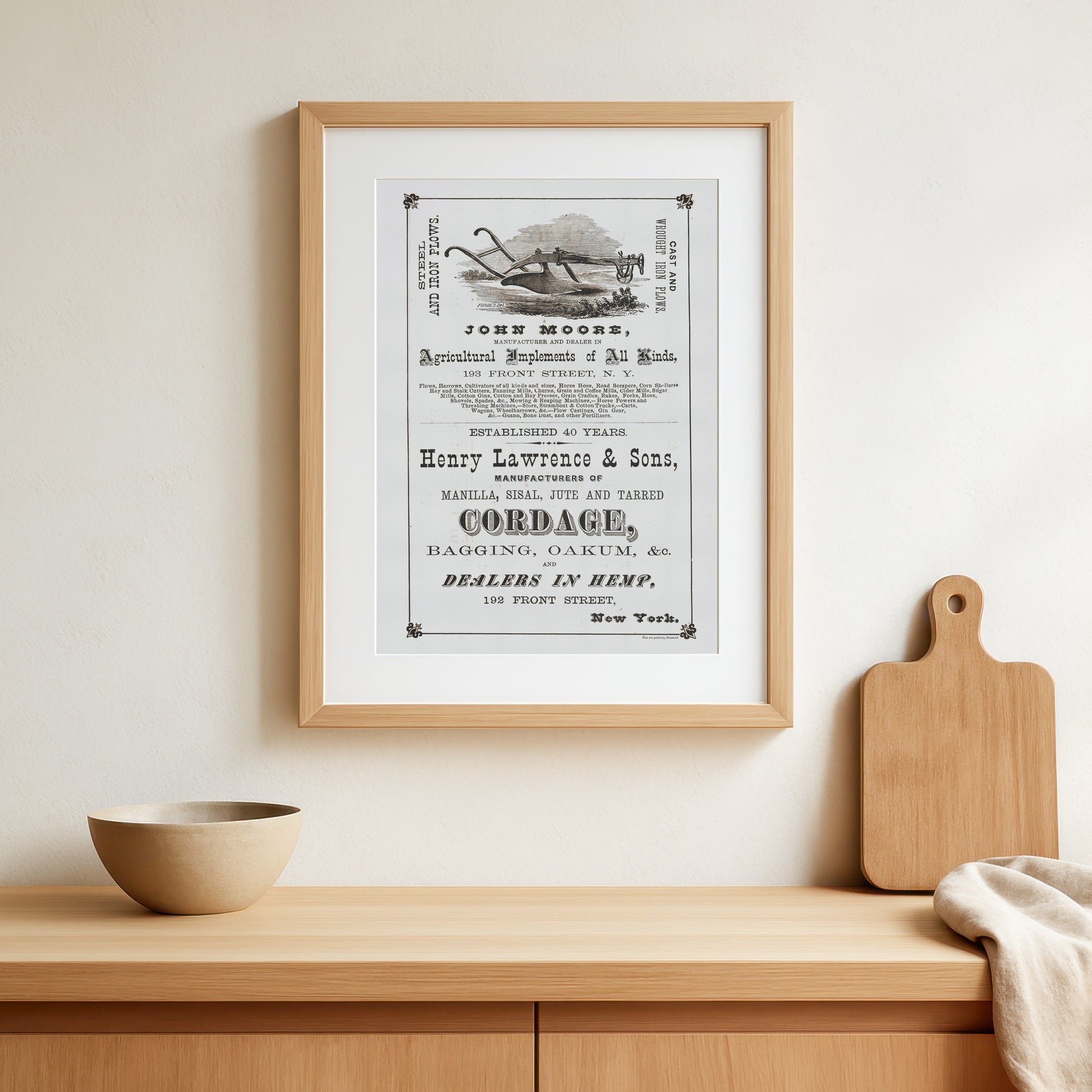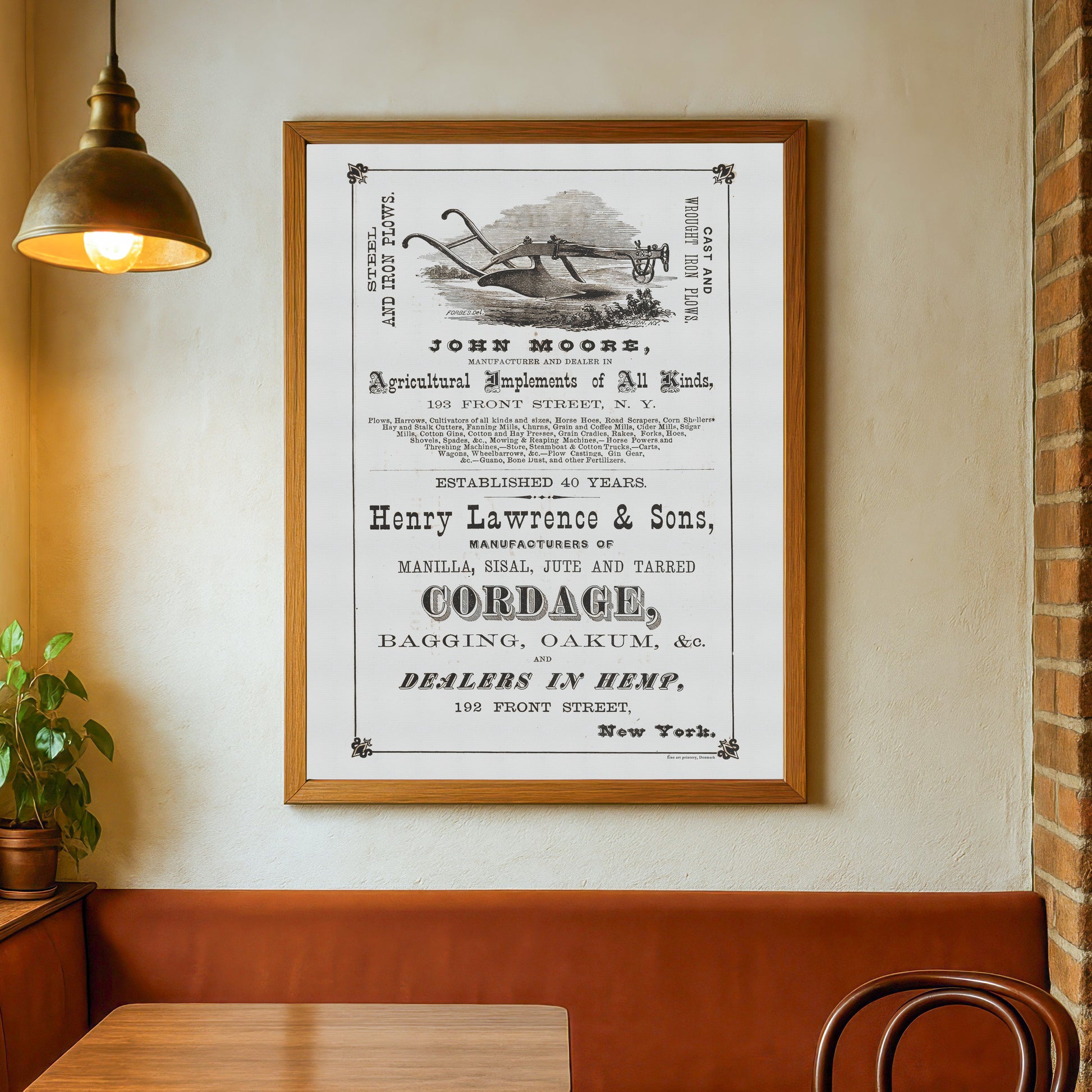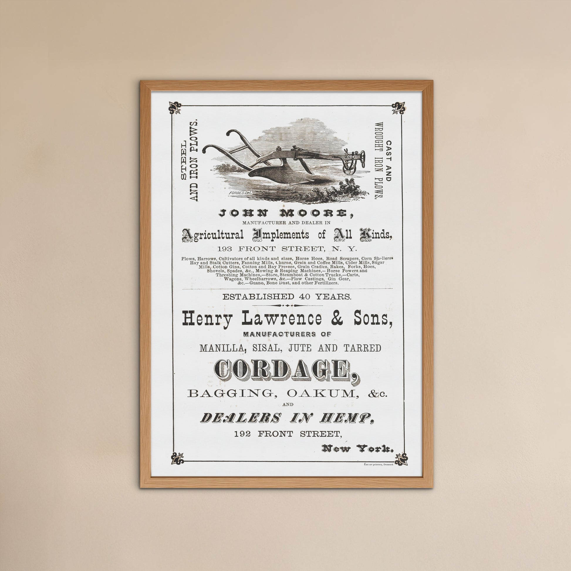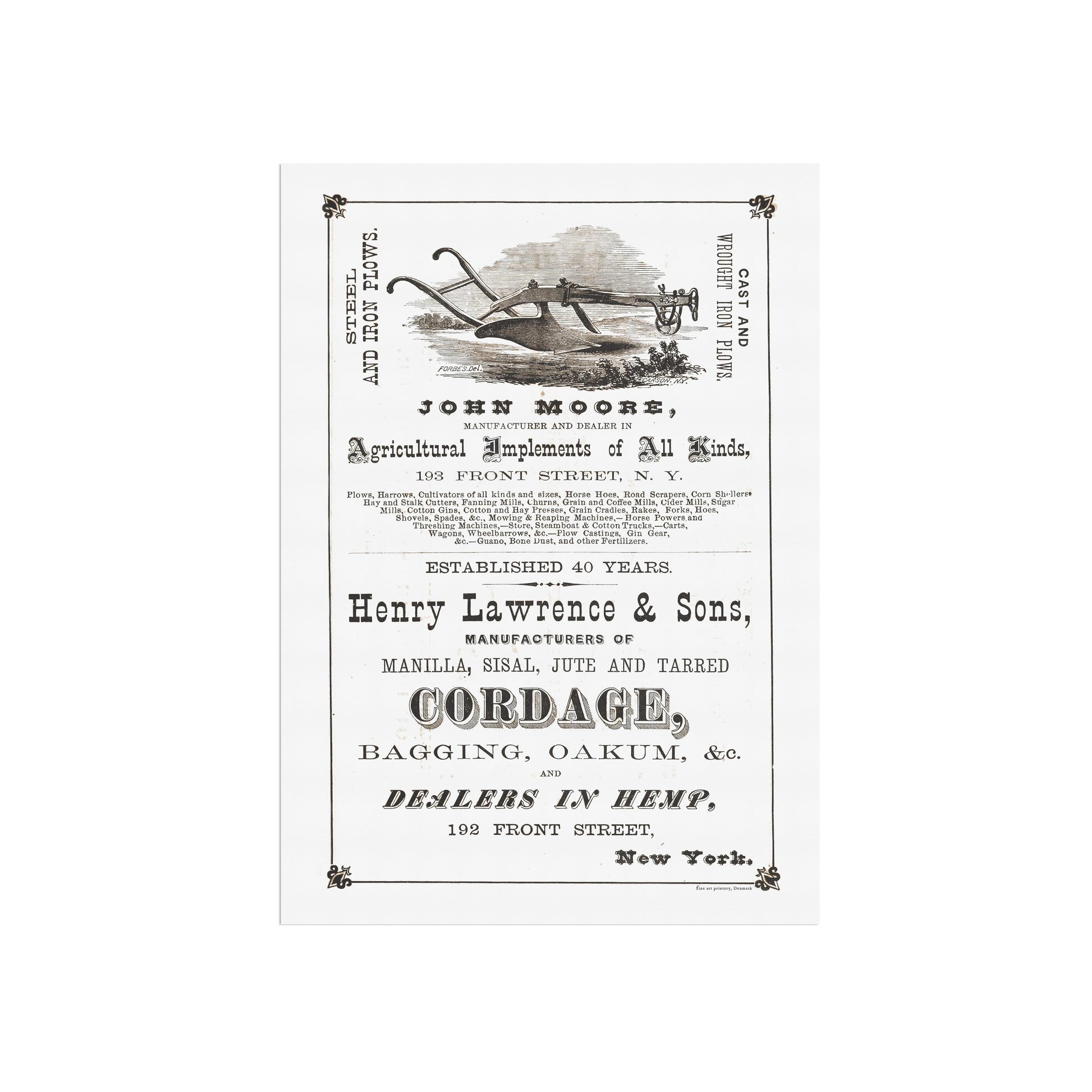 En smuk side fra det illustrerede katalog Keogh & Thorne, fra 1873, siden viser reklamer for landbrugsudstyr og værktøj. En affotografering af siden er renset og optimeret til kunne blive endnu større, så den "lille" side i kataloget, nu kan hænge på væggen som en større plakat.