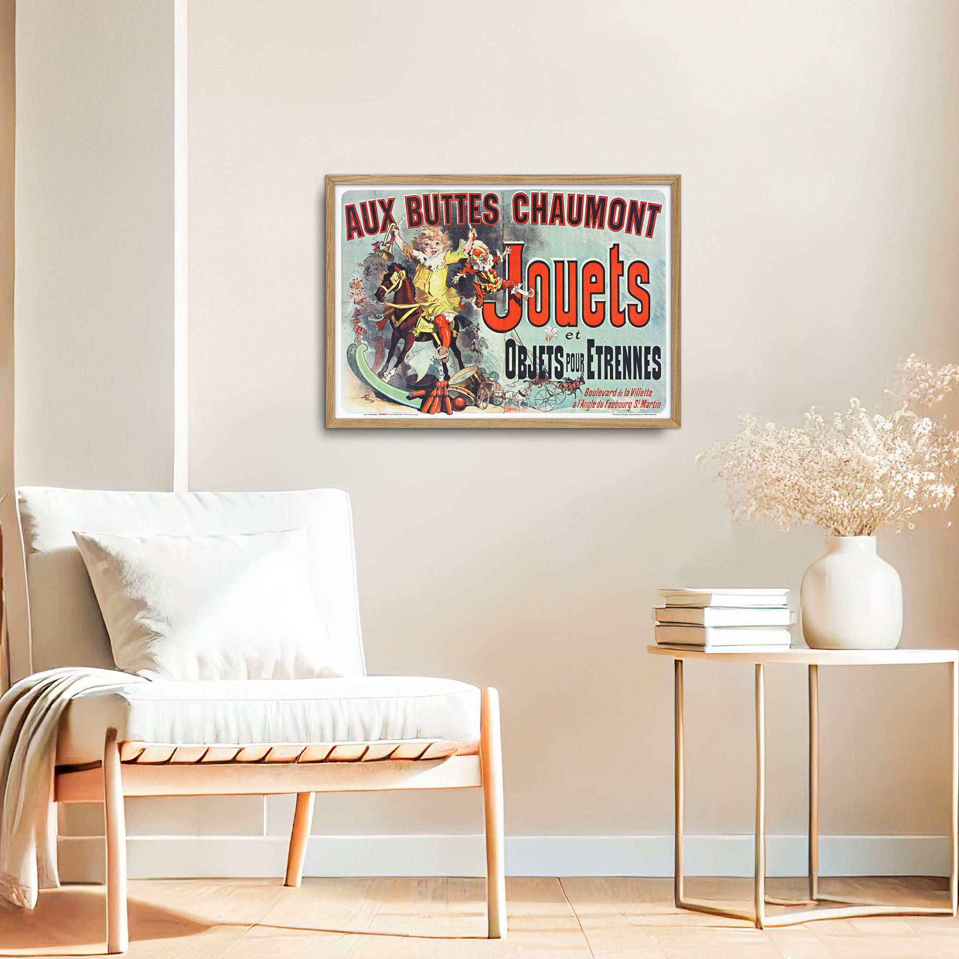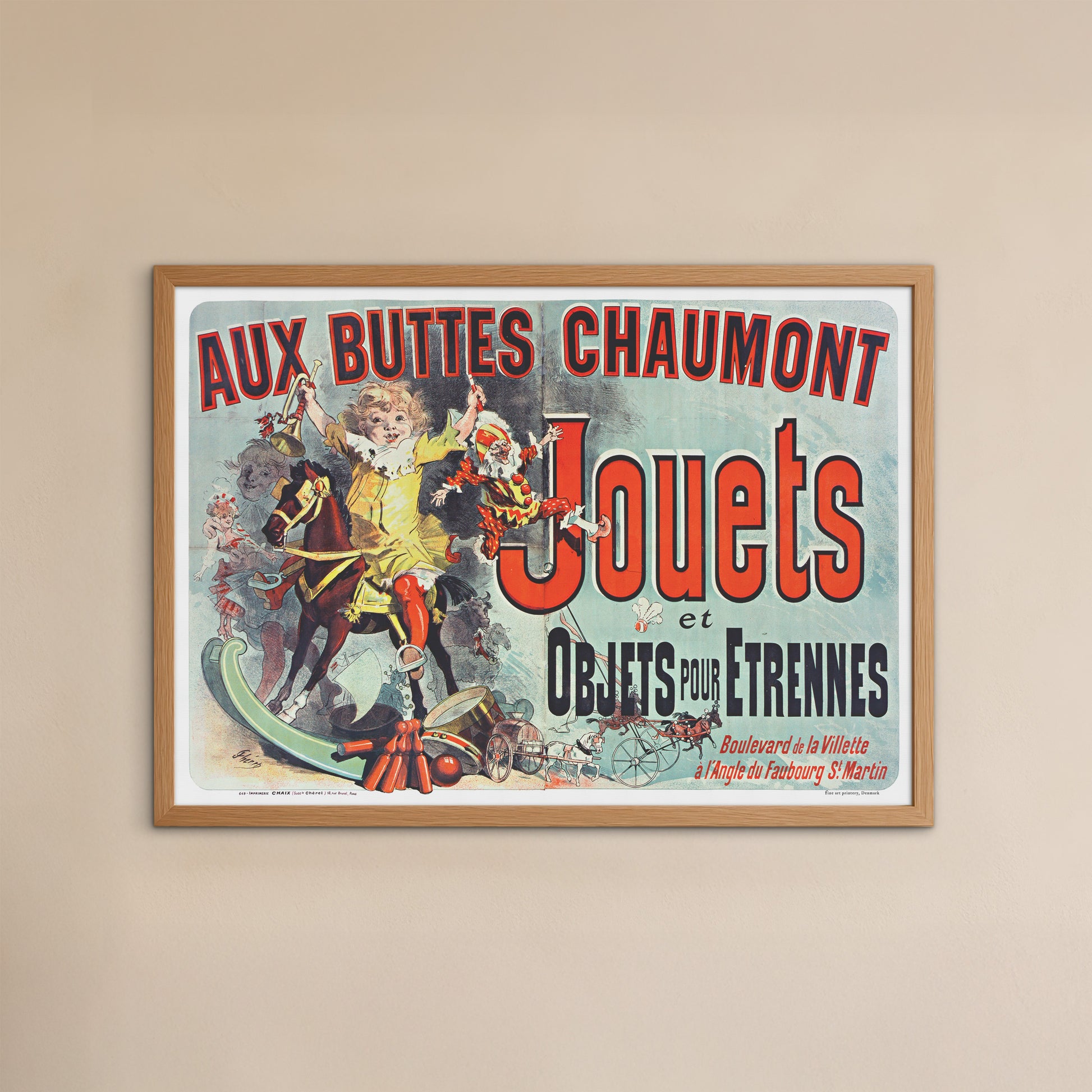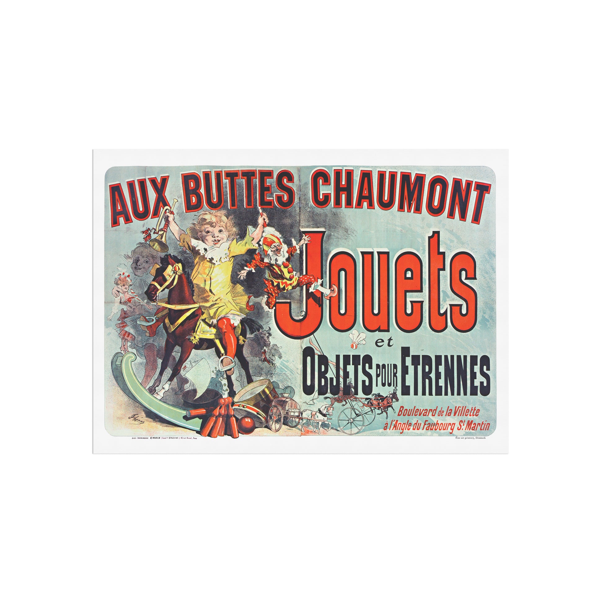 Plakaten der var en reklame for legetøjsproducenten, Aux Buttes Chaumont: jouets et objets pour étrennes, blev oprindeligt lavet i 1885 af Jules Chéret.
