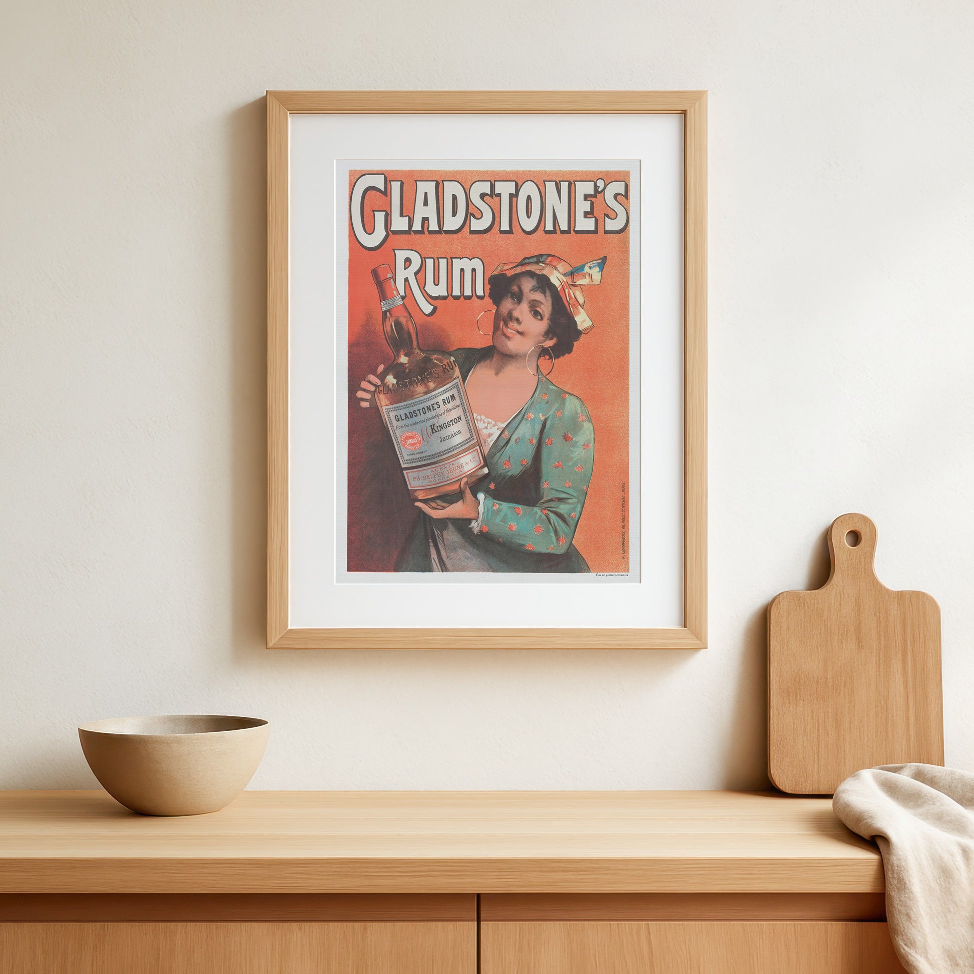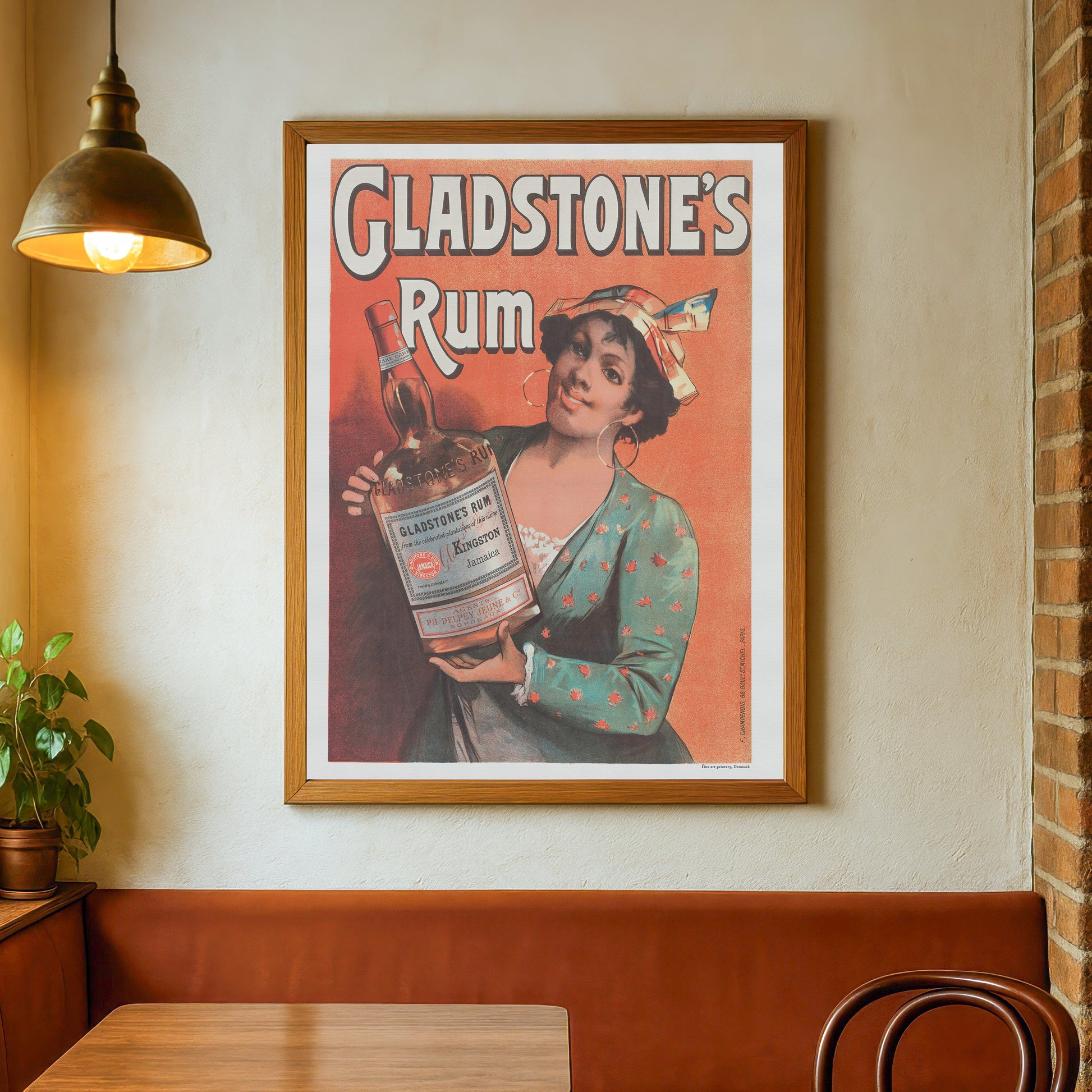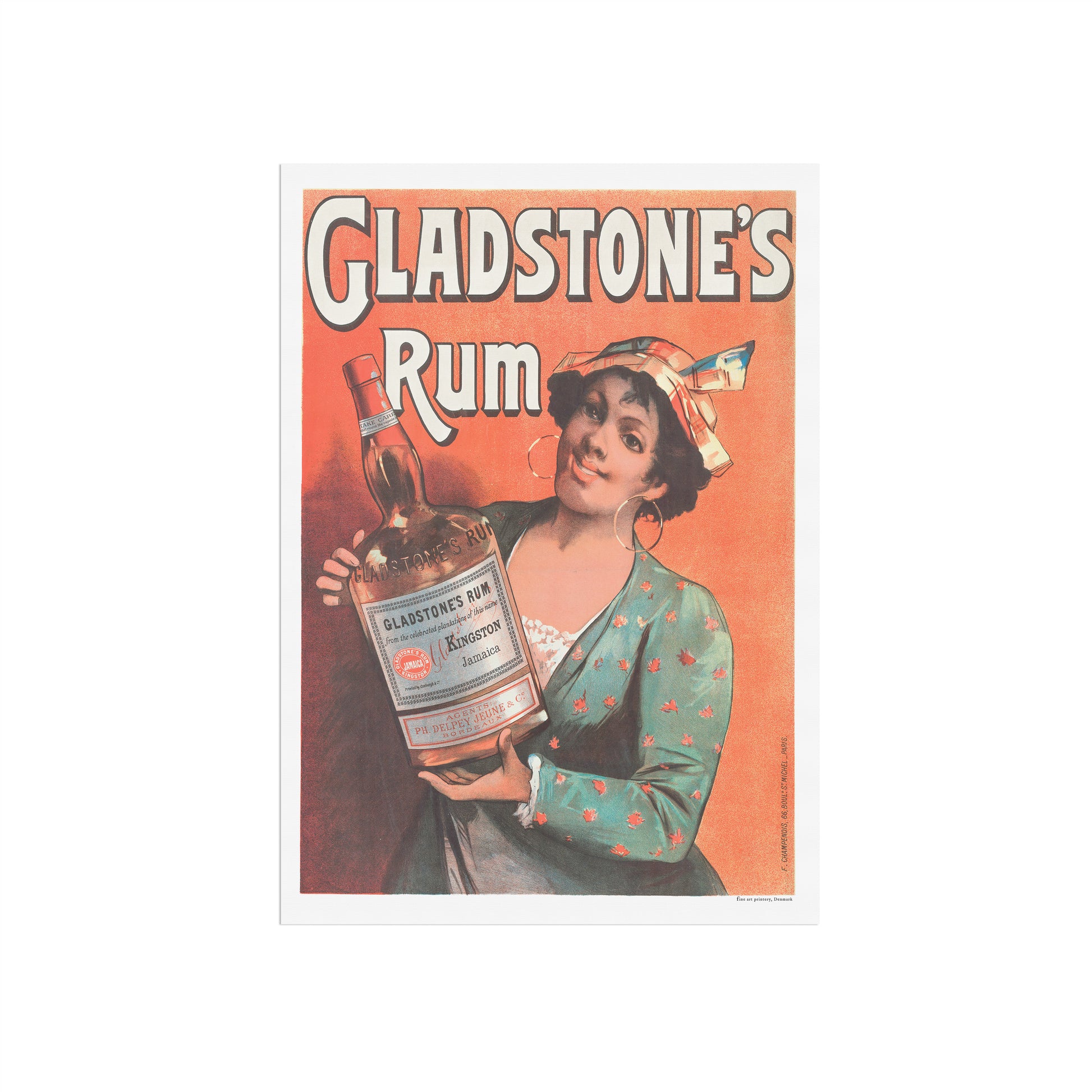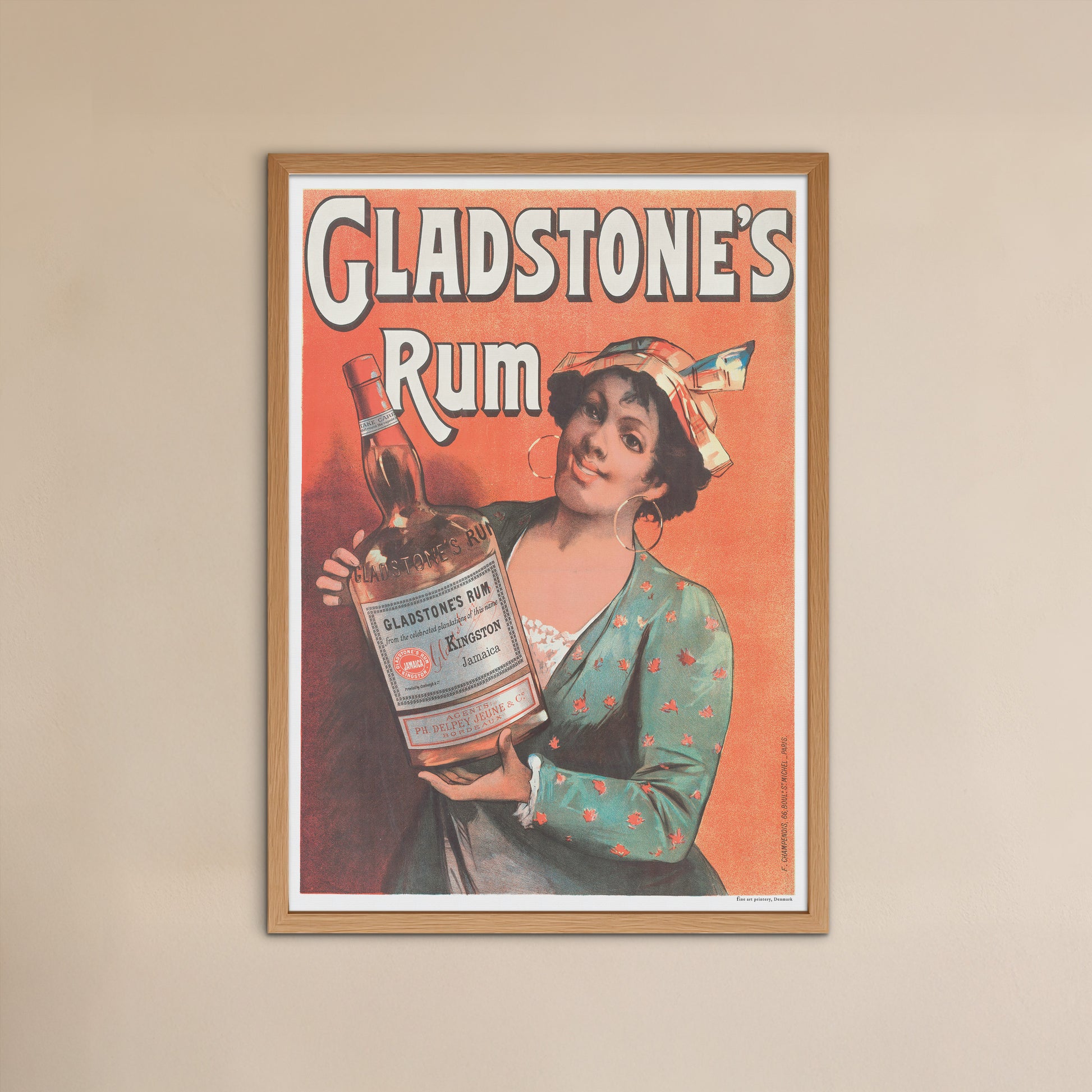 Gladstones Jamaican Rum reklameplakat fra 1893 er et visuelt stykke i sin egen klasse, frem for at have fokus på Jamaicas forbløffende egne, så holder den baggrunden ensfarvet, og fokusere på at fange essensen af rommen. Den simple men sigende illustration, viser en Vestindisk kvinde der holder en stor flaske rom i sine hænder. Plakaten her viser altså, modsat mange andre plakater fra samme periode, udelukkende kun lige det mest nødvendige for at få sit budskab ud.