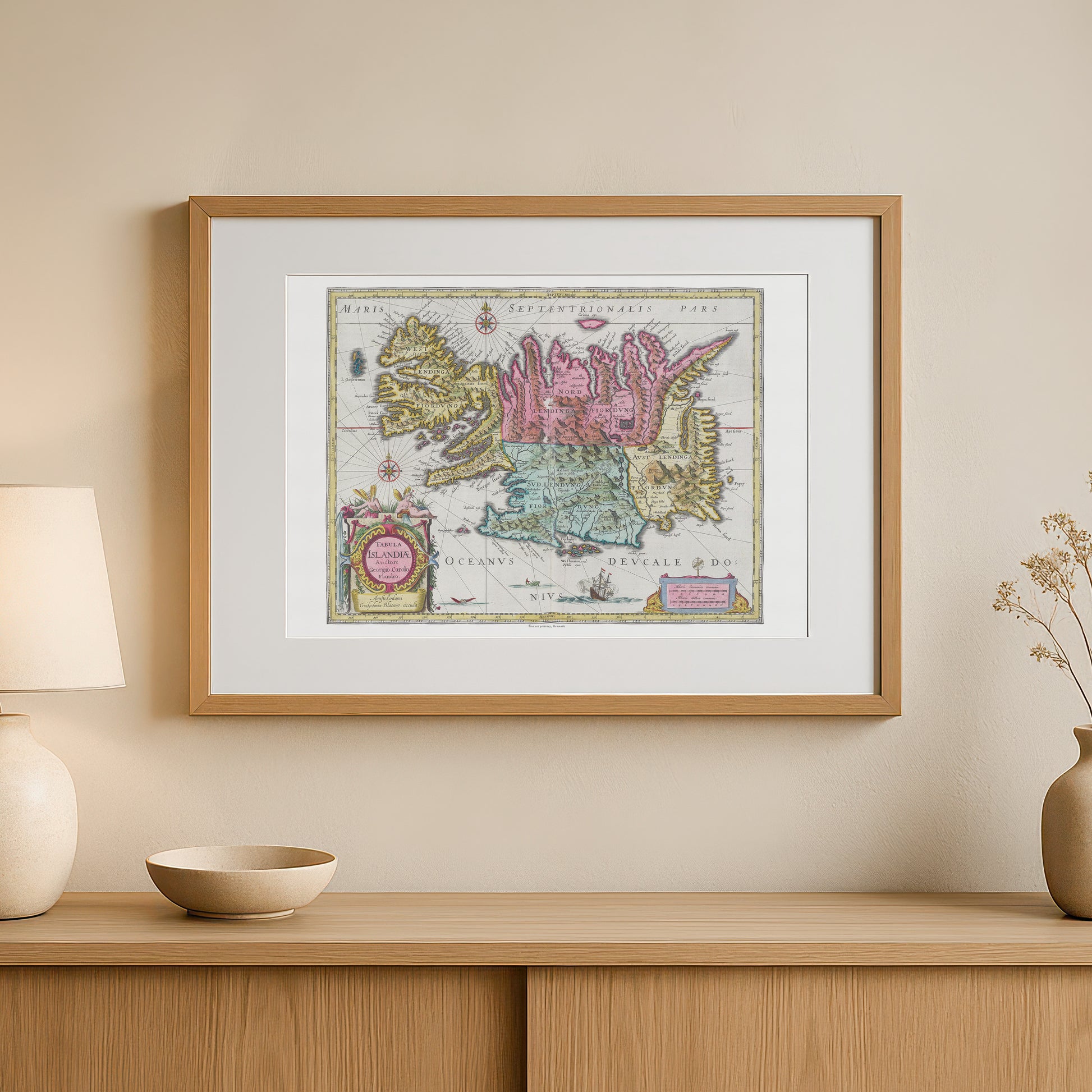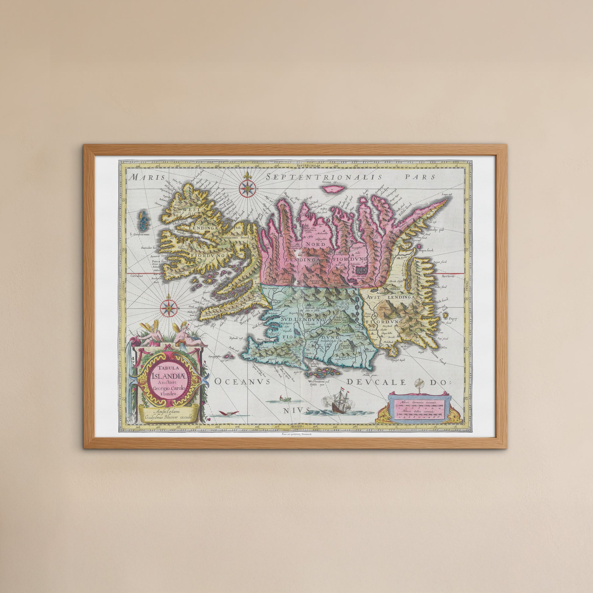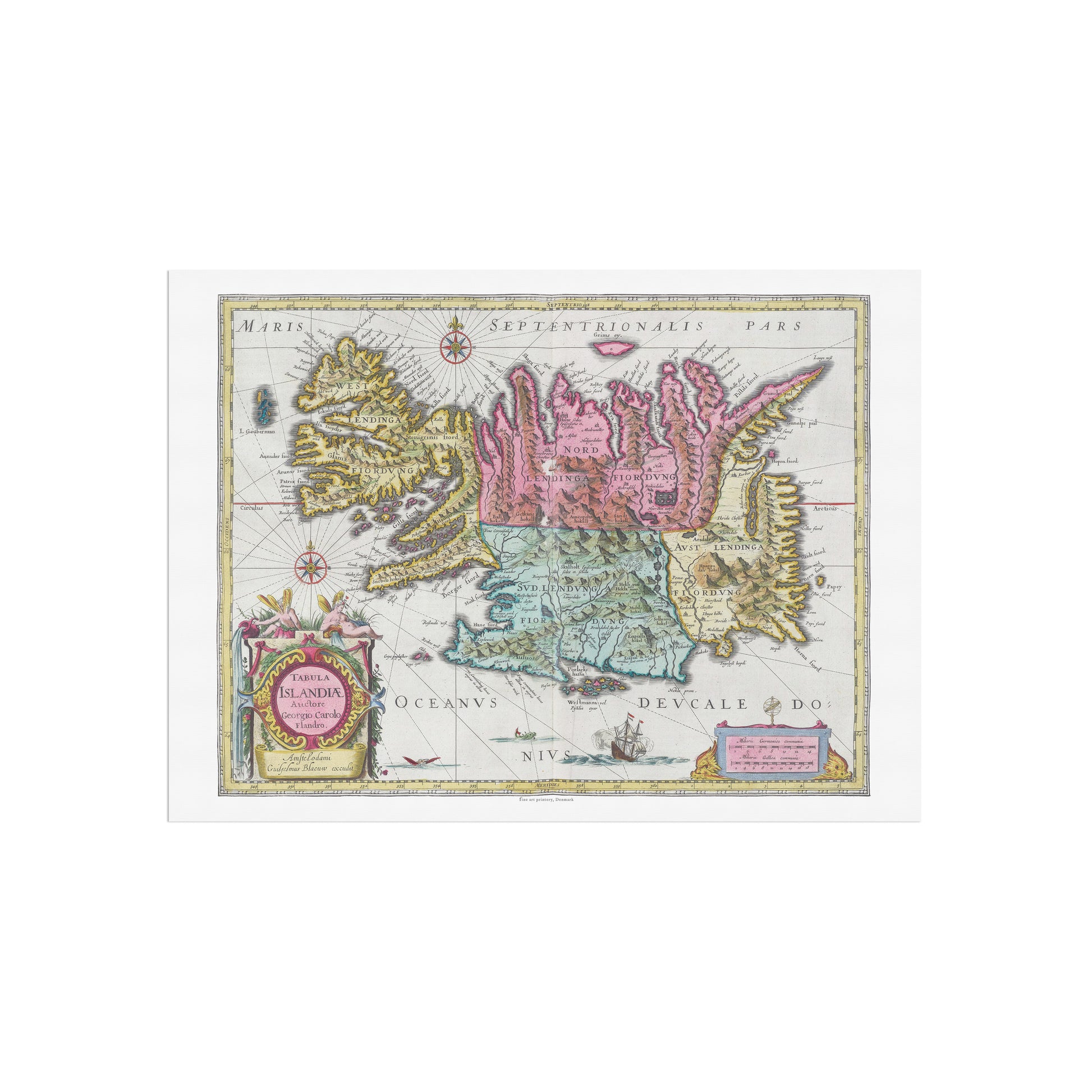 Oplev Islands vilde og mystiske natur gennem et af historiens mest ikoniske kort. Plakaten "Tabula Islandiæ" er en fantastisk reproduktion af et håndfarvet kort af den legendariske kartograf Joan Blaeu, oprindeligt udgivet i hans Atlas Maior fra 1665.