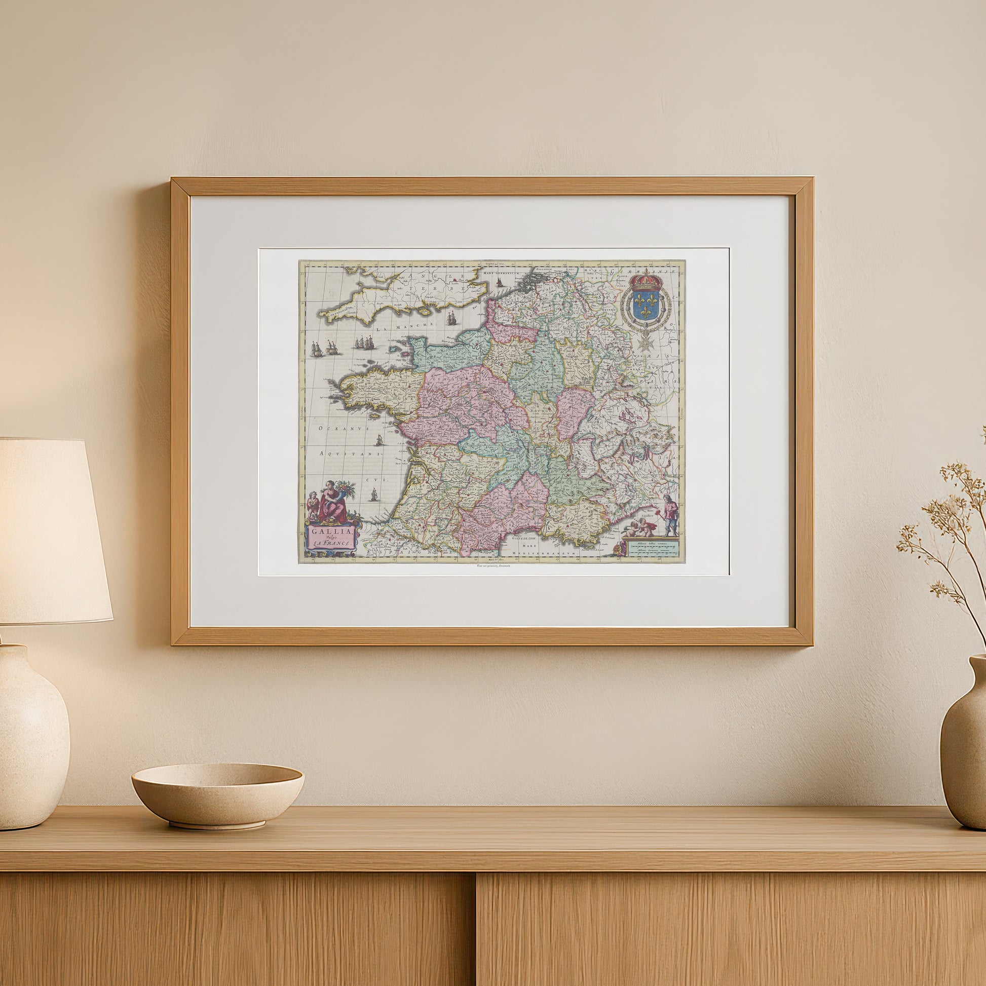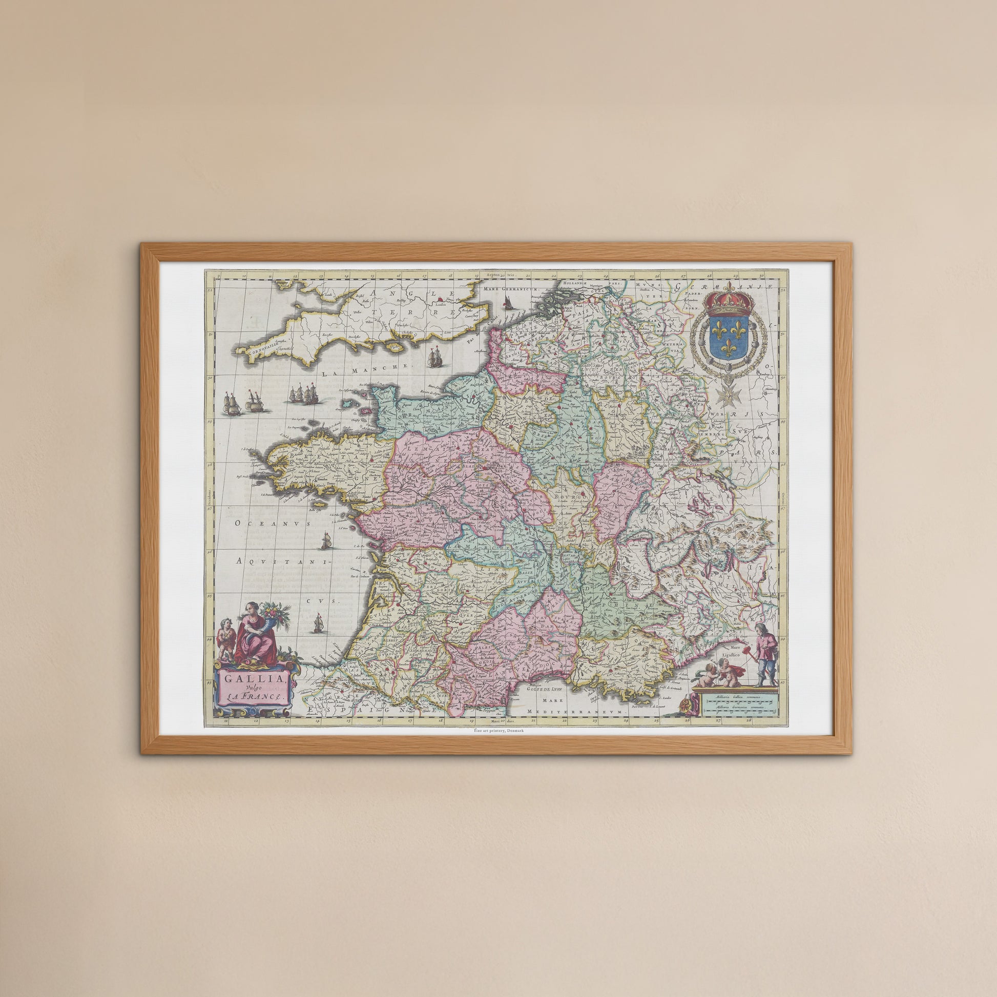 Plakaten er en detaljeret reproduktion af det oprindelige håndfarvede kort, der viser Frankrigs regioner, floder og større byer. Hver region er farvet med fine pastelfarver, hvilket giver kortet en blød og elegant æstetik. Langs kanterne finder du smukke, allegoriske figurer og udsmykkede kartoucher, der symboliserer Frankrigs storhed, herunder det franske kongevåben. Motivet afspejler den historiske fascination af udforskning og den visuelle skønhed, som var kendetegnende for den hollandske guldalder.