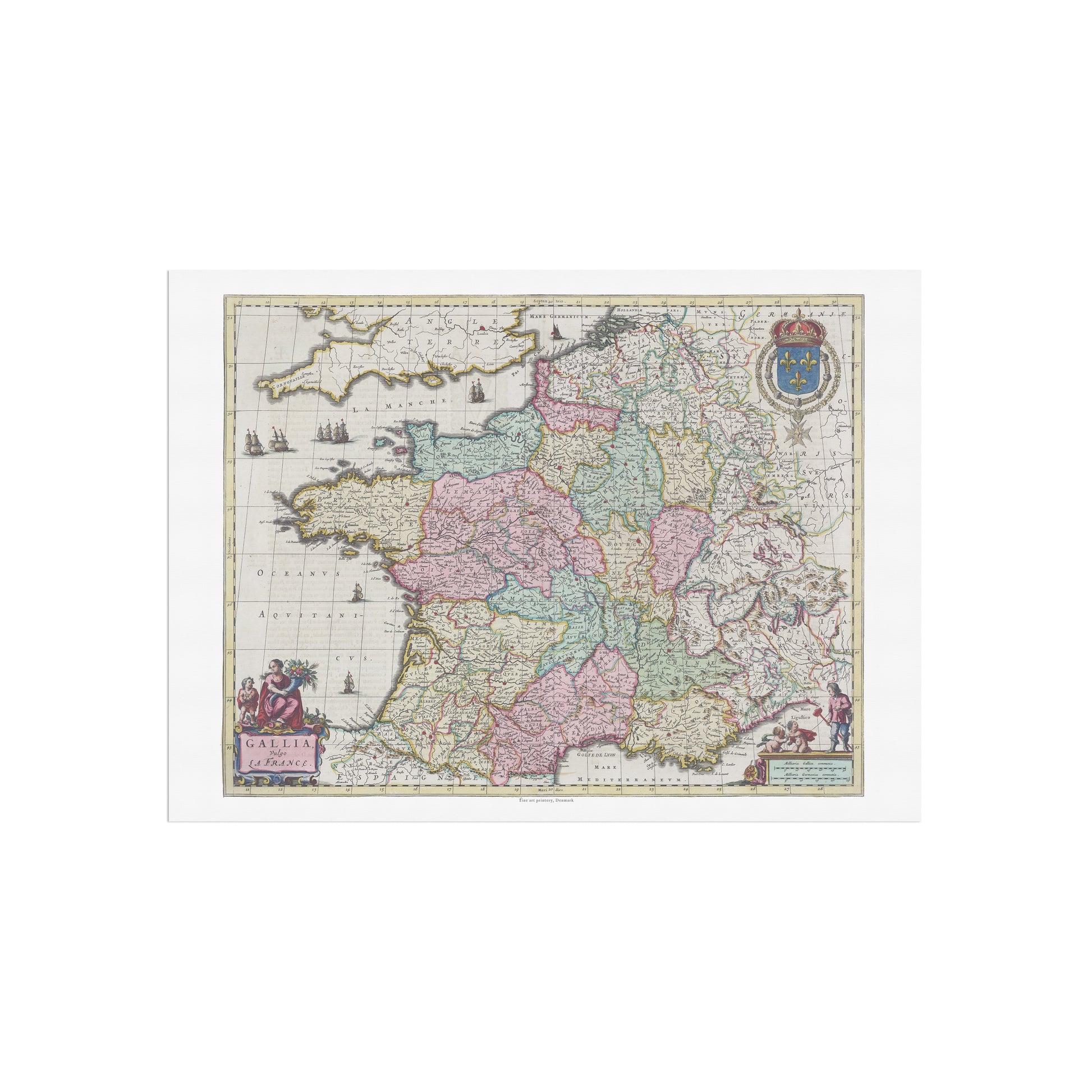 Bring en bid af fransk historie og et mesterværk inden for kartografi ind i dit hjem med dette elegante kort over Frankrig. "Gallia Vulgo La France" er et af de mest ikoniske kort fra Joan Blaeu's berømte Atlas Maior, udgivet i Amsterdam i 1662. Dette kort er ikke kun en præcis geografisk afbildning af Frankrig; det er et udsøgt kunstværk, der fanger ånden i det 17. århundrede.