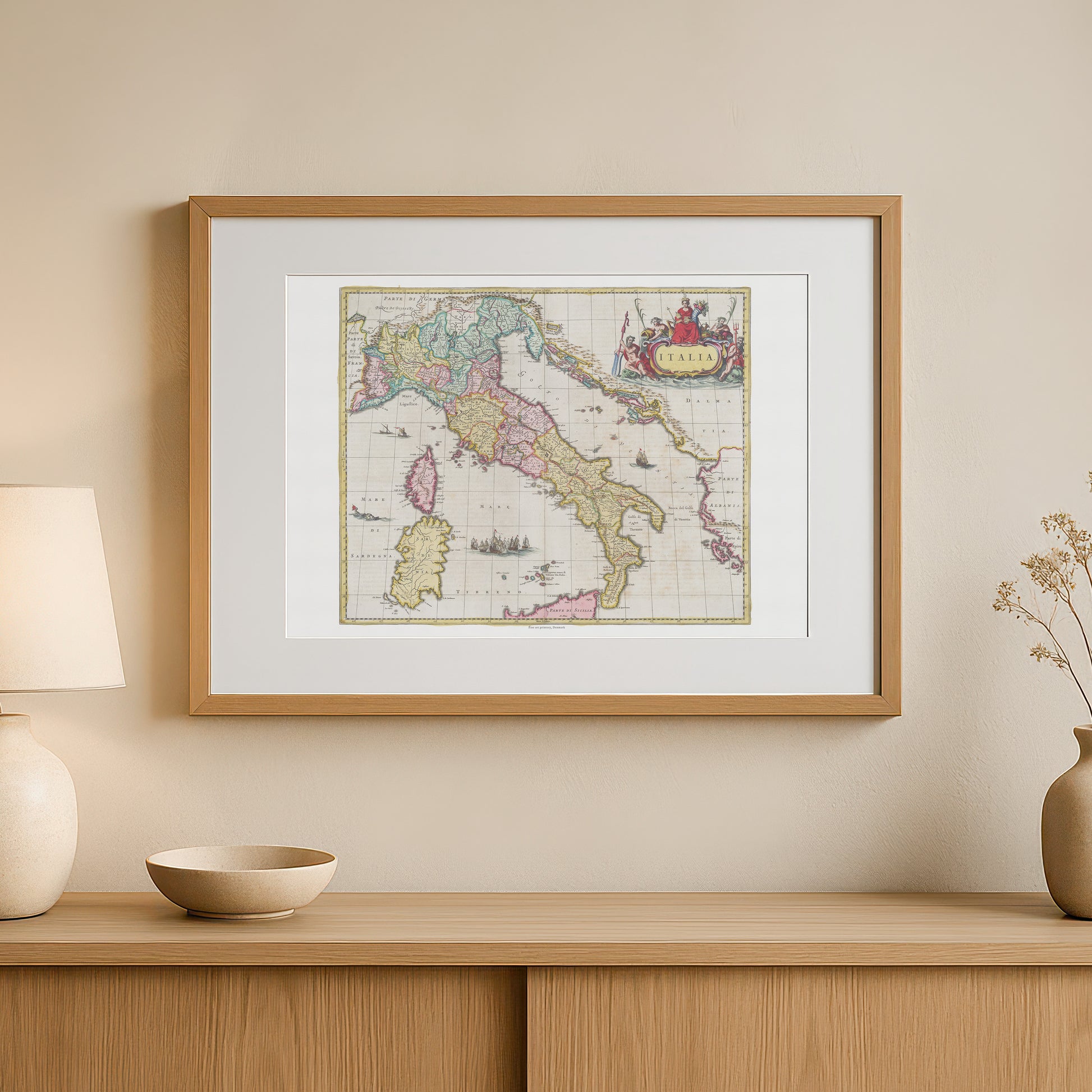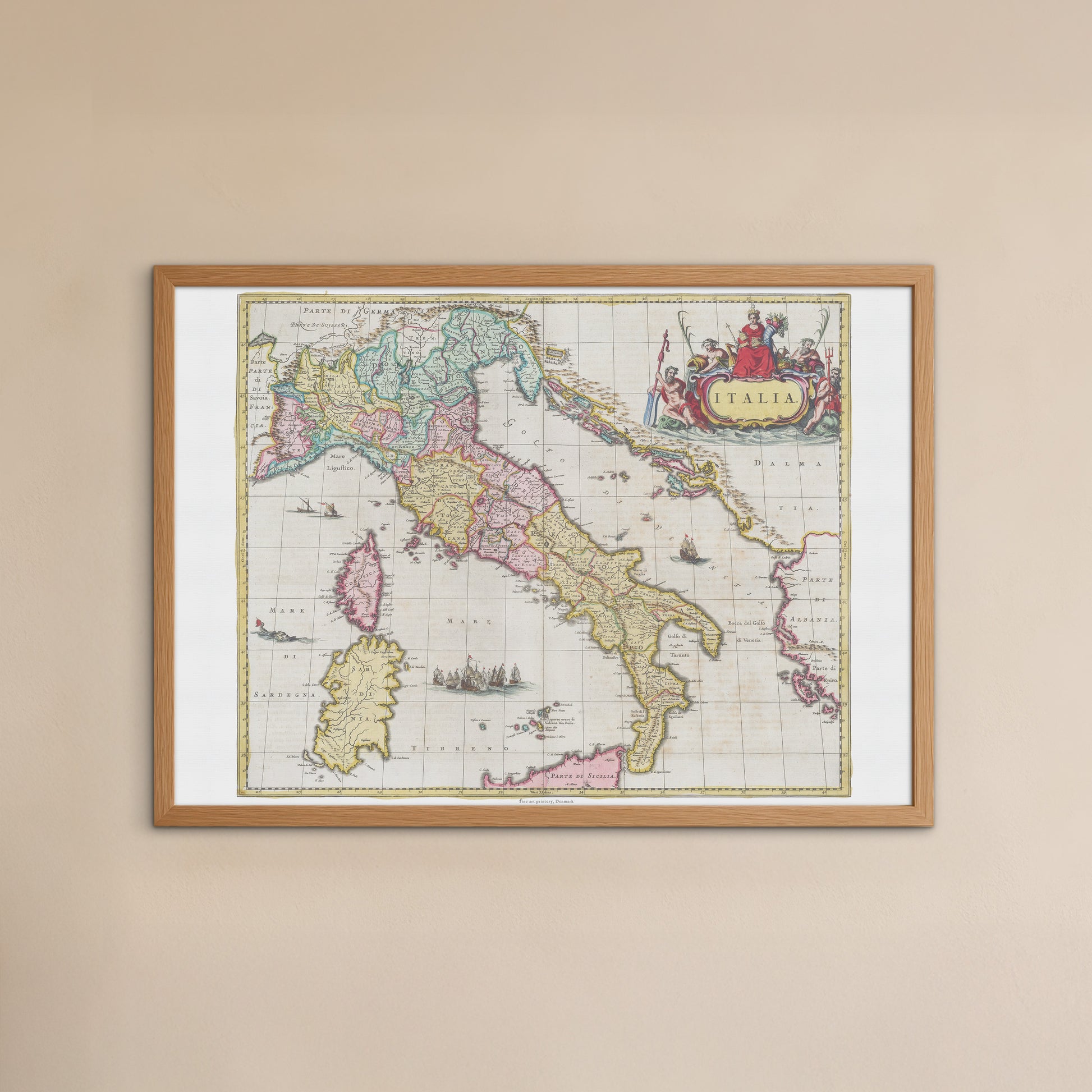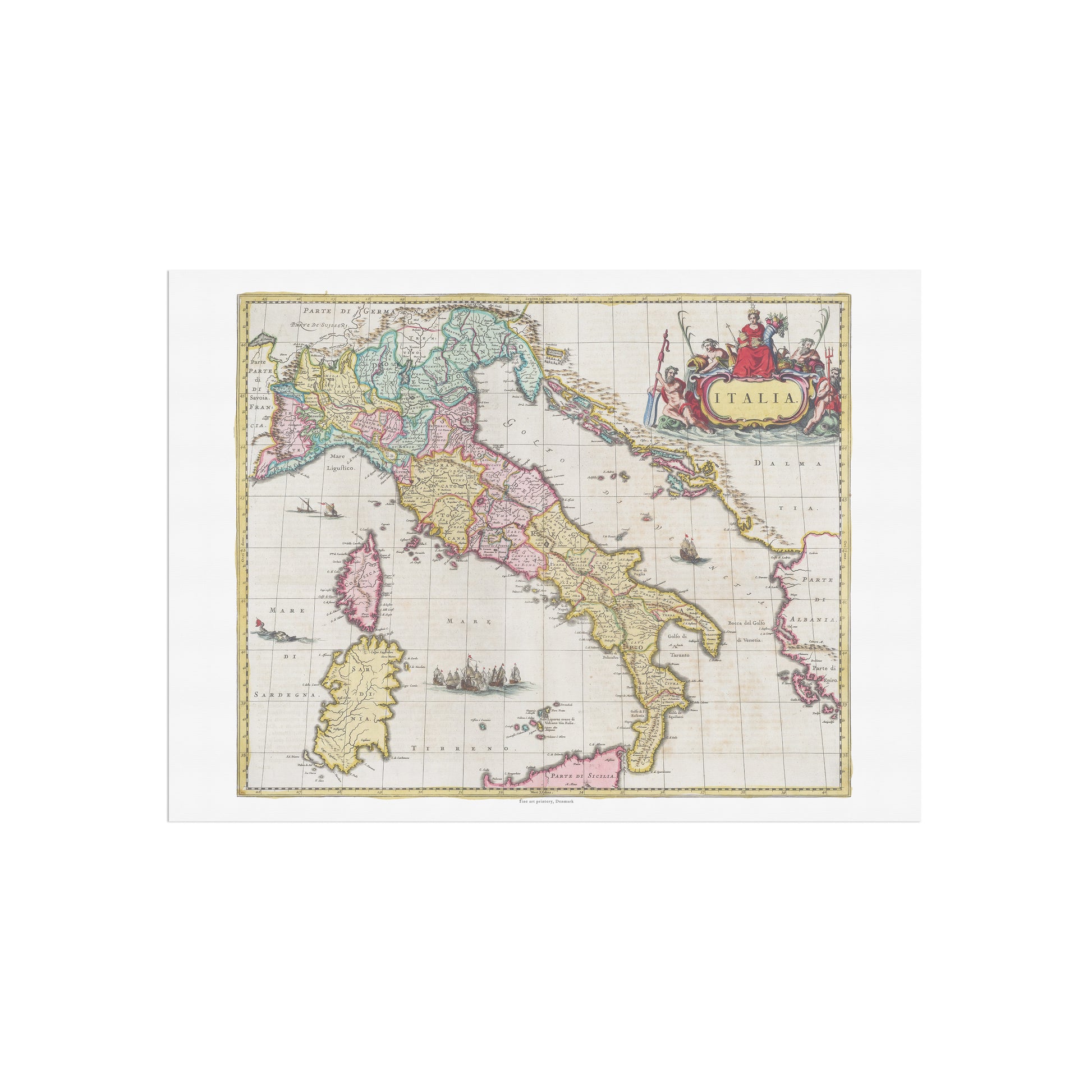 Dette kort giver et fascinerende indblik i, hvordan den italienske halvø så ud i en tid med stor kulturel og politisk betydning. Kortet viser med imponerende præcision alle regionerne, fra Alperne i nord til Sicilien i syd. Det er et mesterværk, der kombinerer videnskabelig nøjagtighed med en enestående kunstnerisk stil. Kortet er rigt dekoreret med smukke, udsmykkede elementer, herunder en elegant kartouche med titlen "Italia" og allegoriske figurer, der symboliserer havets magt og rigdom. Farverne er fine og sarte, hvilket giver kortet en både elegant og historisk korrekt æstetik.