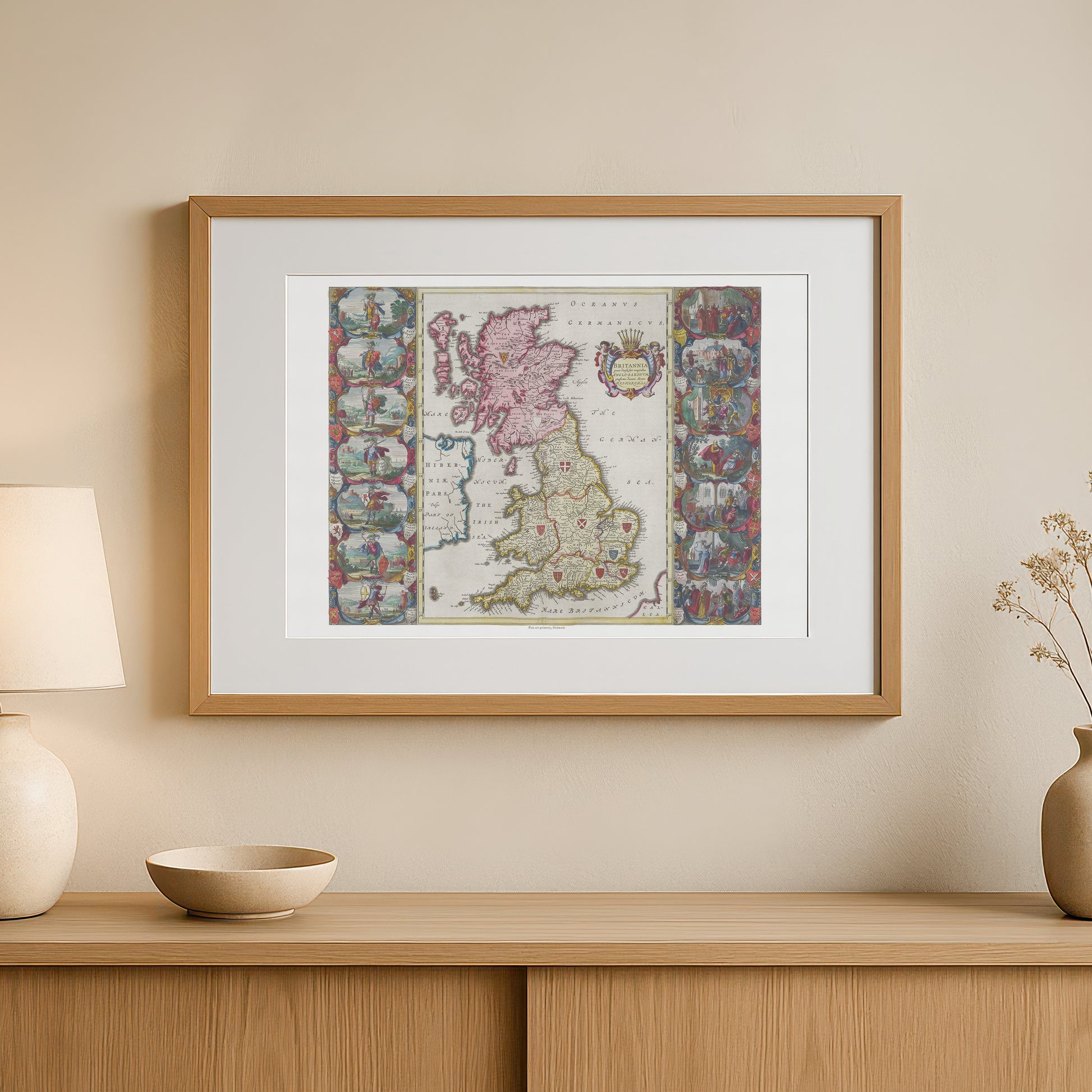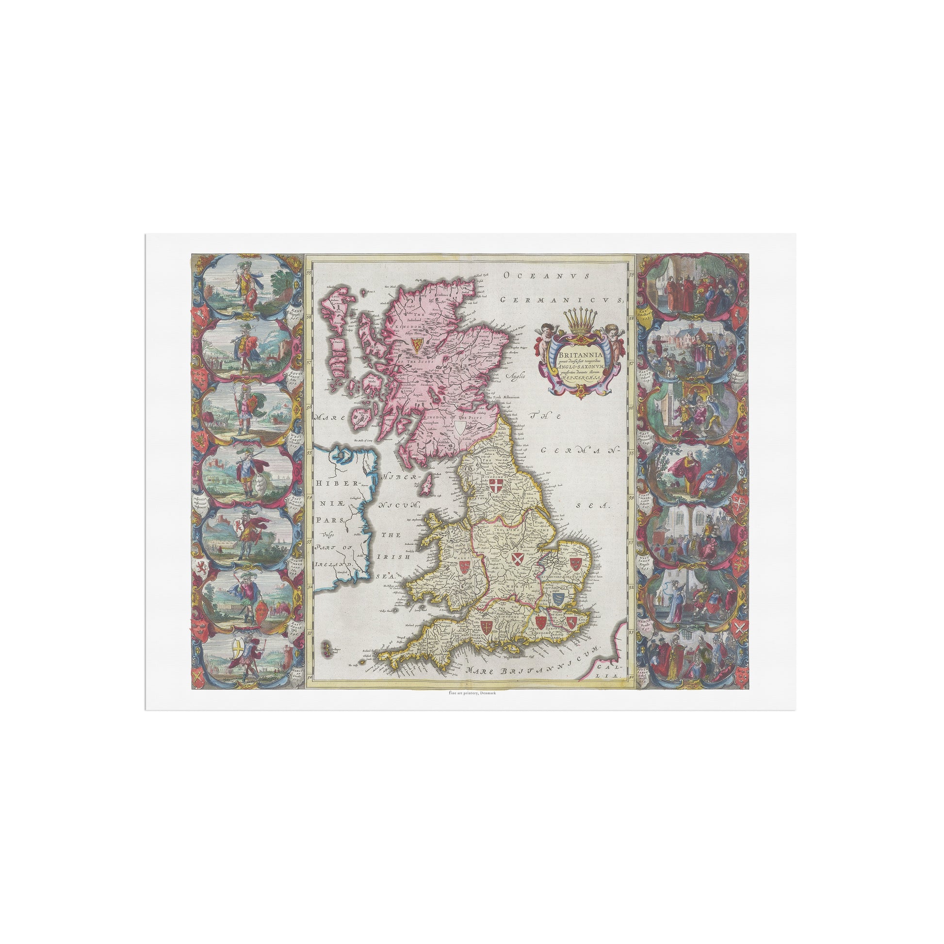 Dyk ned i den tidlige britiske historie med dette enestående kort over Storbritannien, som det så ud i angelsaksisk tid. Plakaten "Britannia prout divisa fuit temporibus Anglo-Saxonum" er en trofast reproduktion af et håndfarvet kort af den anerkendte kartograf Joan Blaeu, oprindeligt udgivet i hans monumentale værk, Atlas Maior, i 1665.
