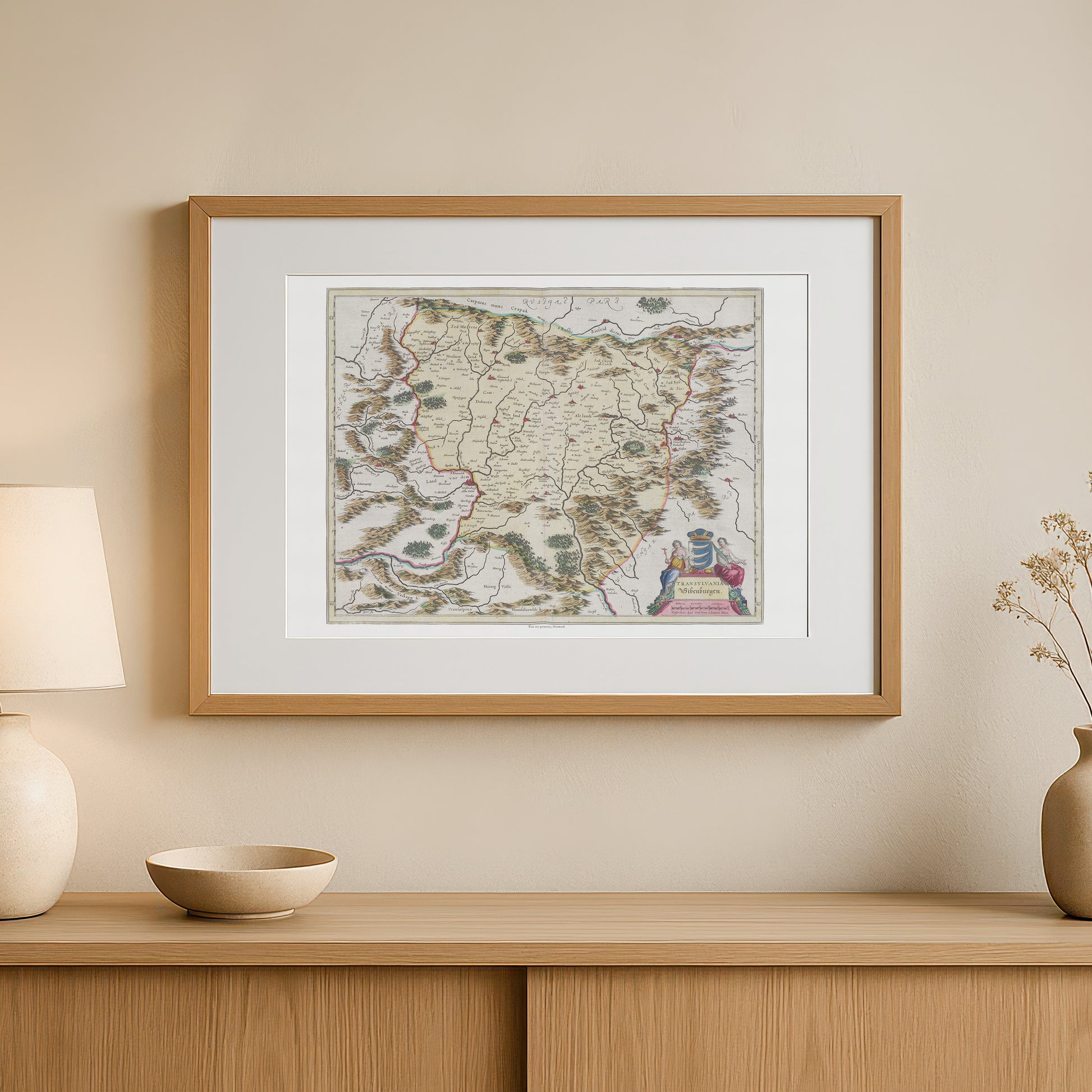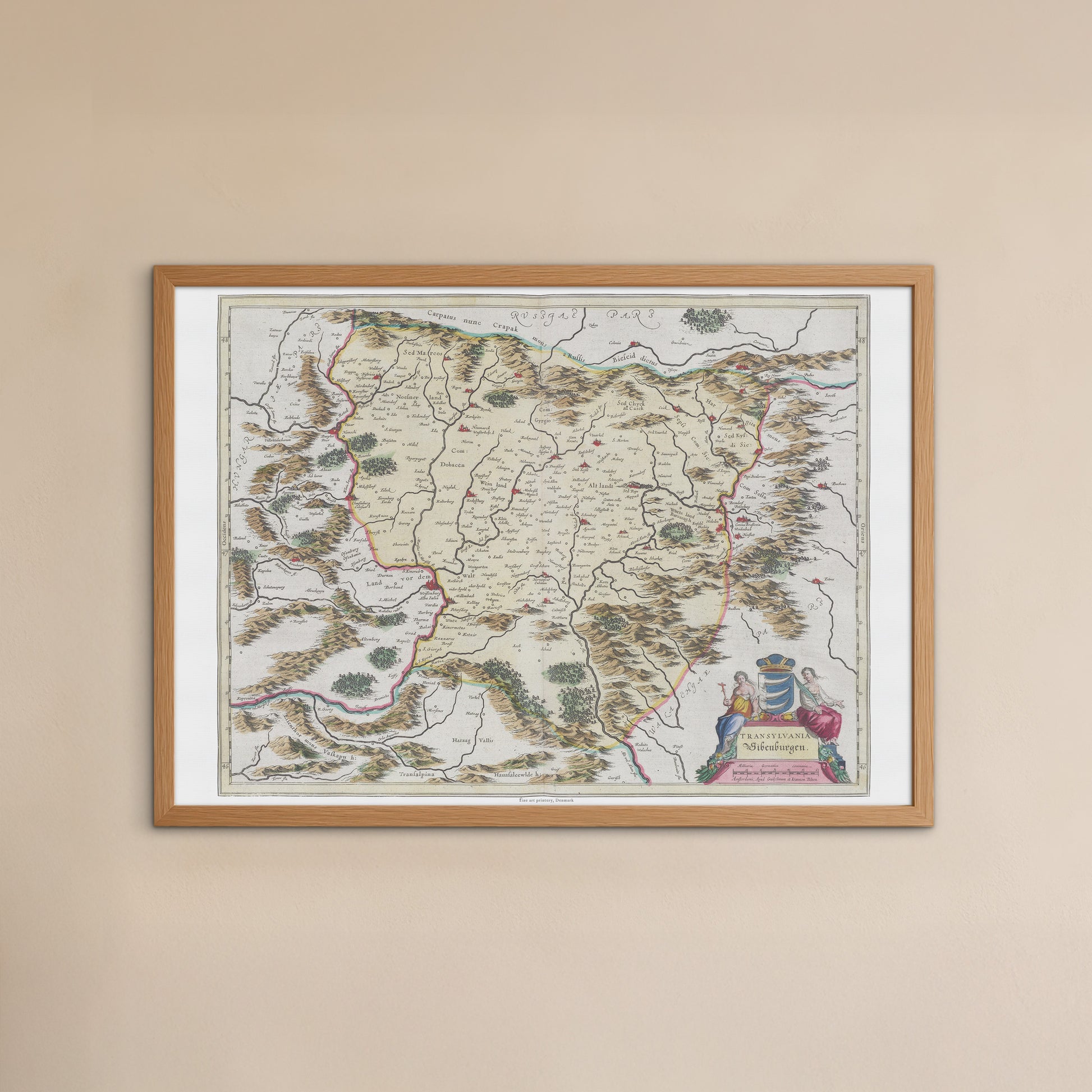 Kortet giver et unikt indblik i, hvordan Transylvanien (i dag en del af Rumænien) så ud i det 17. århundrede. Det viser de dramatiske bjerglandskaber og de tætte skove, som regionen er kendt for, samt de mange byer og floder. Kortets detaljerede geografi er suppleret med en smuk, allegorisk kartouche, der fremhæver regionens historiske betydning og tilføjer et kunstnerisk præg. De sarte farver og fine linjer vidner om den høje standard for kartografi i den hollandske guldalder.