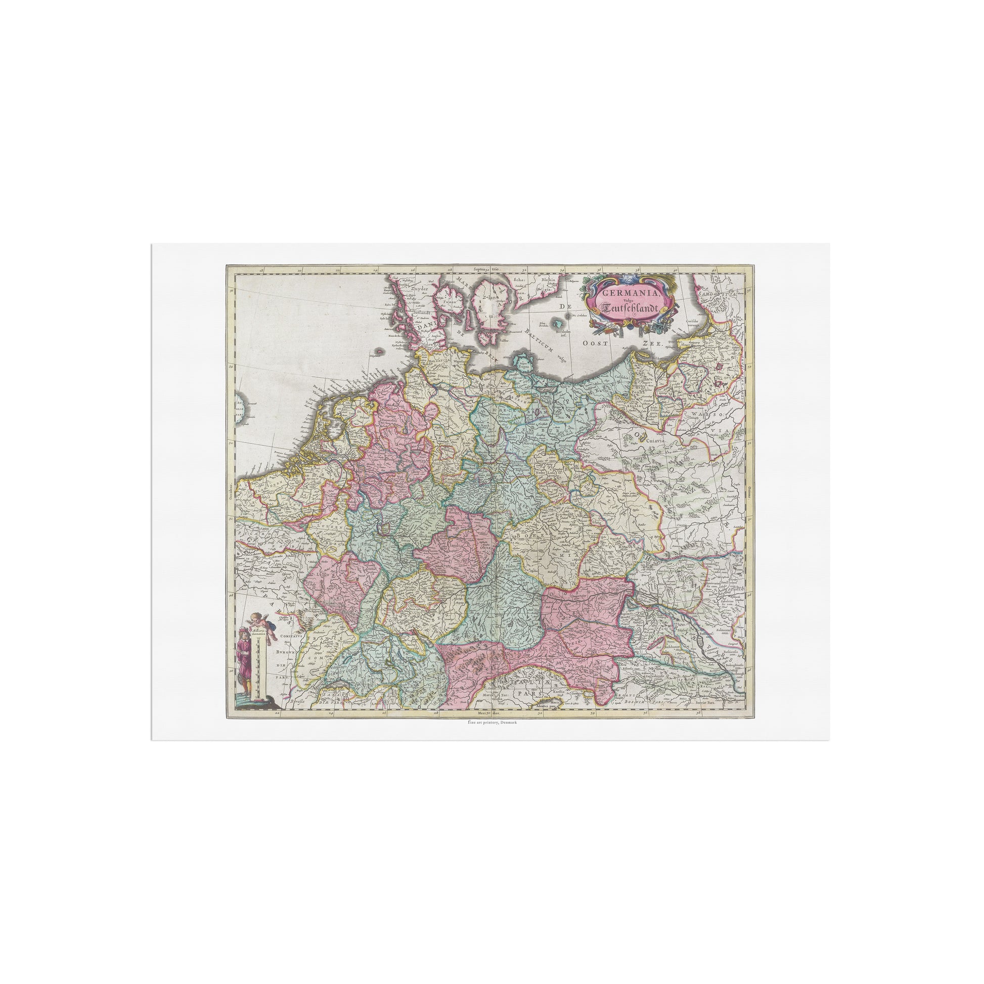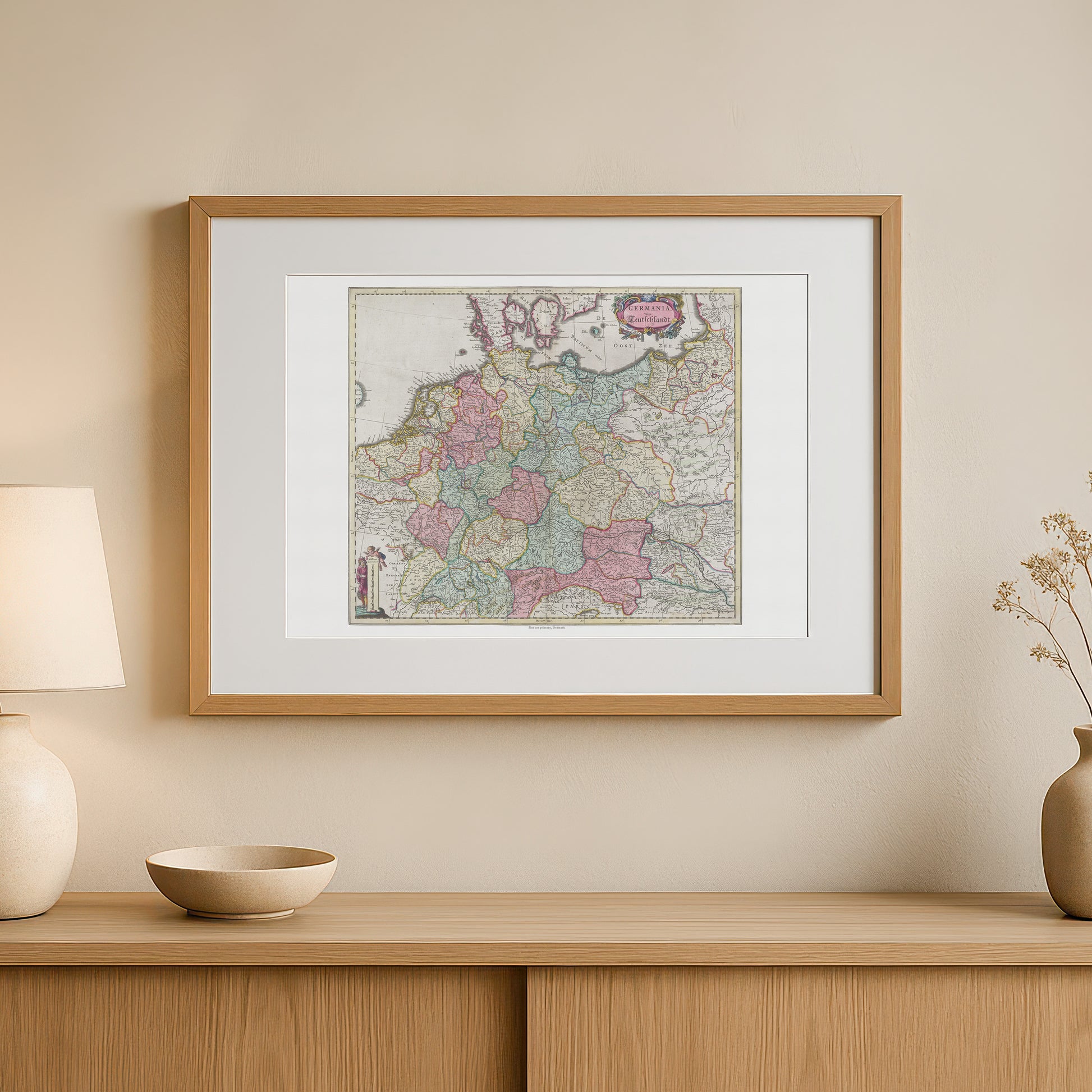 Dette kort giver et fascinerende indblik i, hvordan det tyske område, dengang det Tysk-romerske Rige, så ud i en tid med stor forandring. Kortet er kendetegnet ved fine detaljer, der viser de mange fyrstedømmer og regioner, som udgjorde det centrale Europa på det tidspunkt. Det er rigt dekoreret med smukke, udsmykkede kartoucher med tidens våbenskjolde og en titelramme, der understreger kortets historiske og politiske betydning. Hver region er farvet med fine pastelfarver, hvilket giver kortet en både elegant og historisk korrekt æstetik.