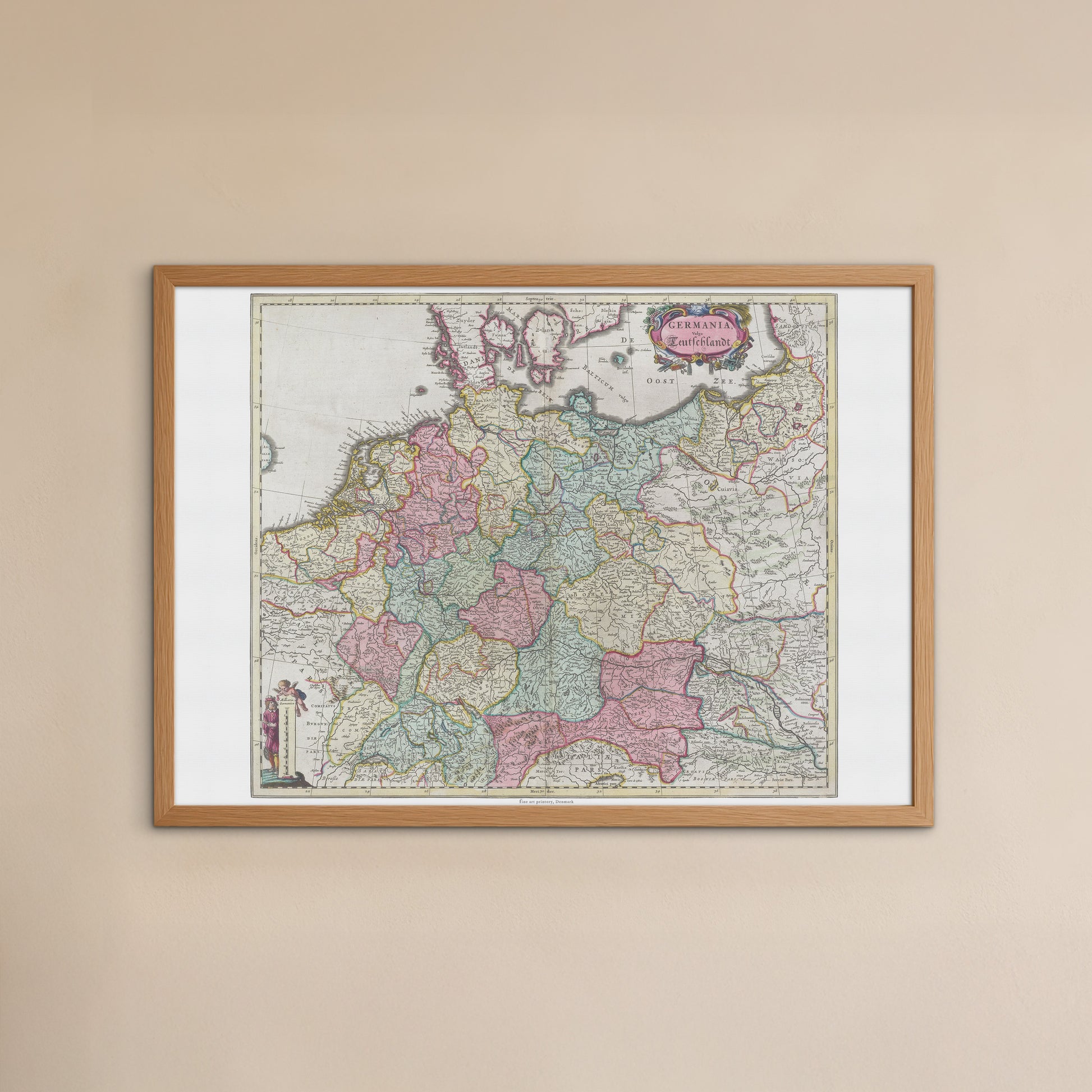 Oplev et stykke tysk historie med dette smukke og detaljerede kort over Tyskland fra det 17. århundrede. Plakaten "Germania Vulgo Teutschlandt" er en trofast reproduktion af et håndfarvet kort af den anerkendte kartograf Joan Blaeu, oprindeligt udgivet i hans monumentale værk, Atlas Maior, i 1665.