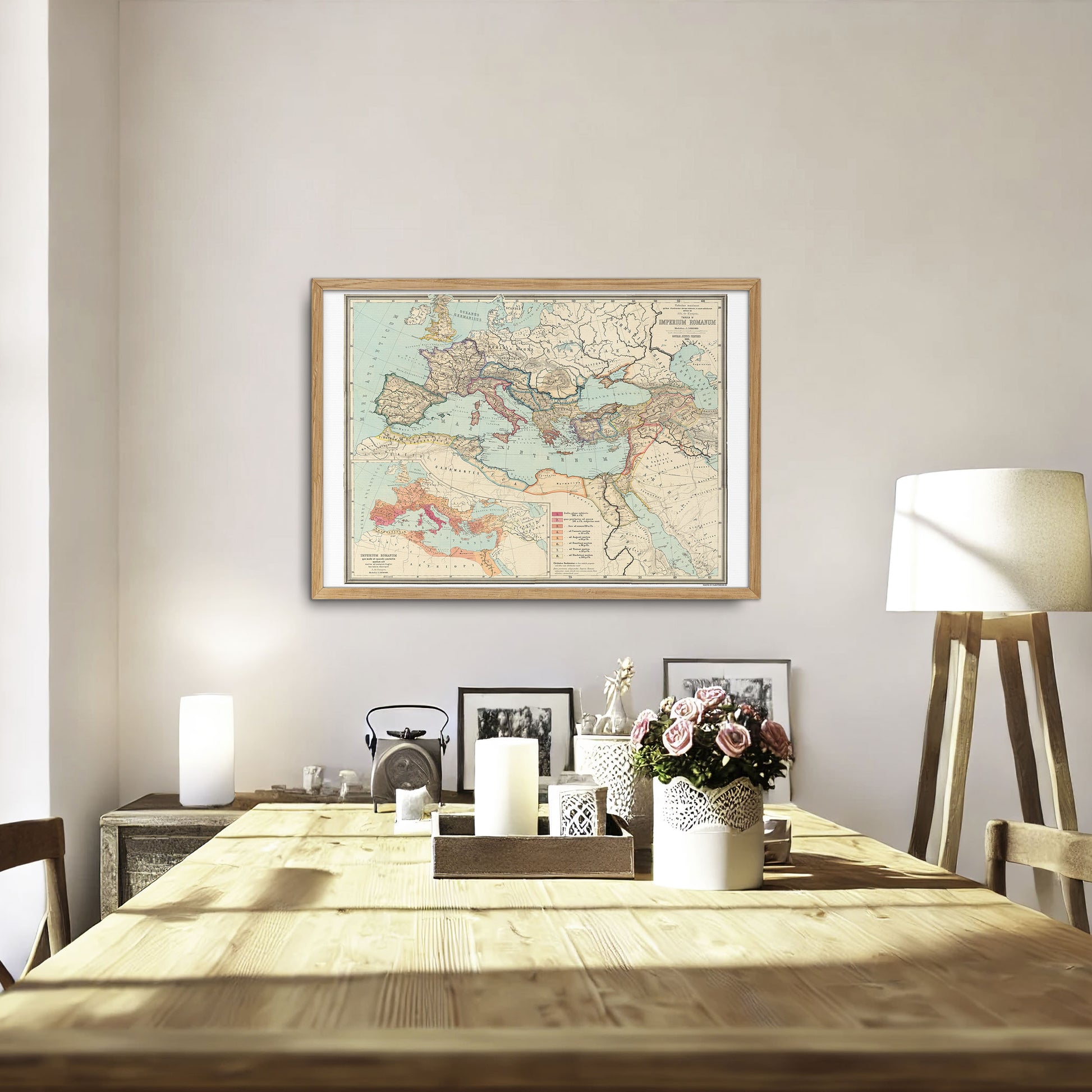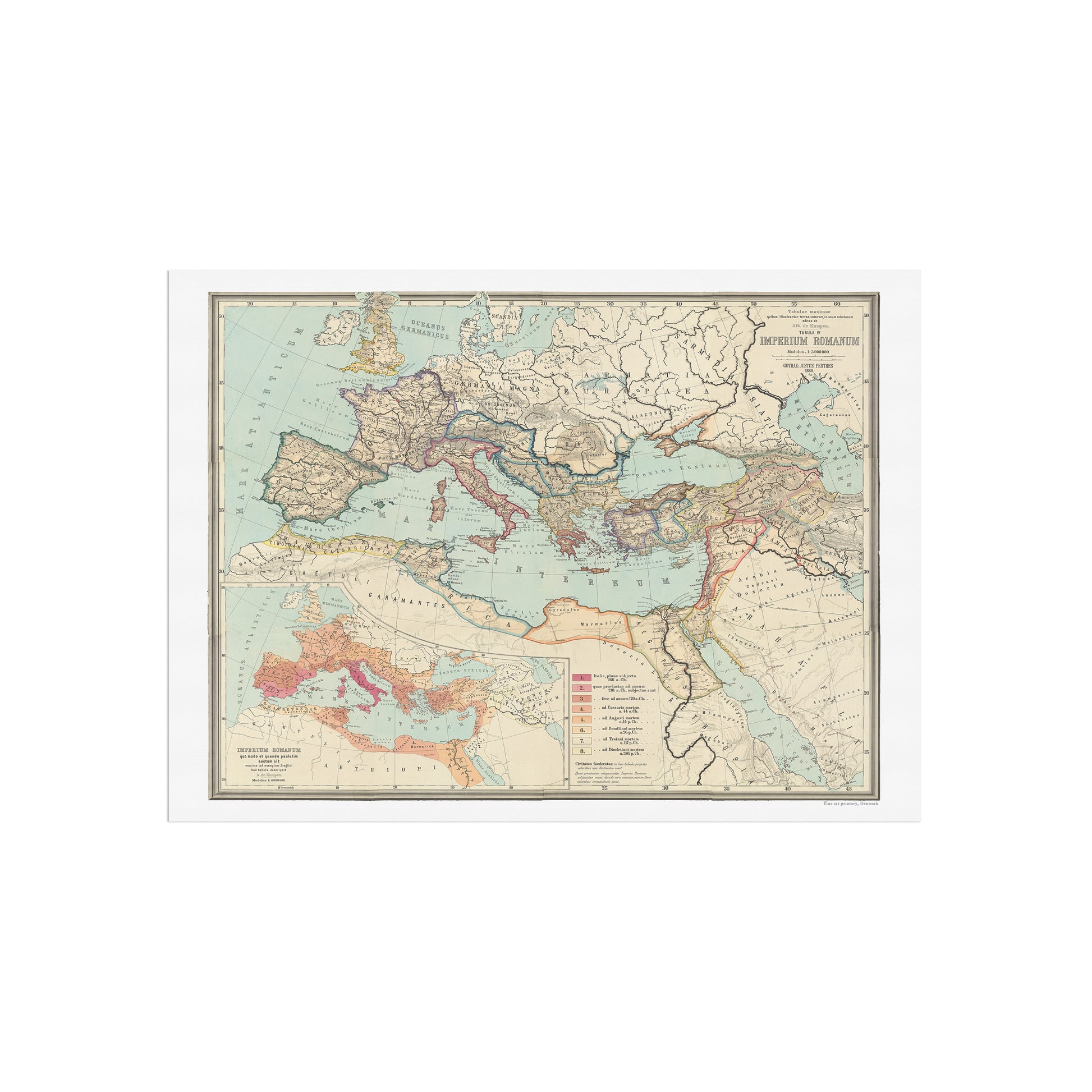Et smukt kort over Romerriget, med titlen: Imperium Romanum, og fuld titel Tabulae maximae quibus illustrantur terrae veterum in usum scholarum. Denne replikation viser den kendte verden i det gamle Romerrige fra omkring 266 f.Kr. til 305 e.Kr.