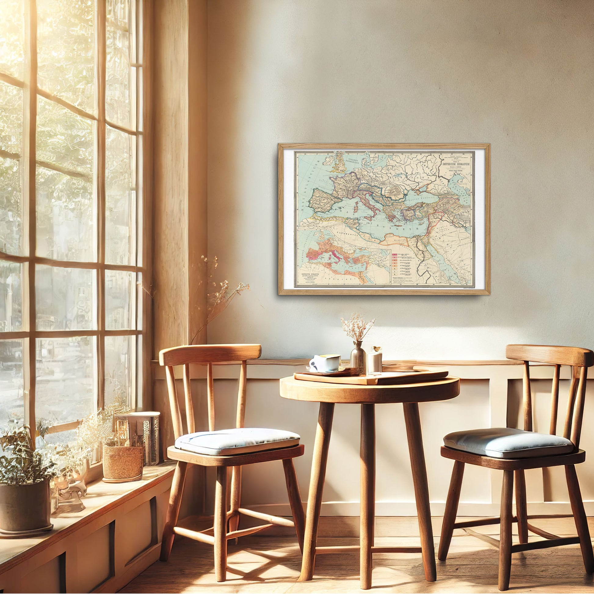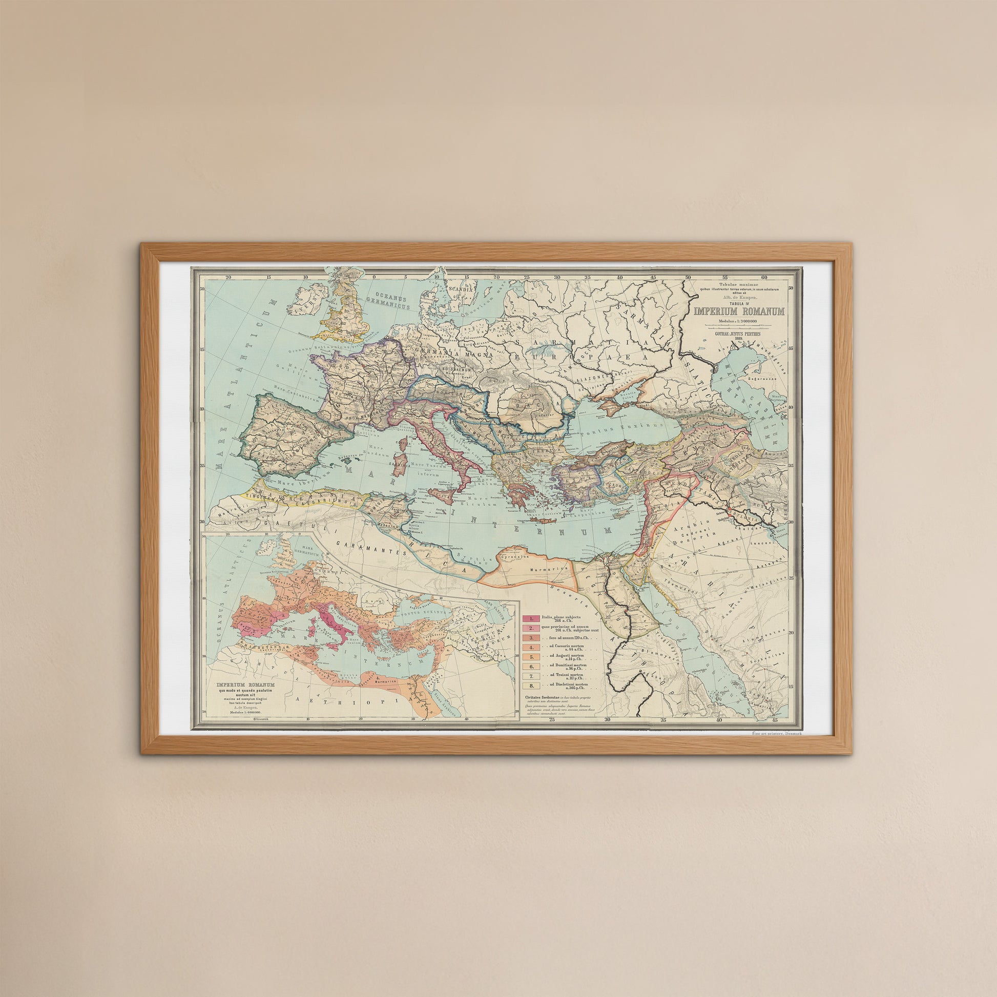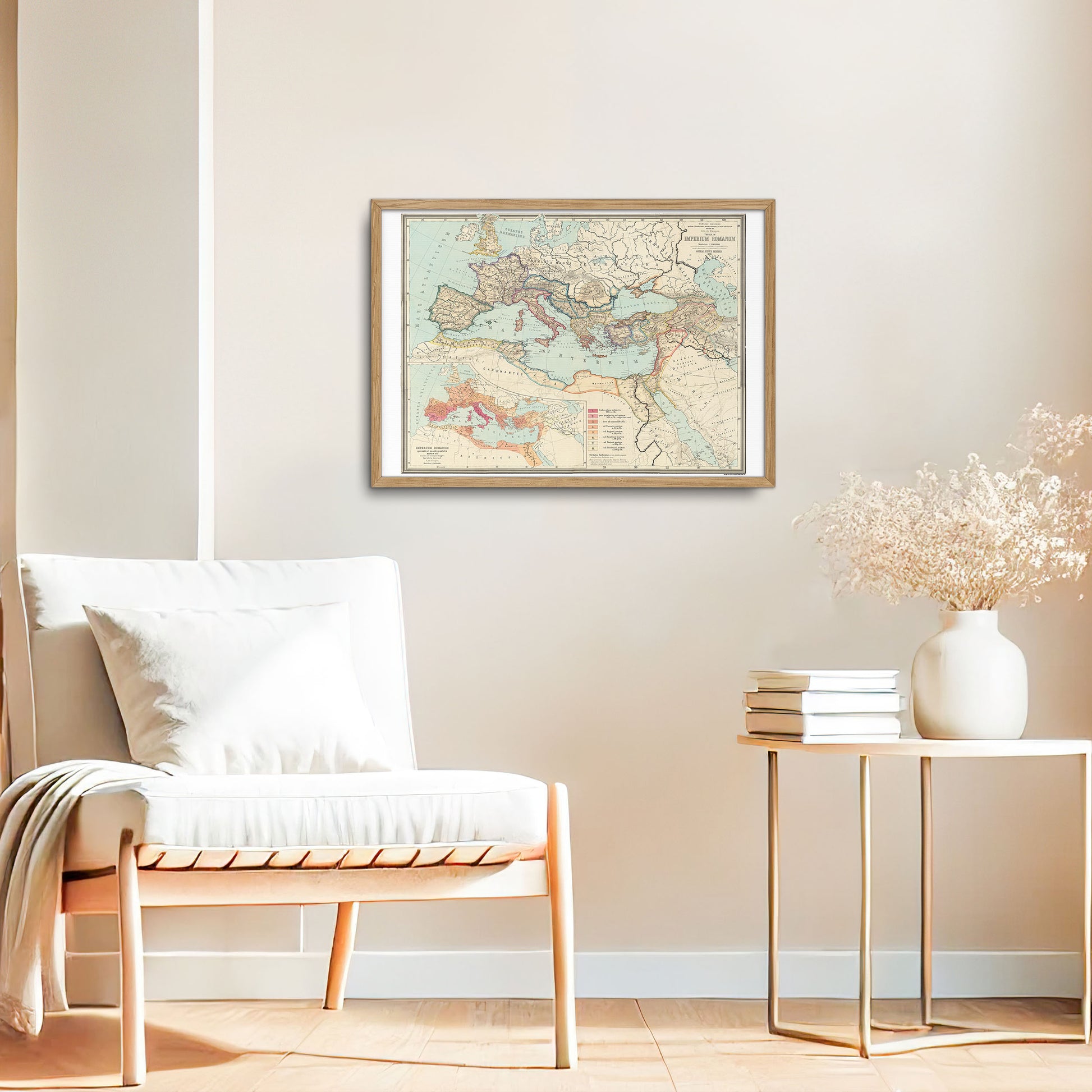 Dette historiske europæiske kort over Romerriget er et fantastisk kunstværk med mange spændende detaljer, herunder navnene på de mange stammer, som de gamle romere kæmpede med og imod, under deres tid som verdens mest magtfulde imperium. Det originale kort blev skabt i 1889 af Albert van Kampen og Justus Perthes.