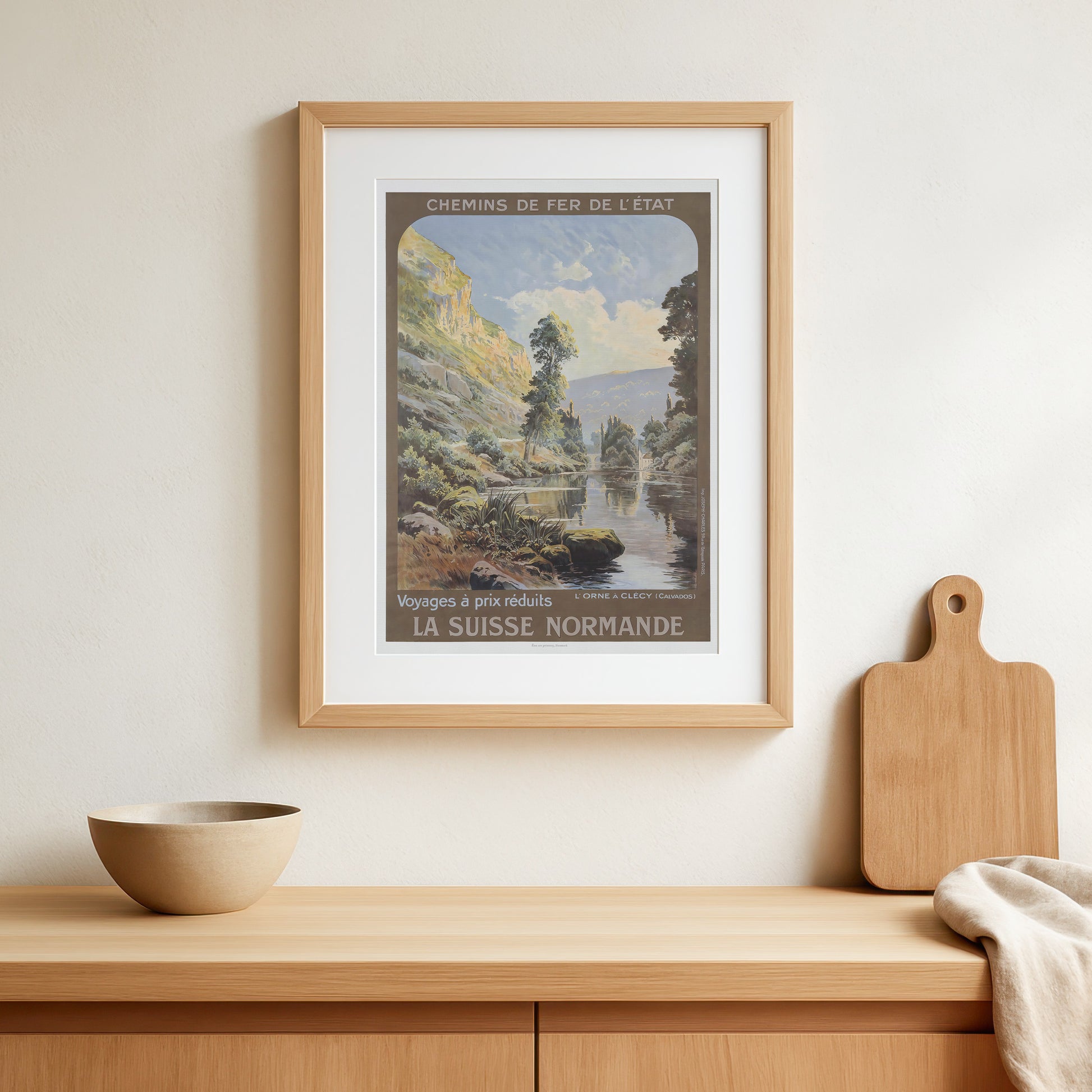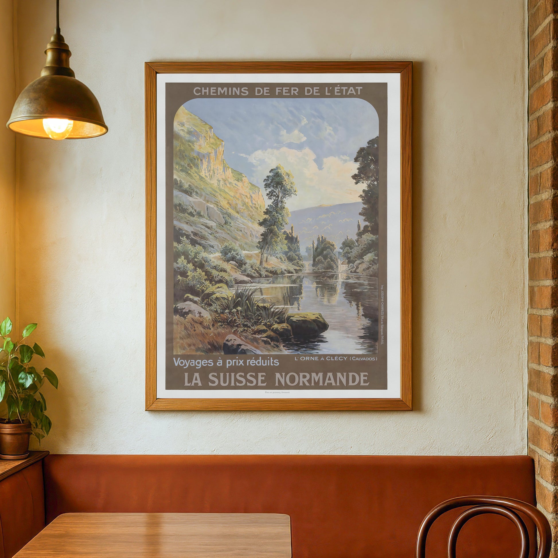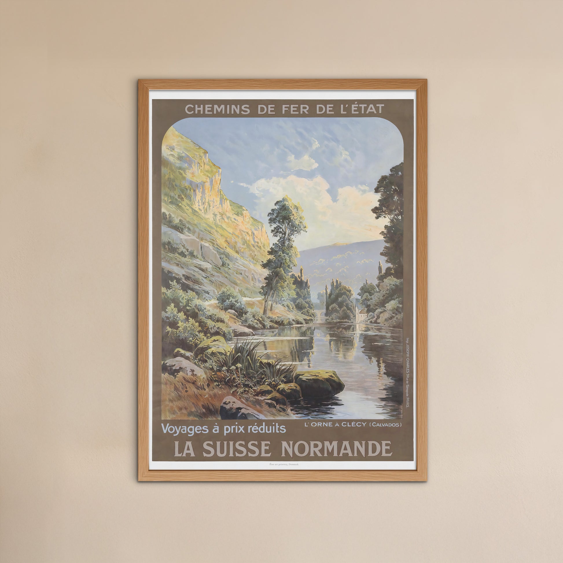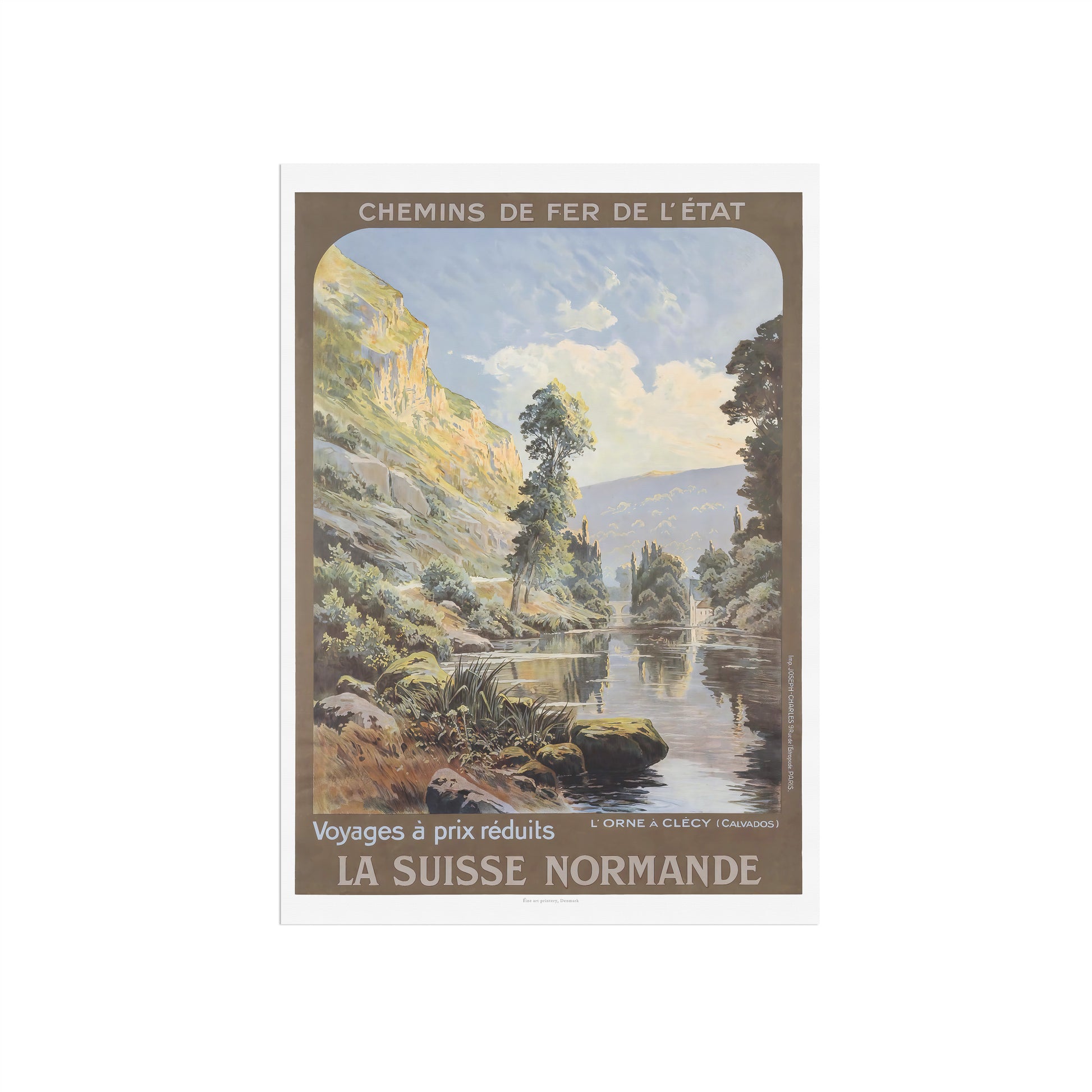 Skulle det være noget med smuk togrejse igennem Normandiets skønne egne, så har du her en rejseplakat for gode rabat-rejser med de franske statsbaner til La Suisse Normande.