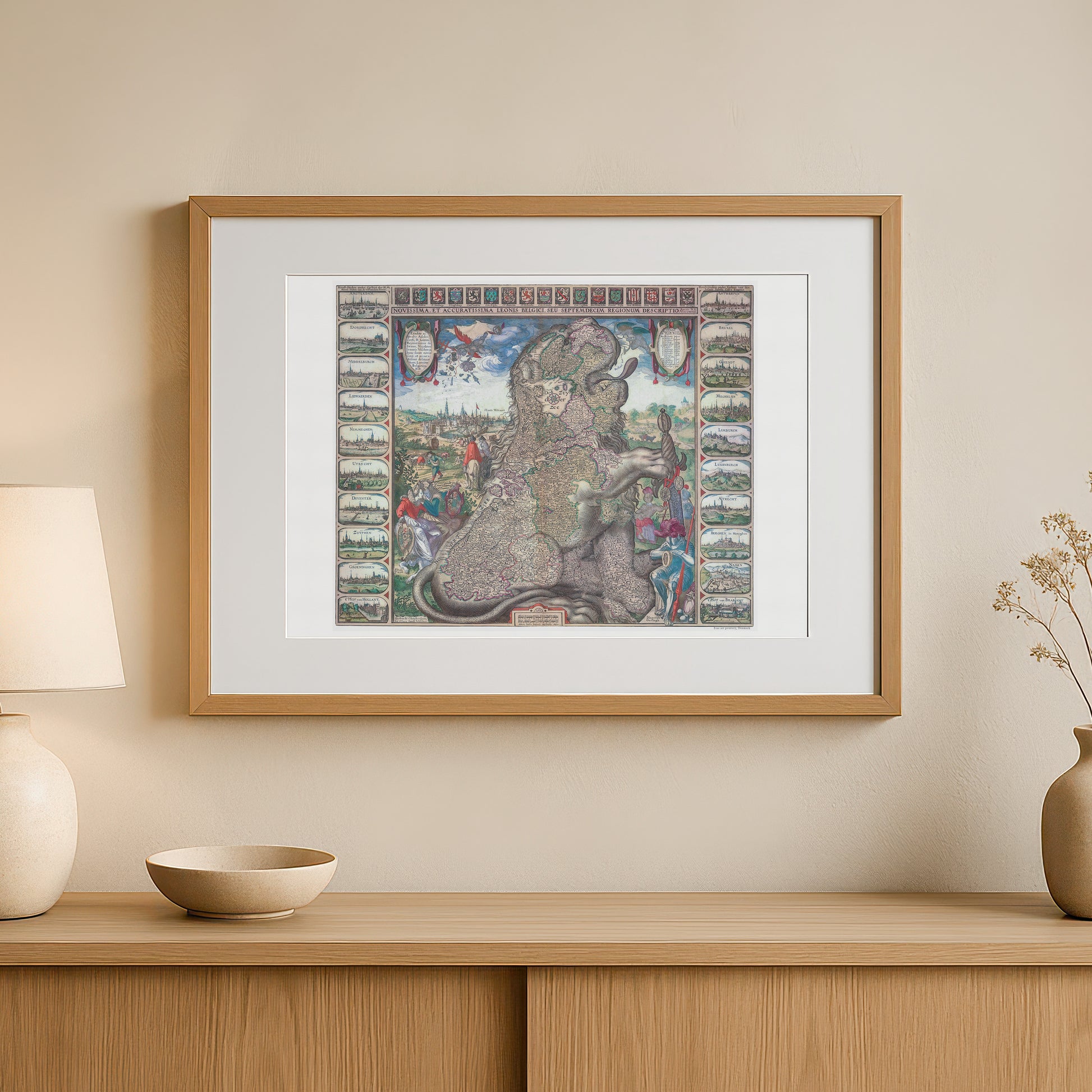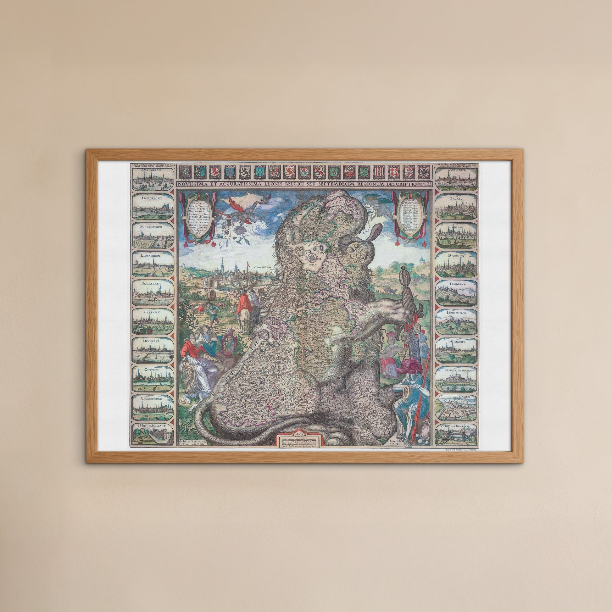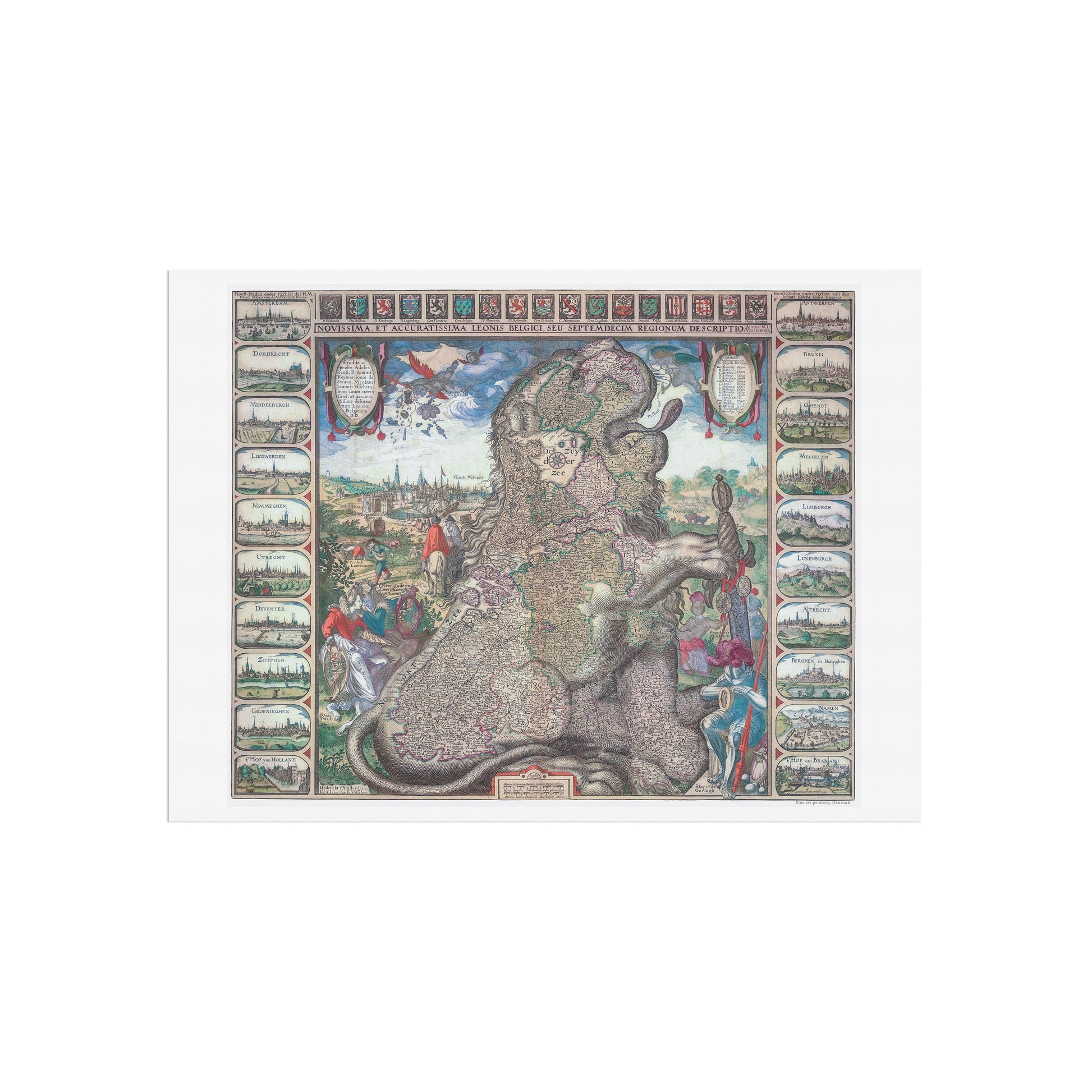 Oplev et stykke europæisk historie med dette imponerende og detaljerede kort over Leo Belgicus. Dette er en reproduktion af den ikoniske kortform, der skildrer Provinserne i Nederlandene formet som en majestætisk løve – et symbol på styrke og uafhængighed.