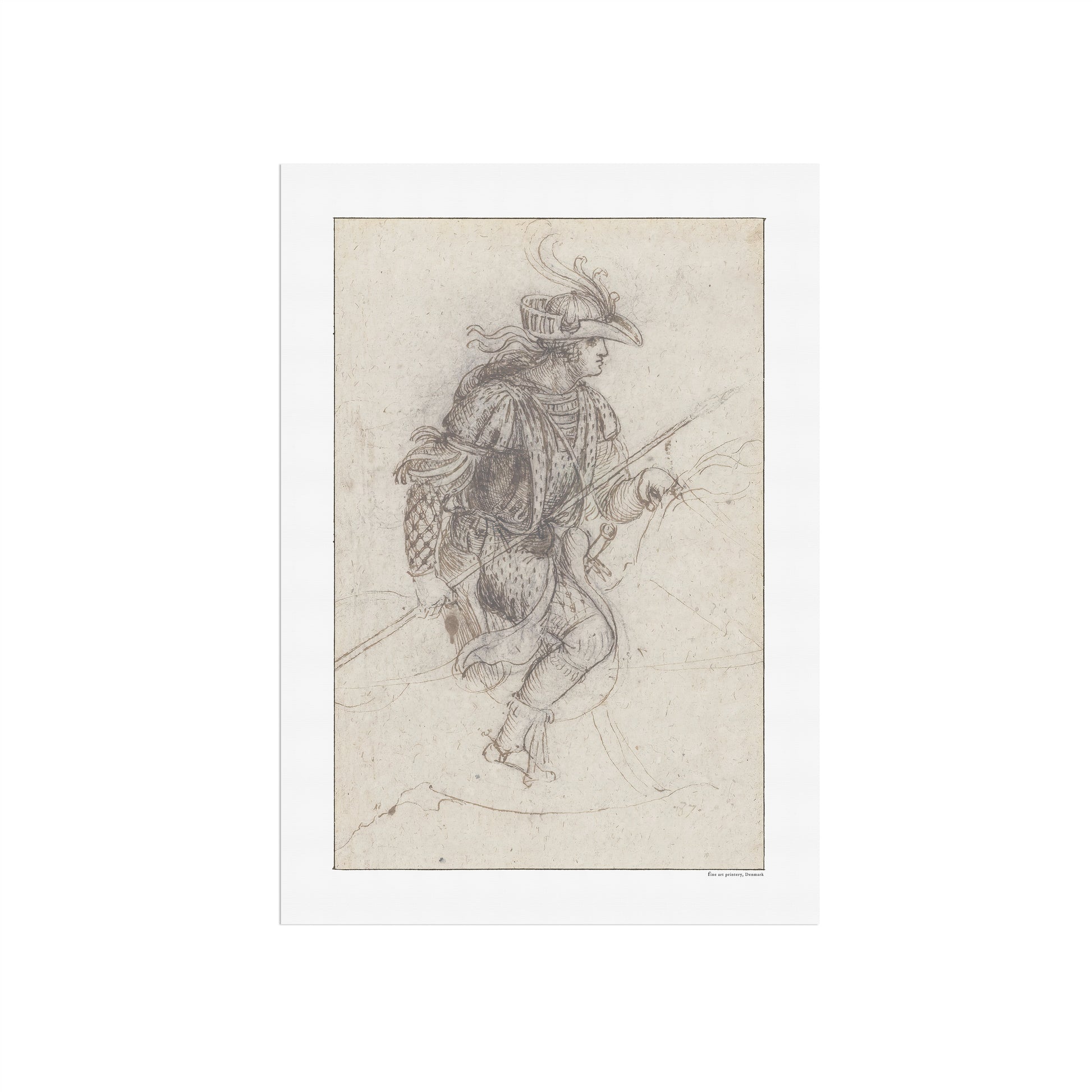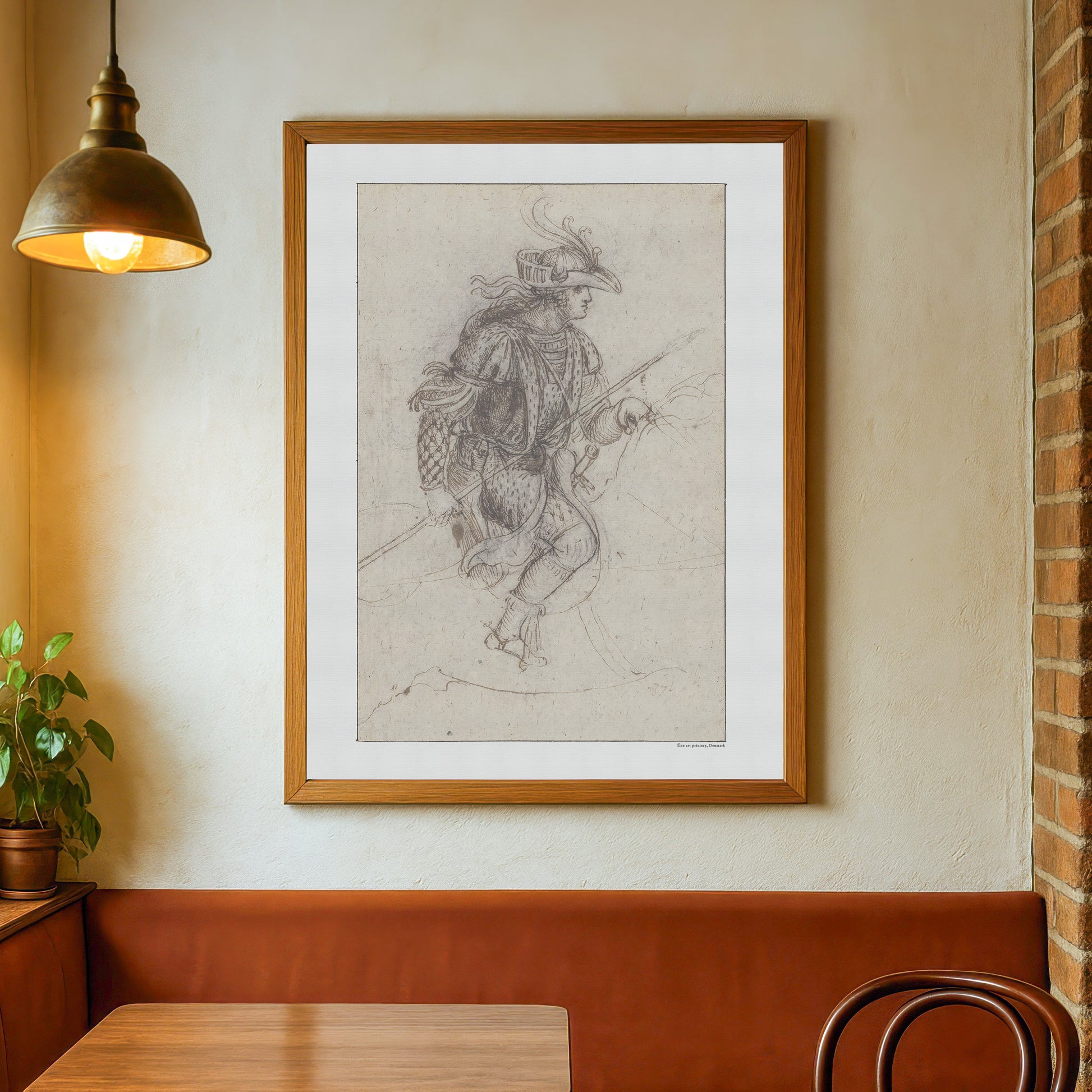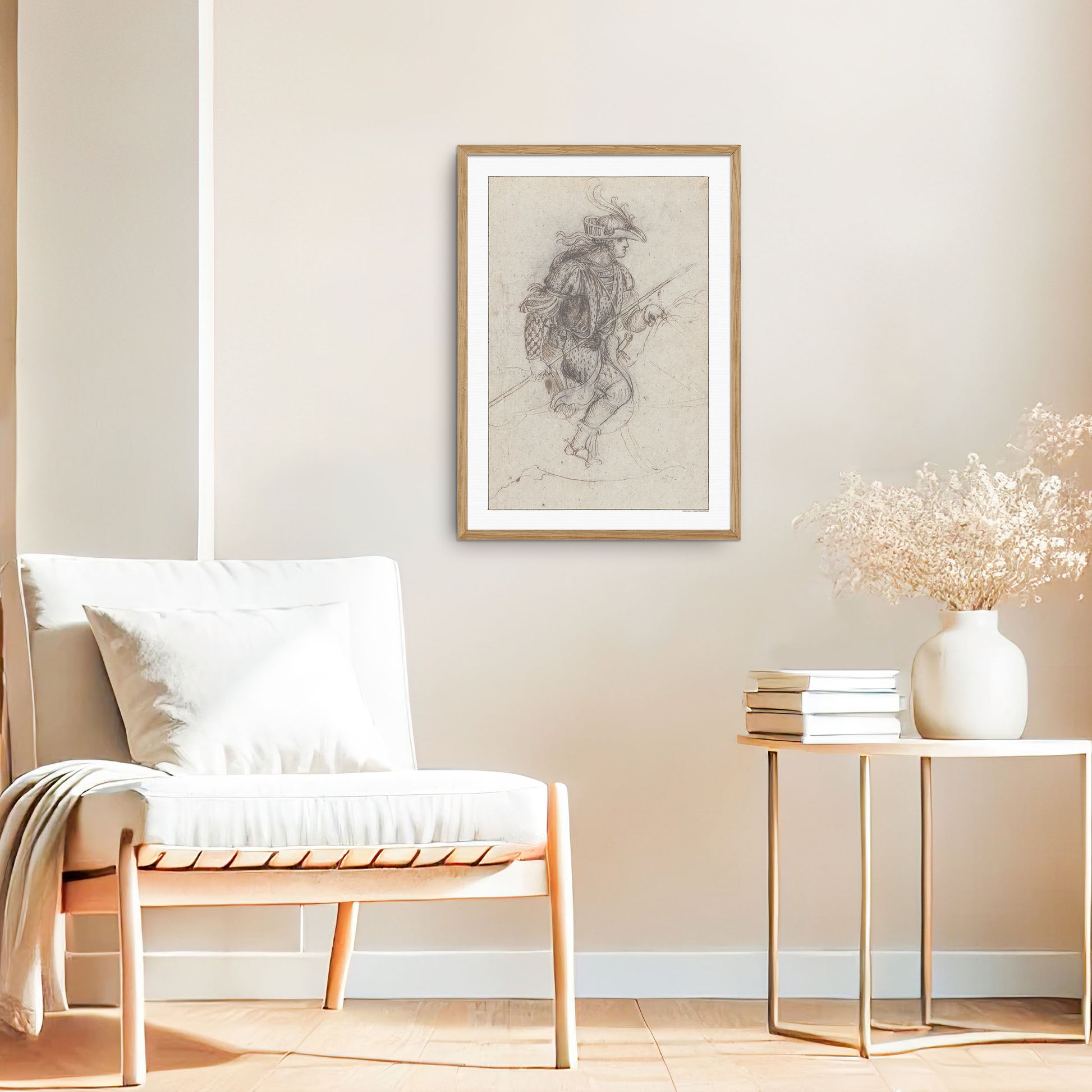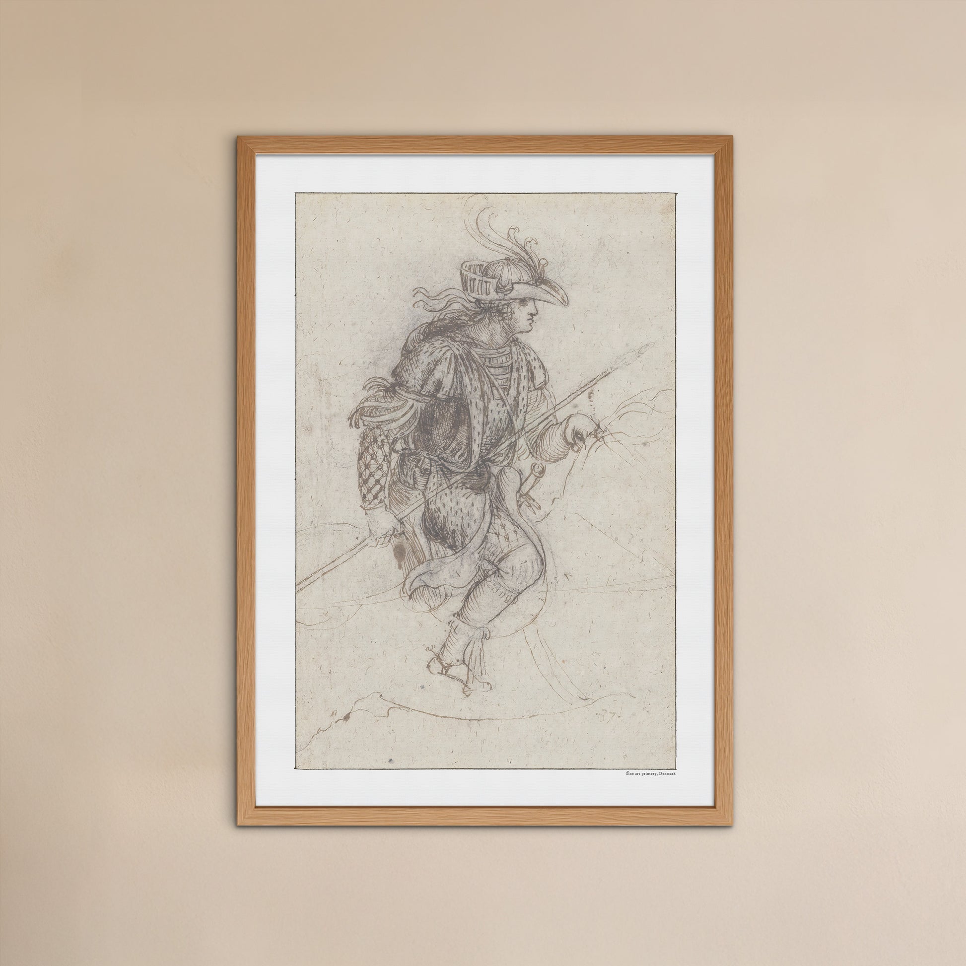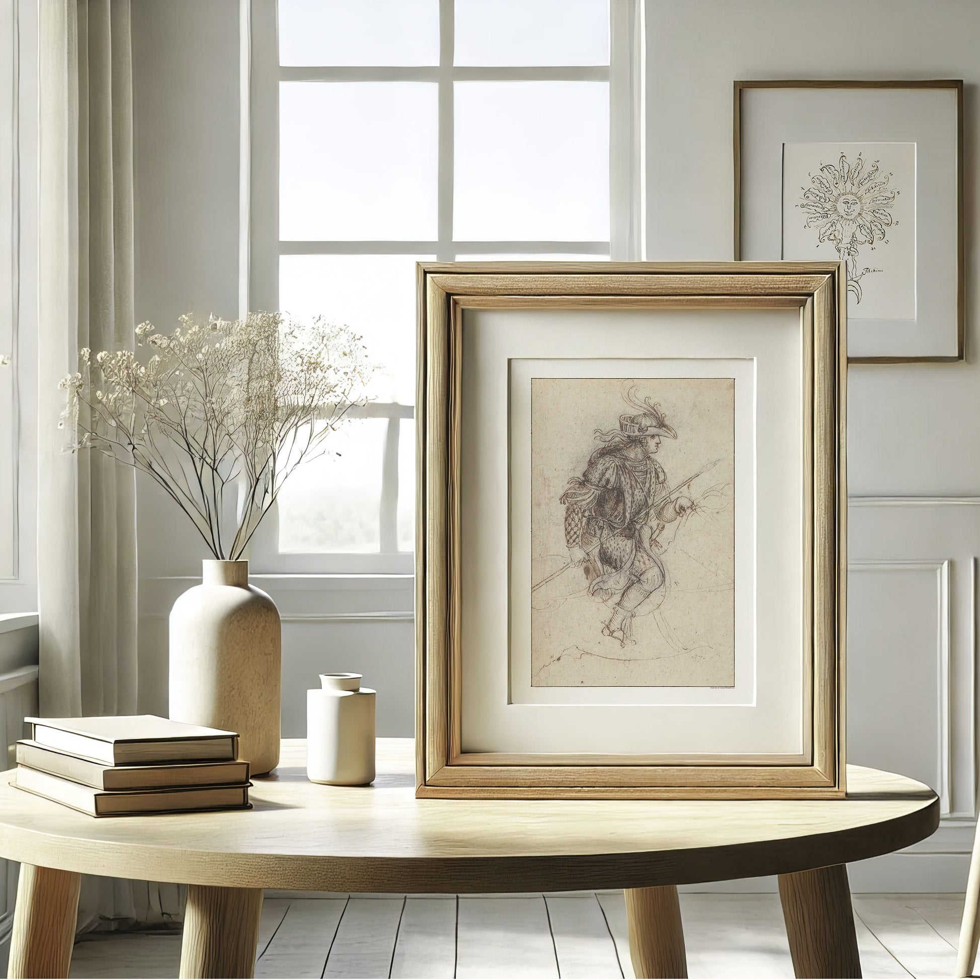 Oprindeligt skabt som en del af da Vincis kostumestudier til hofopførelser, forener dette værk teaterets flair med anatomisk præcision og giver et indblik i renæssancens livlige kultur. Perfekt til kunstelskere, historieentusiaster og samlere af da Vincis værker, bringer denne plakat en dramatisk og sofistikeret stemning ind i enhver indretning.