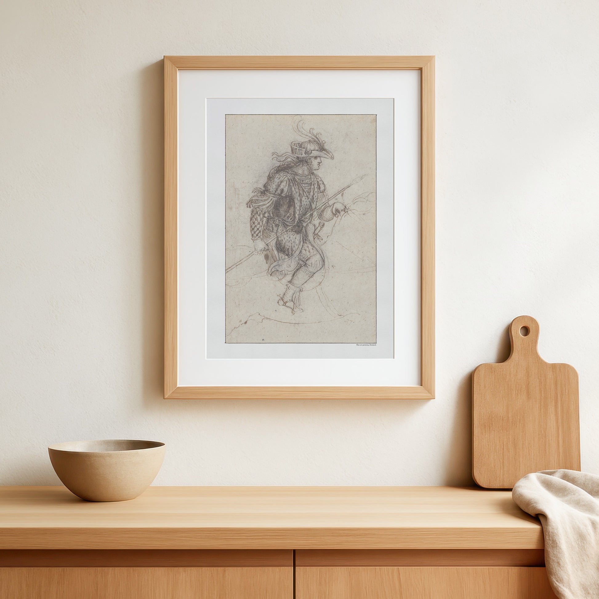 Træd ind i renæssancens teaterverden med denne udgave af Leonardo da Vincis værk Den maskeradeudklædte Rytter (A Masquerader on Horseback). Denne dynamiske skitse viser da Vincis imponerende evner, hvor det detaljerede kostume naturligvis står i fokus.