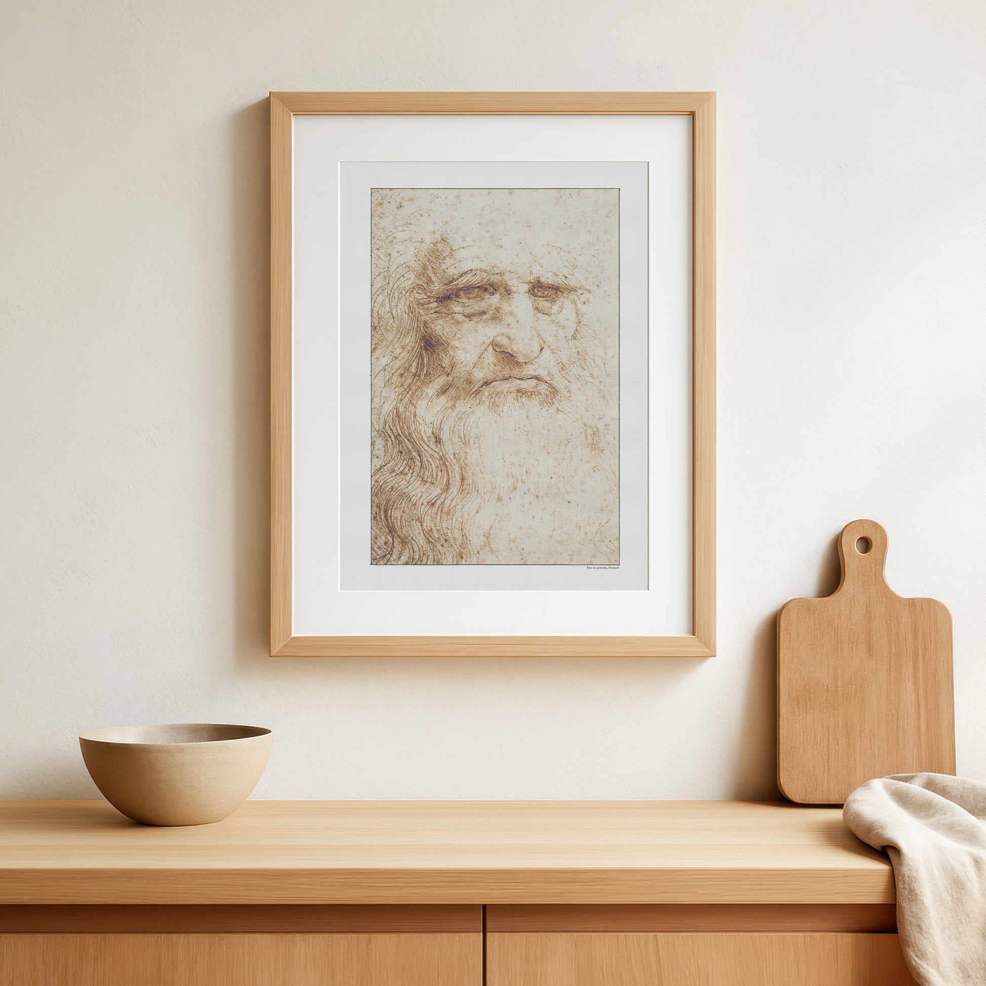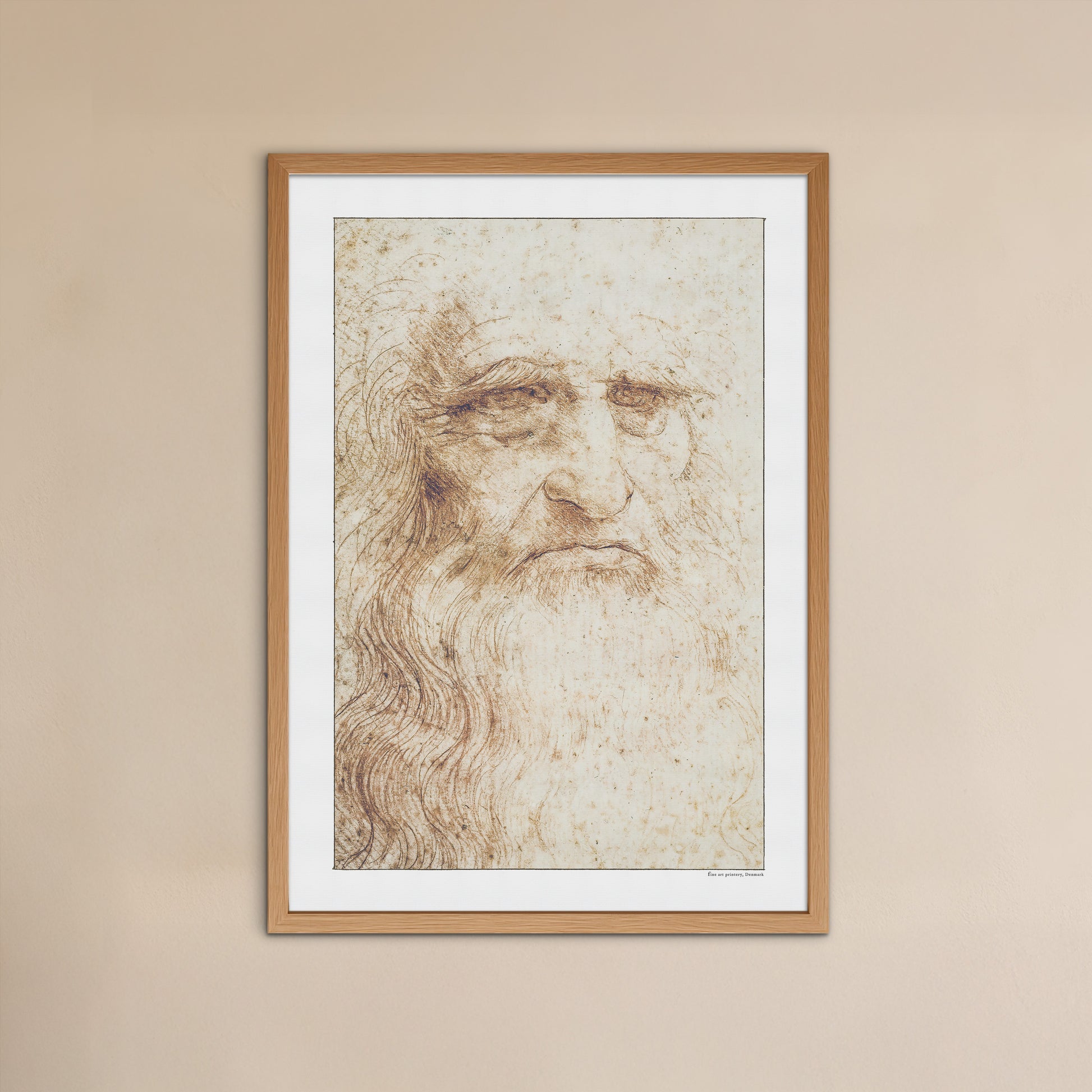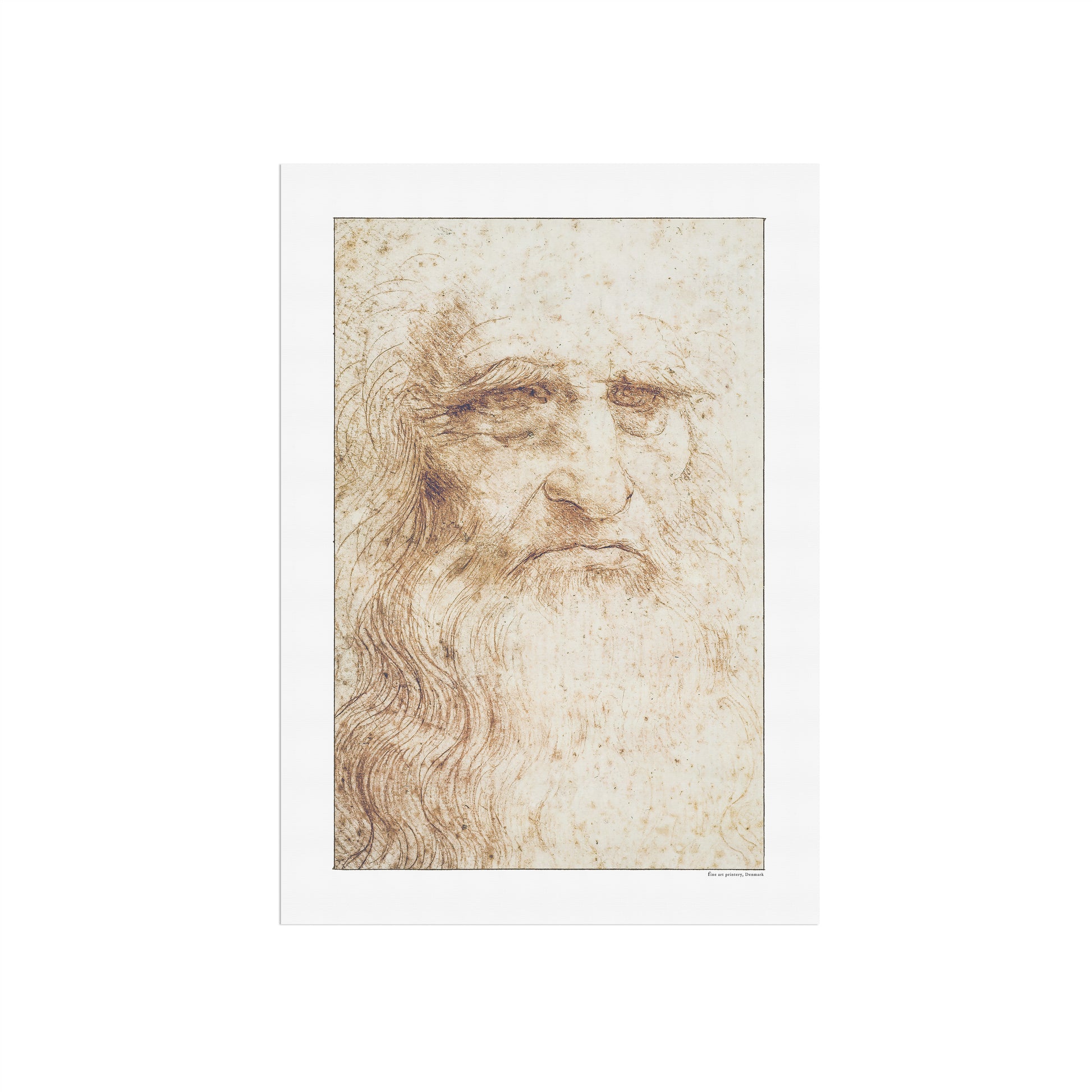Oplev Leonardo da Vincis kunstneriske mesterskab med denne smukke gengivelse af hans berømte Selvportræt fra 1512. Denne fascinerende, oprindeligt rødkridttegning, længe anset som et selvportræt af da Vinci i hans senere år, indfanger alderens dybde og værdighed med enestående præcision. Selvom identiteten af selvportrættet er omdiskuteret, afslører de fine detaljer stadigvæk da Vincis dybe talent og refleksionsevne.