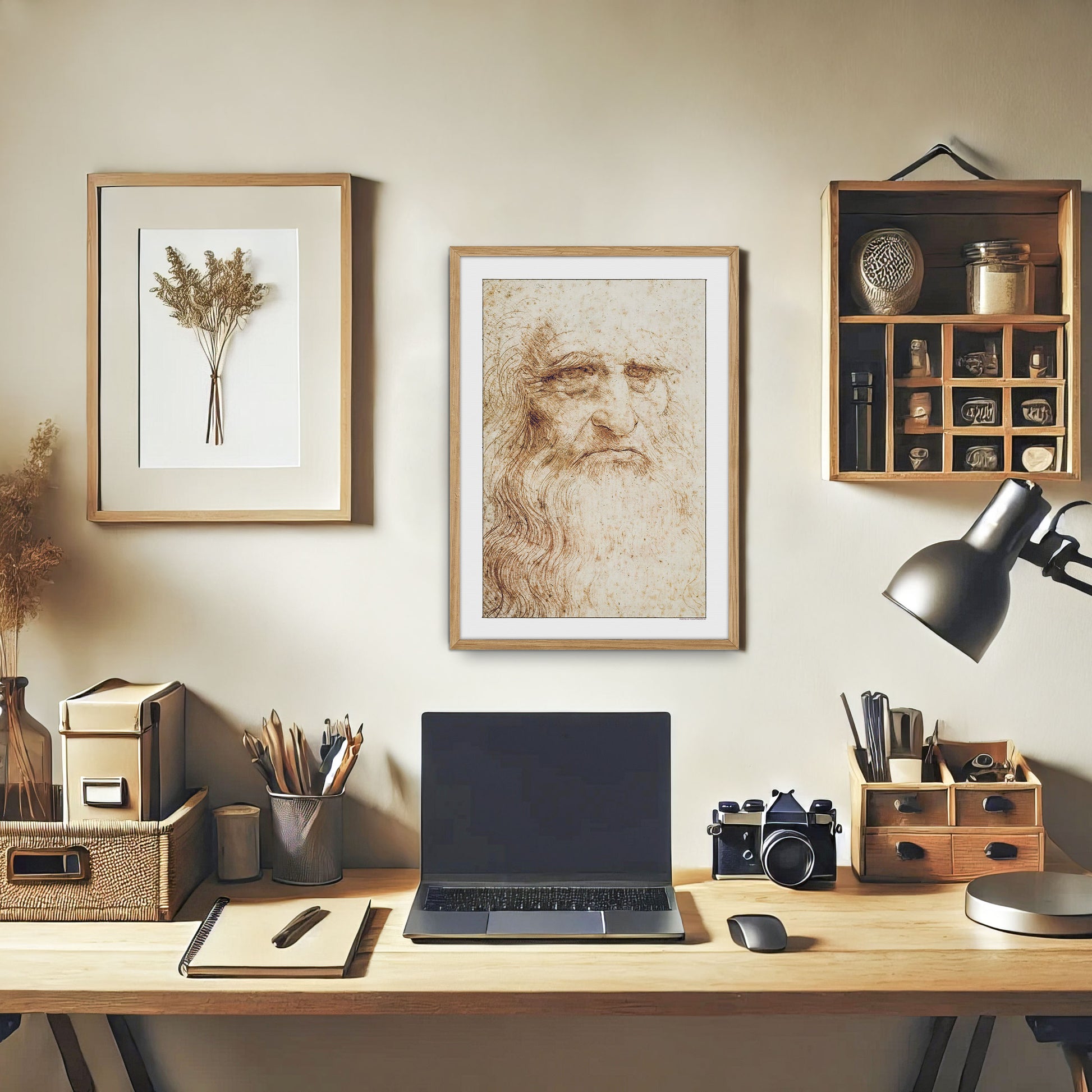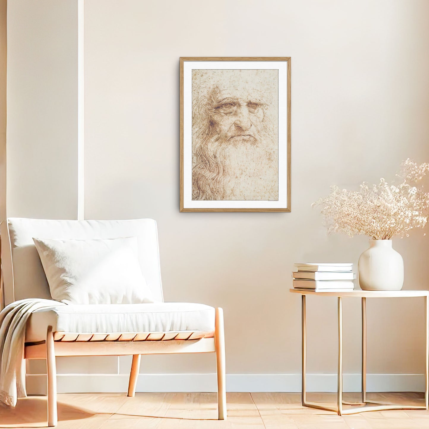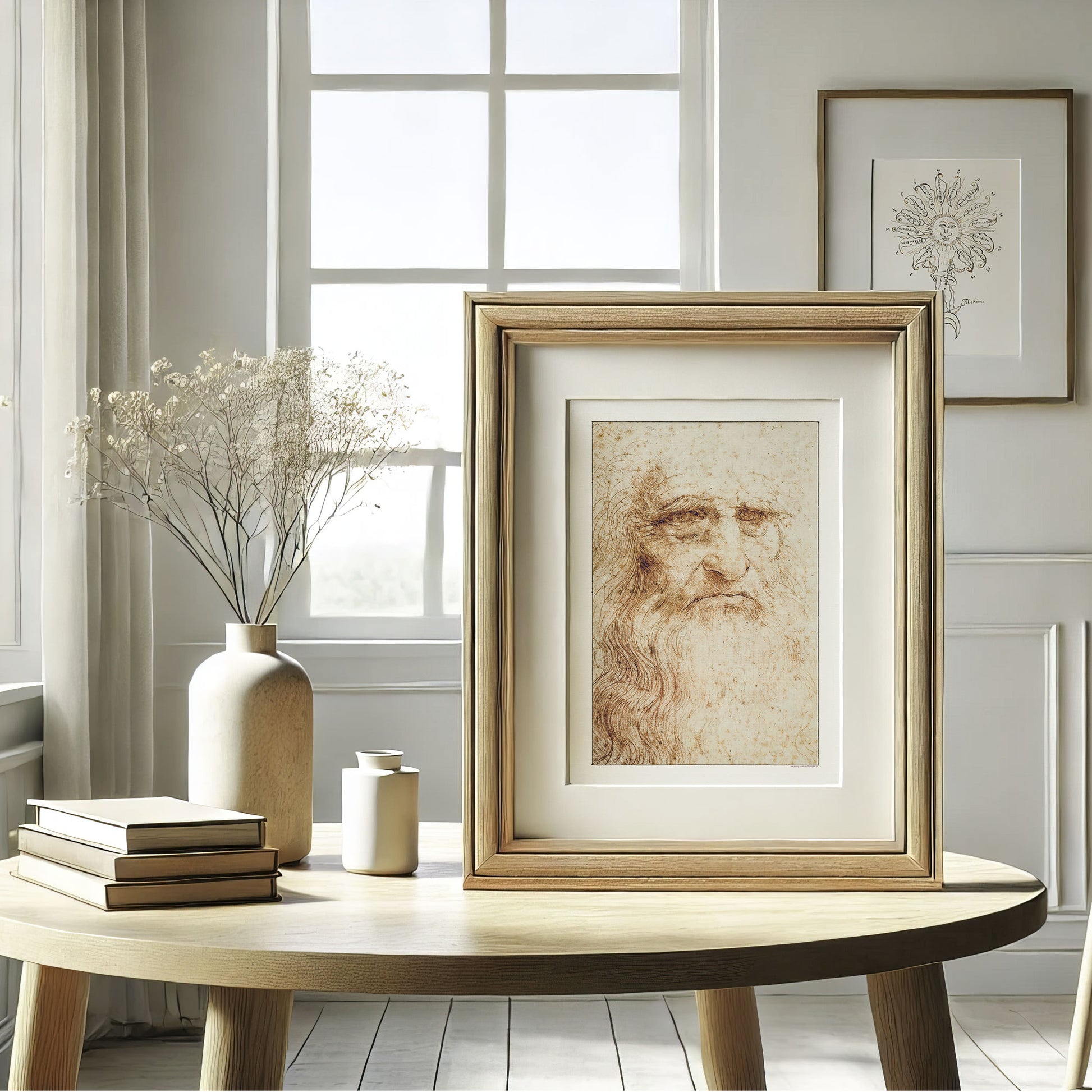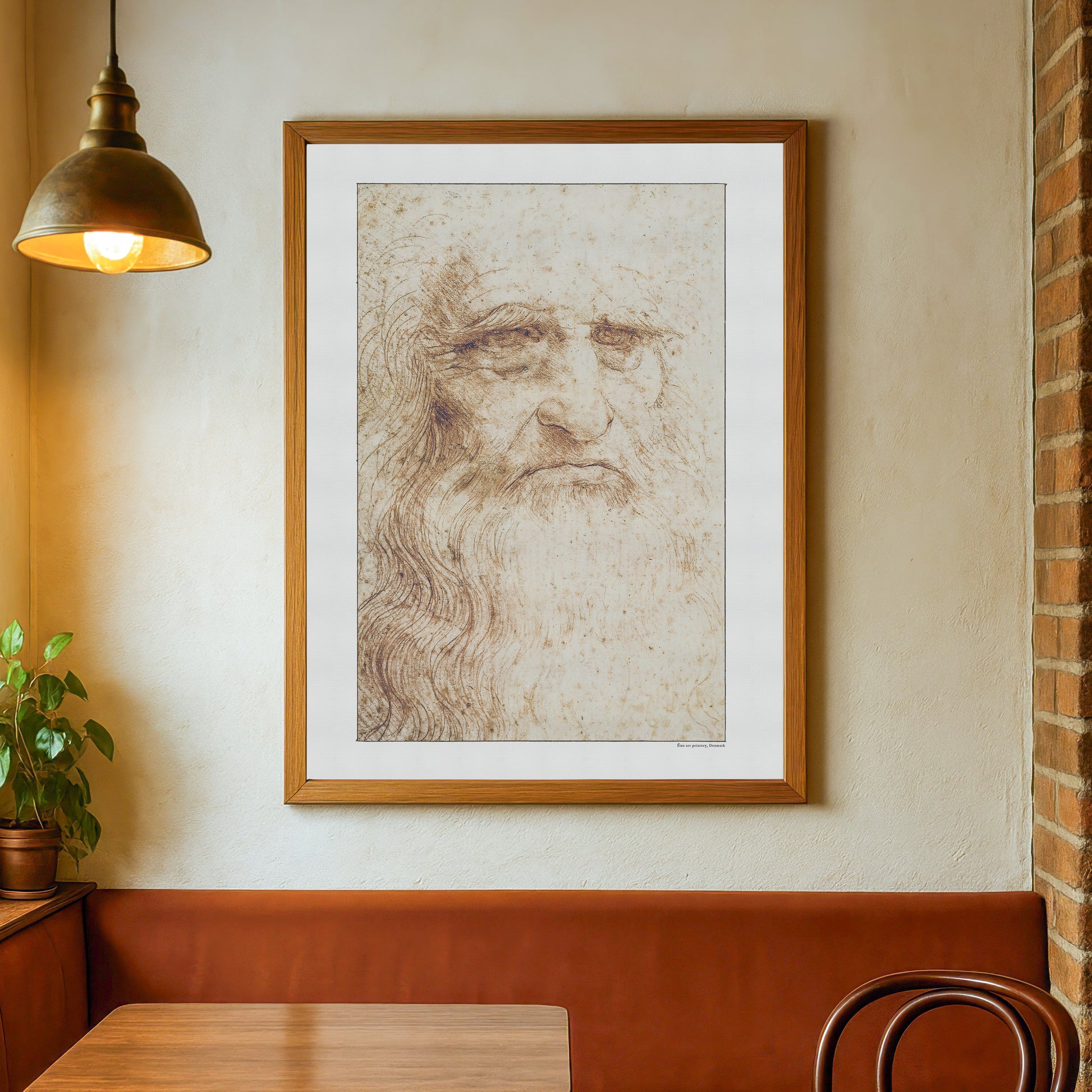 Oplev Leonardo da Vincis kunstneriske mesterskab med denne smukke gengivelse af hans berømte Selvportræt fra 1512. Denne fascinerende, oprindeligt rødkridttegning, længe anset som et selvportræt af da Vinci i hans senere år, indfanger alderens dybde og værdighed med enestående præcision. Selvom identiteten af selvportrættet er omdiskuteret, afslører de fine detaljer stadigvæk da Vincis dybe talent og refleksionsevne.