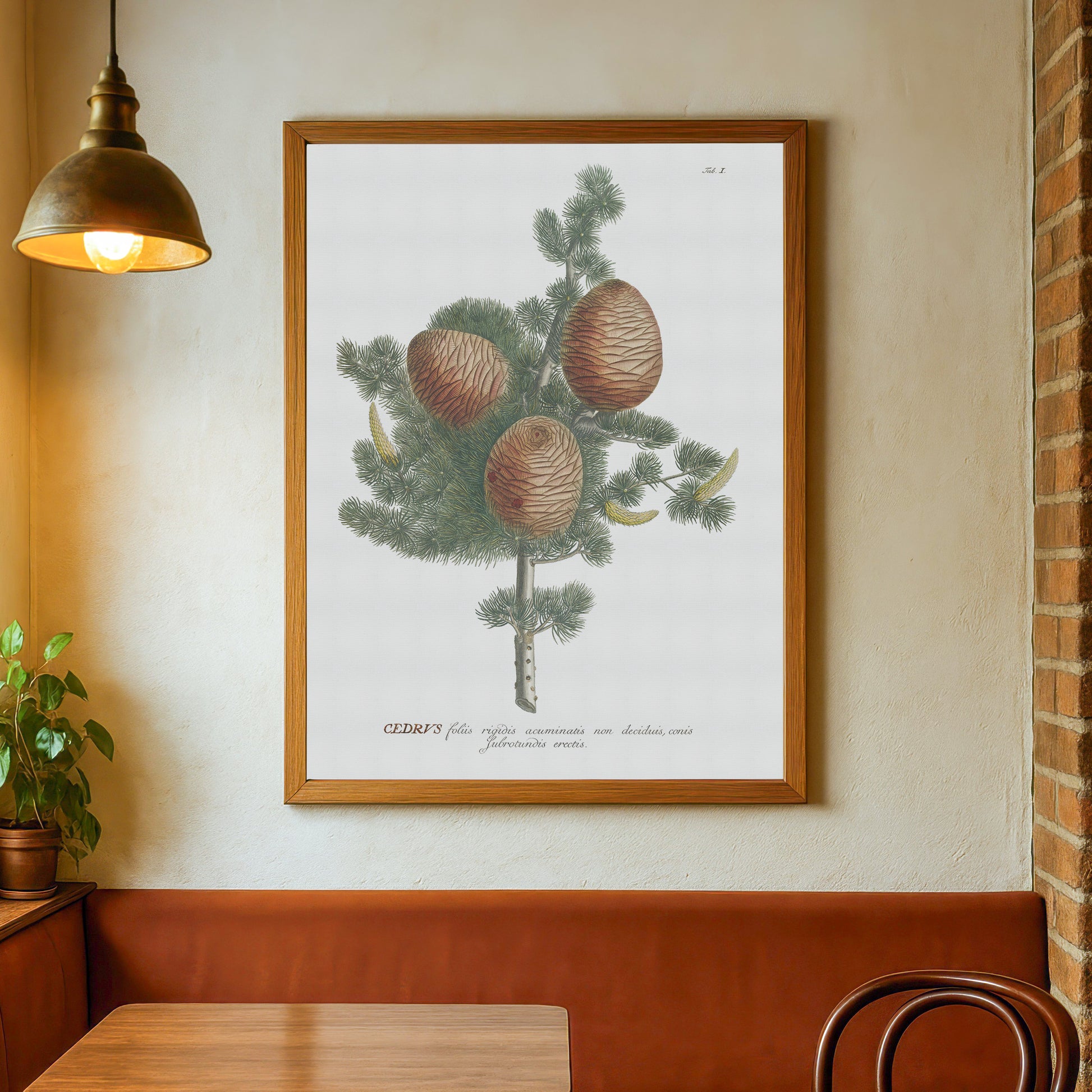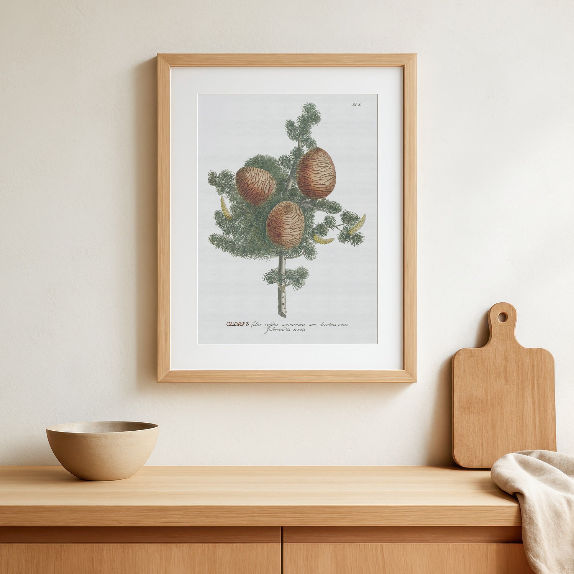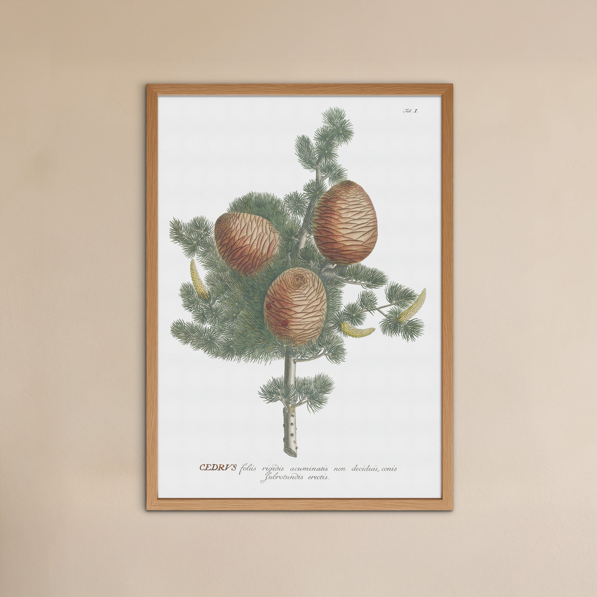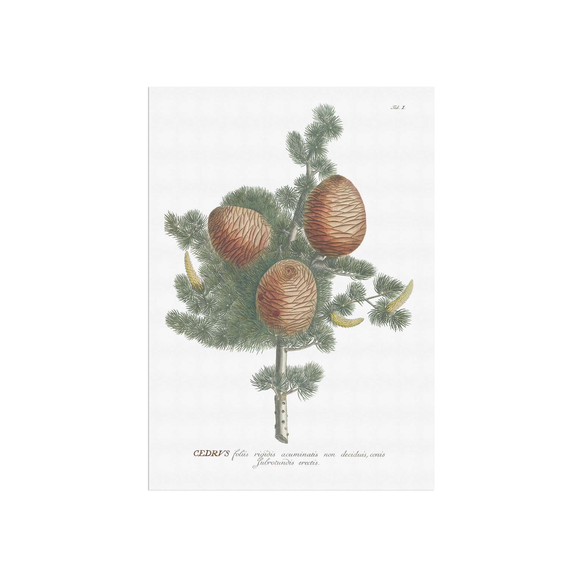 Denne fængslende illustration forestiller en del af grenen fra træet, og viser også kogle af både hankøn (aflange gullige) og hunkøn (runde brune). Illustrationen er hentet fra en historisk botanikbog, der dateres tilbage til omkring 1750, og giver et indblik i mange bemærkelsesværdige planters rige botaniske arv.