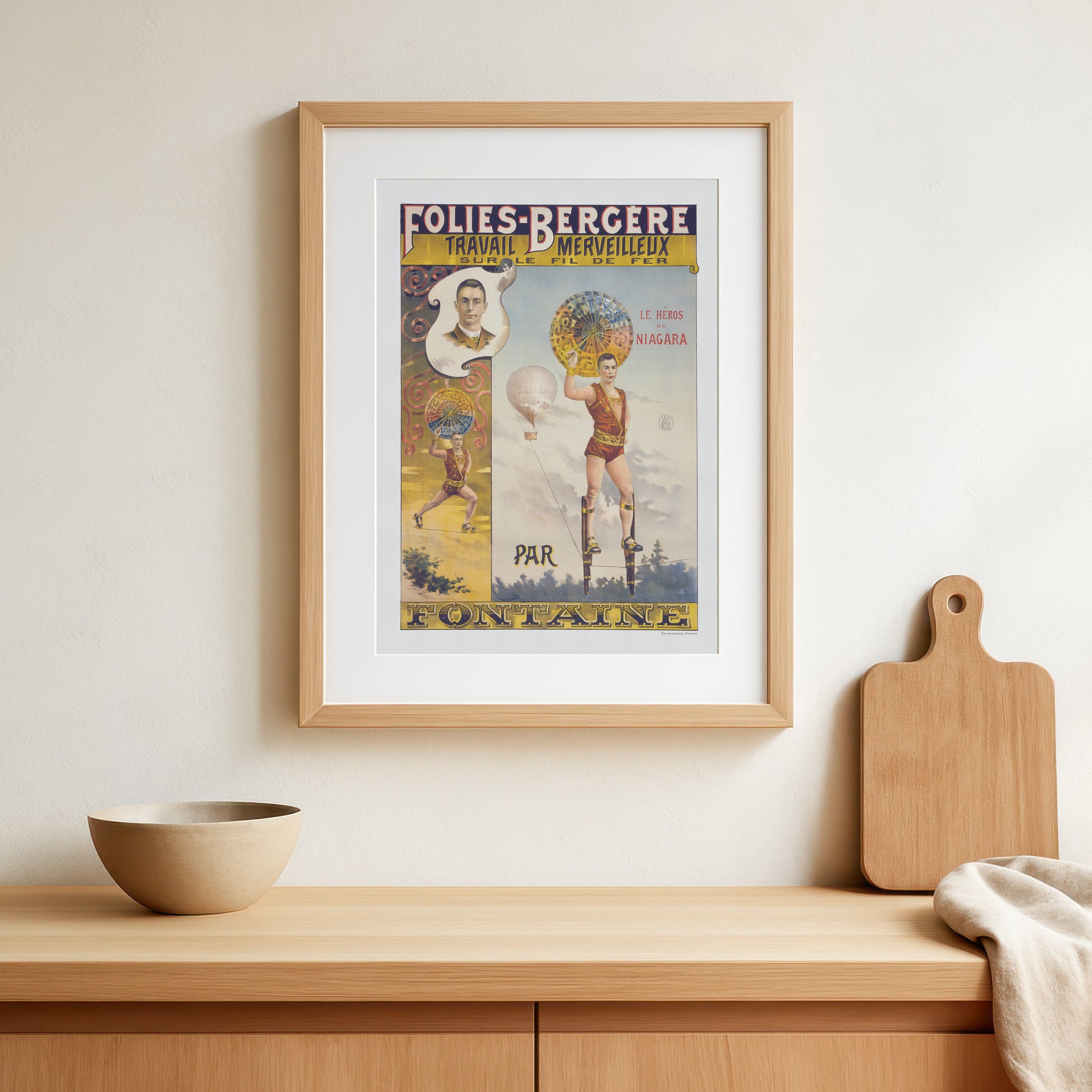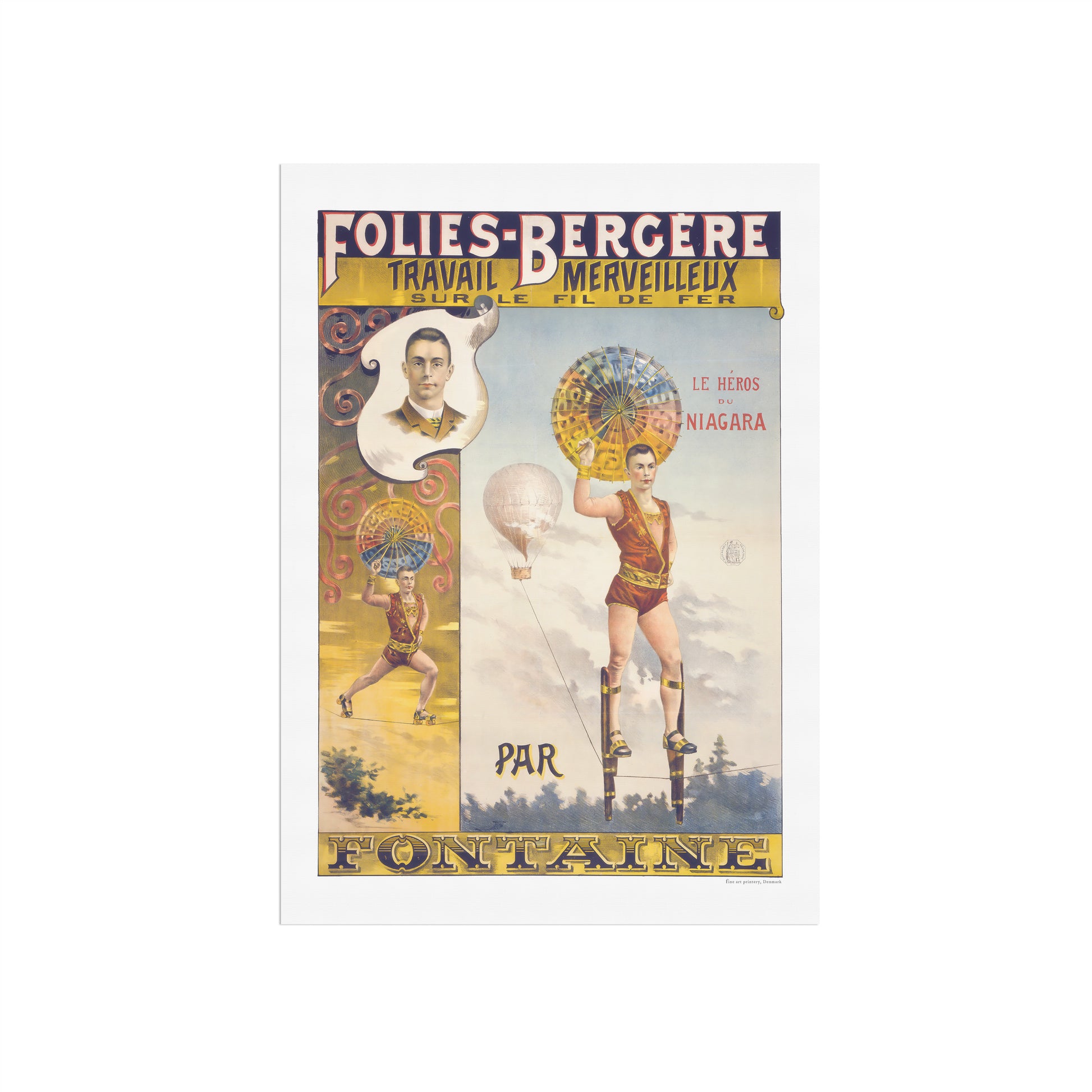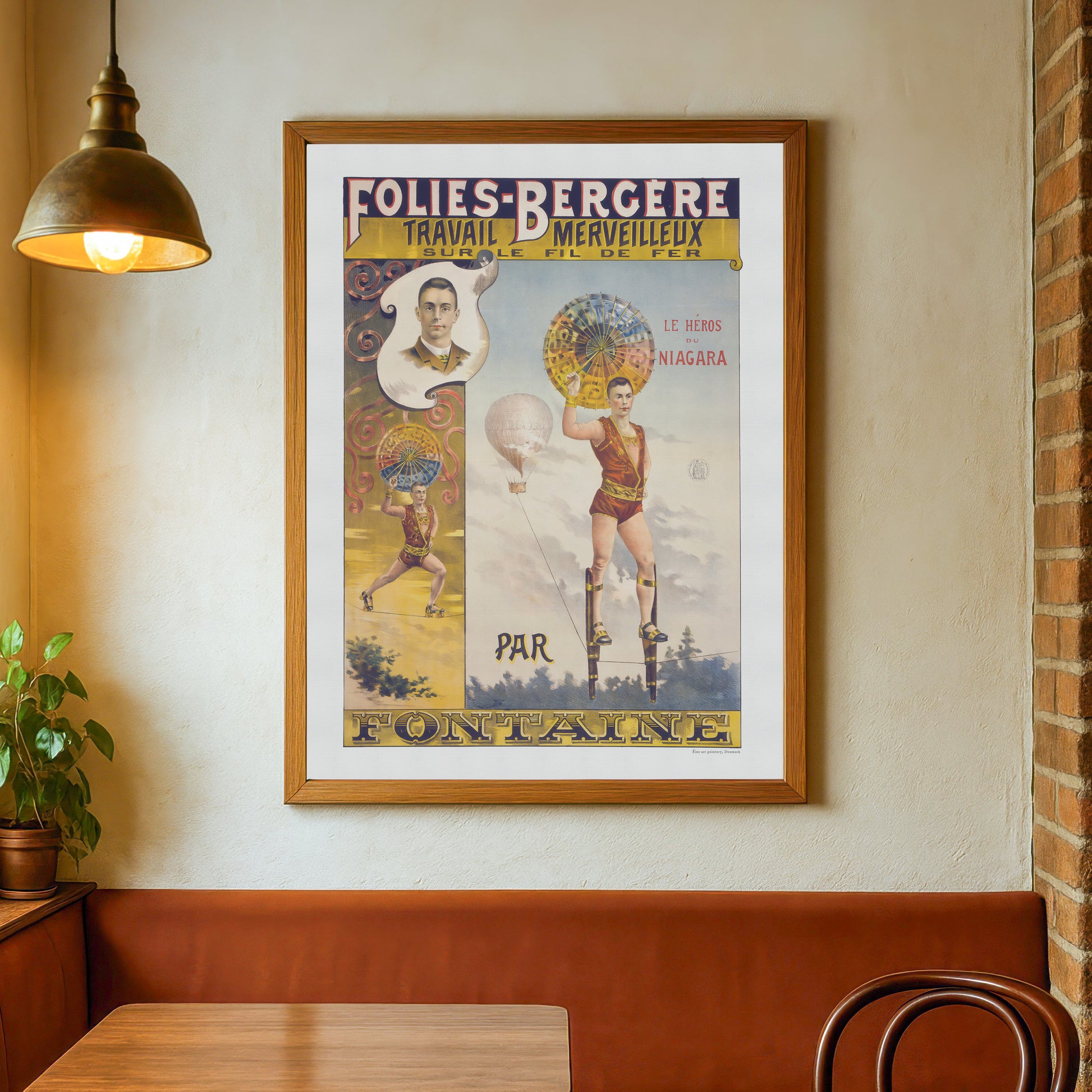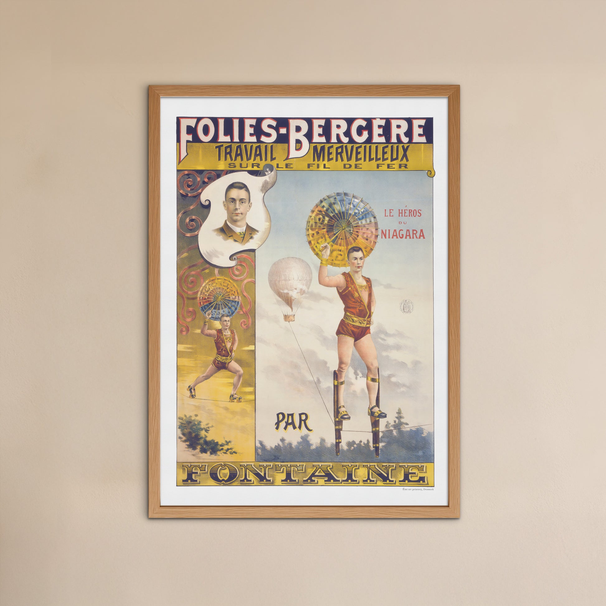 Den fantastisk version af den gamle franske Folies-Bergère-plakat med linedanseren Fontaine, er en skøn påmindelse om de tider, hvor vovede akrobater kunne forbløffe publikum ved at balancere på line over alt fra vandfald til store bål. Denne klassiske plakat af vovehalsen Fontaine, der viser en scene hvor han går på linen som er fastspændt til en varmluftballon, kan nemt invitere seeren til at føle den samme spænding, som man var betaget af dengang hvor vovehalsene havde deres storhedstid.