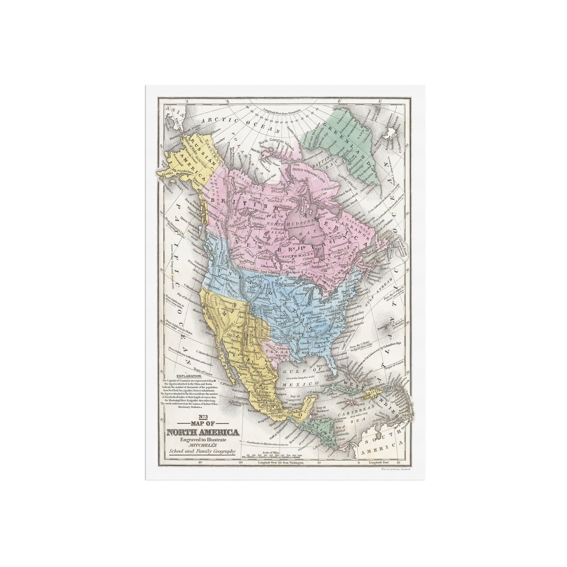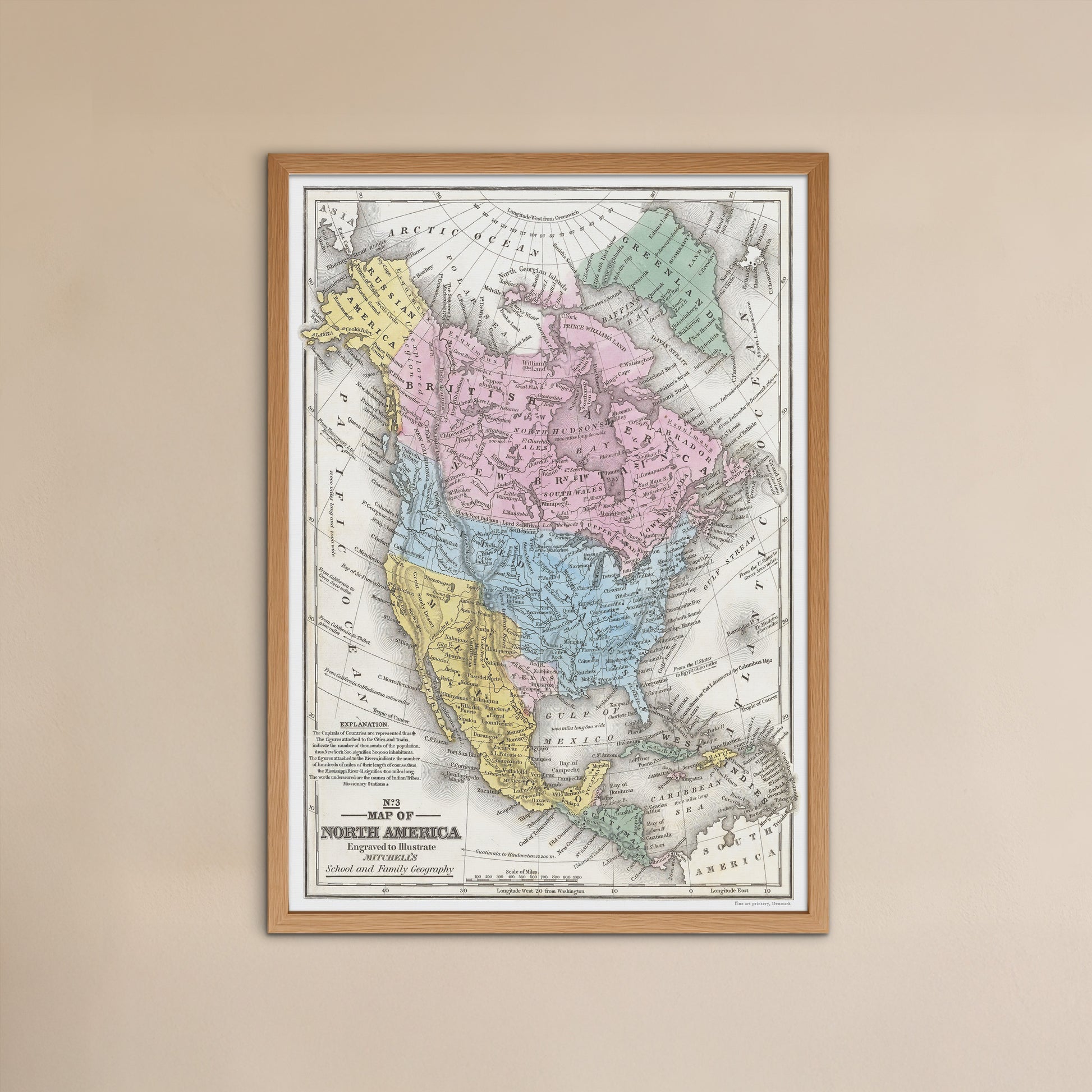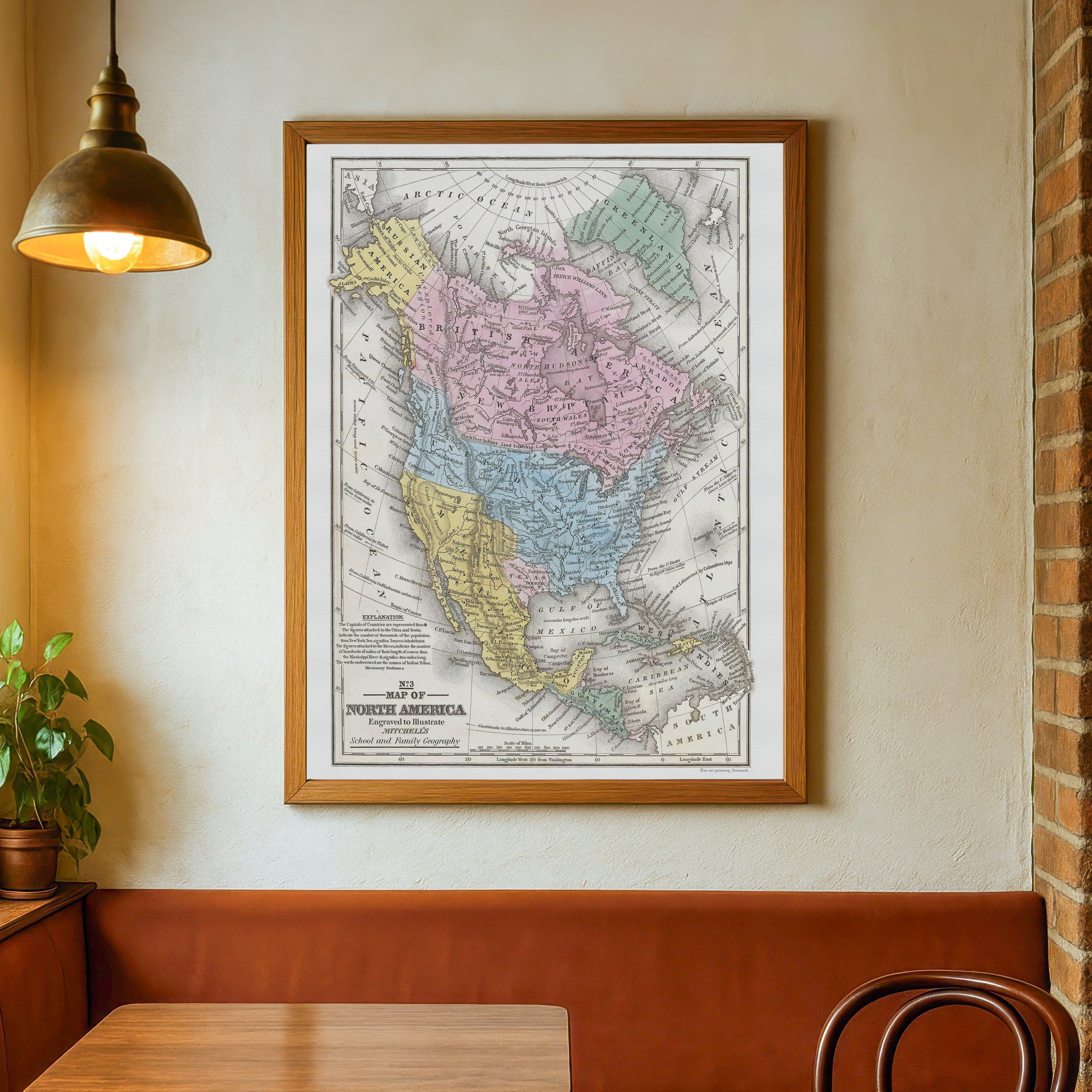 En gengivelse af Nordamerika, fra Mitchell's School and Family Geography, 1839.