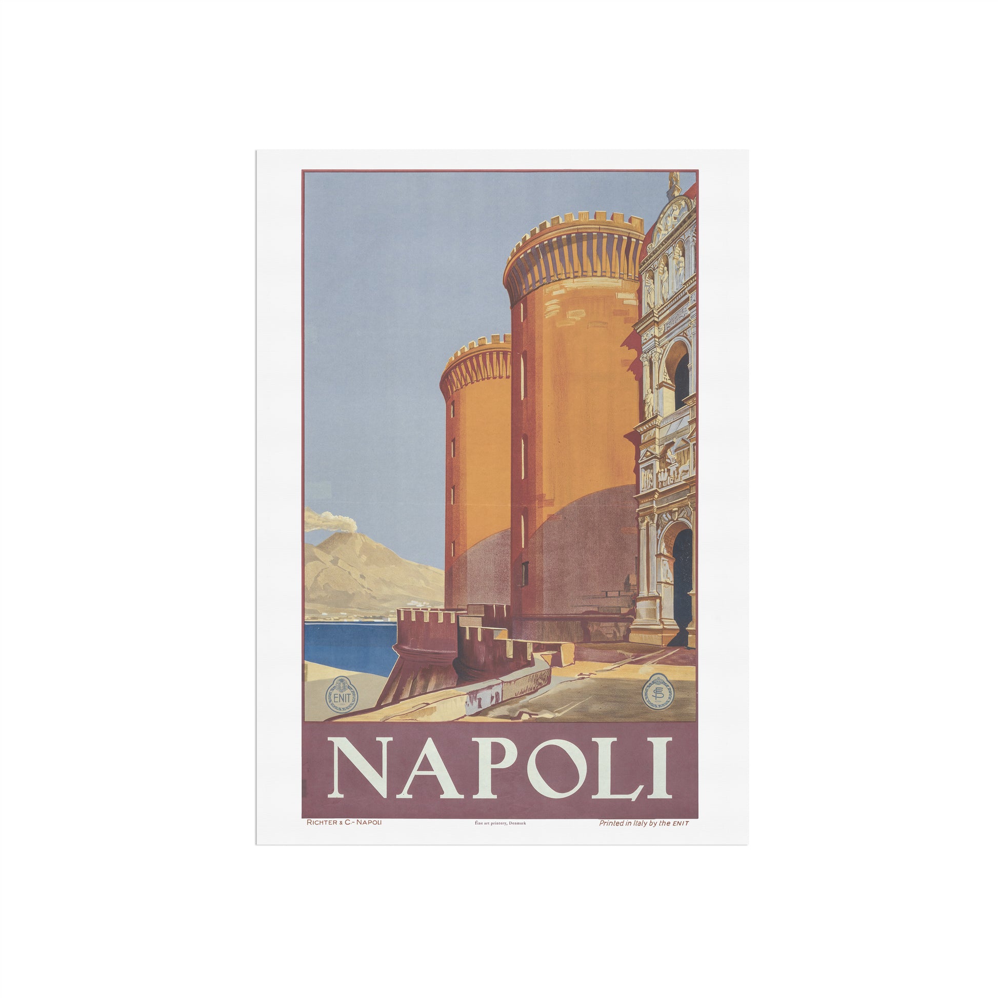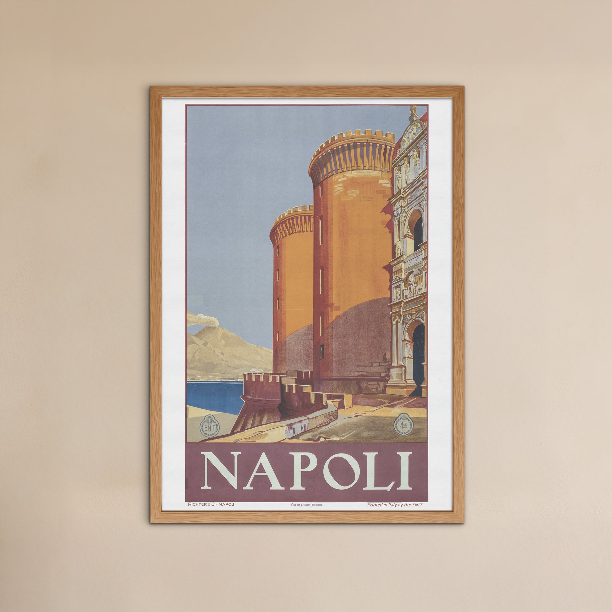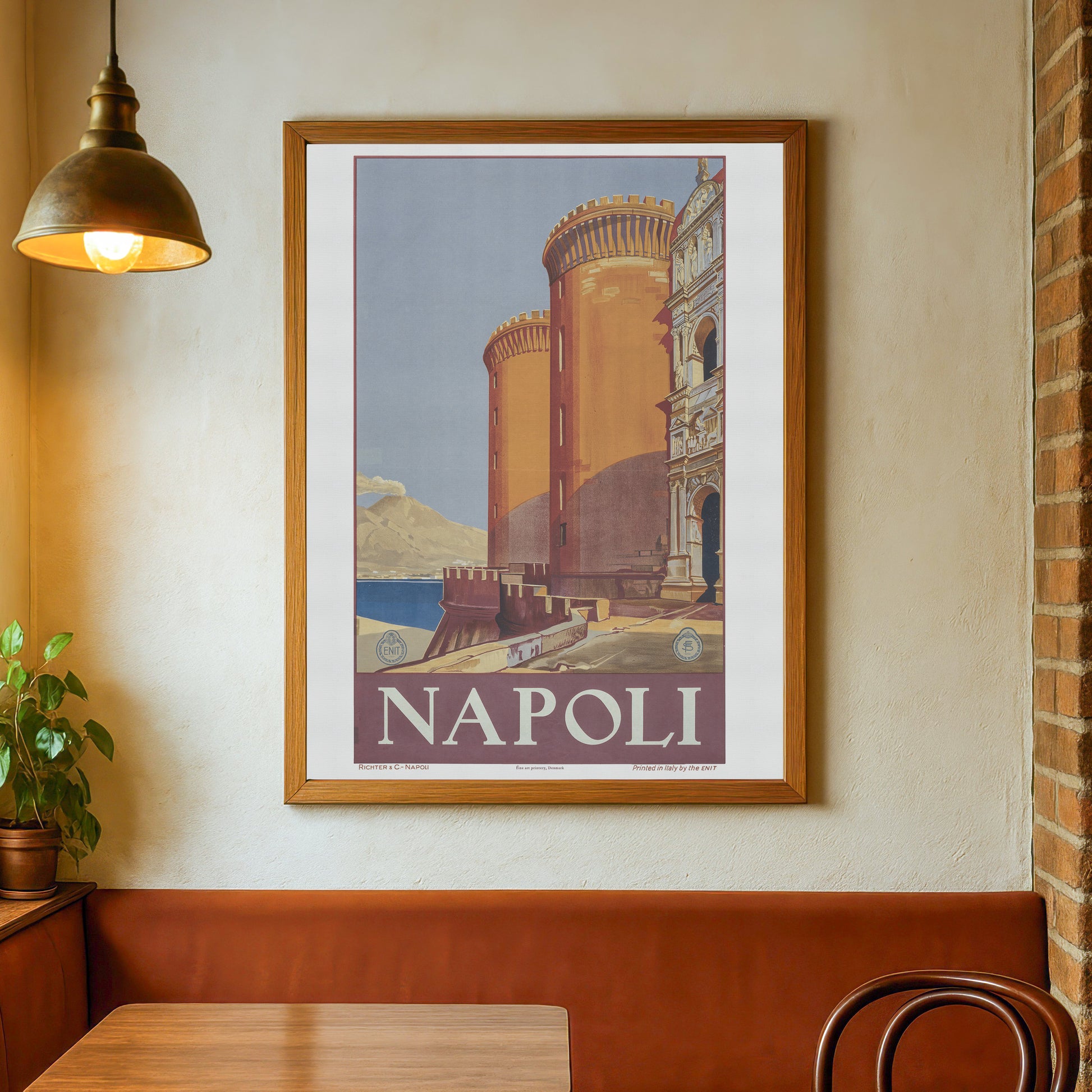 Napoli er en by fyldt med historie og skønhed. En pulserende italienske by, der lokker rejsende til at udforske dens vidundere. Plakaten her transporterer os tilbage i tiden og inviterer os til at forestille os, at vi står på den gammel fæstning Castel Nuovo, og stirrer på den skønne udsigt over den maleriske bugt ved Napoli. med Vesuv i baggrunden. Det er en scene, der virkelig tager pusten fra dig og efterlader et varigt indtryk på enhver, der er heldig nok til at være vidne til den.