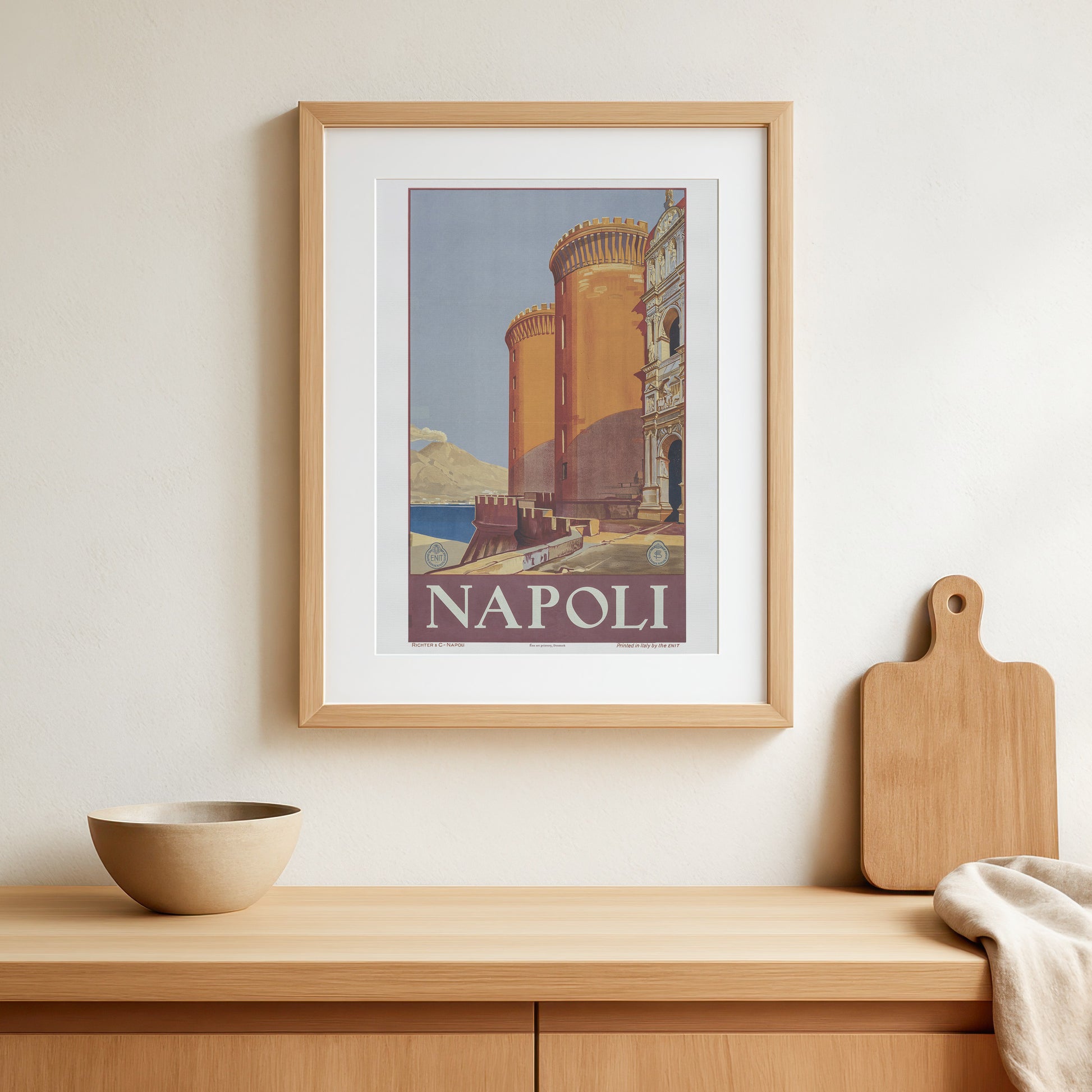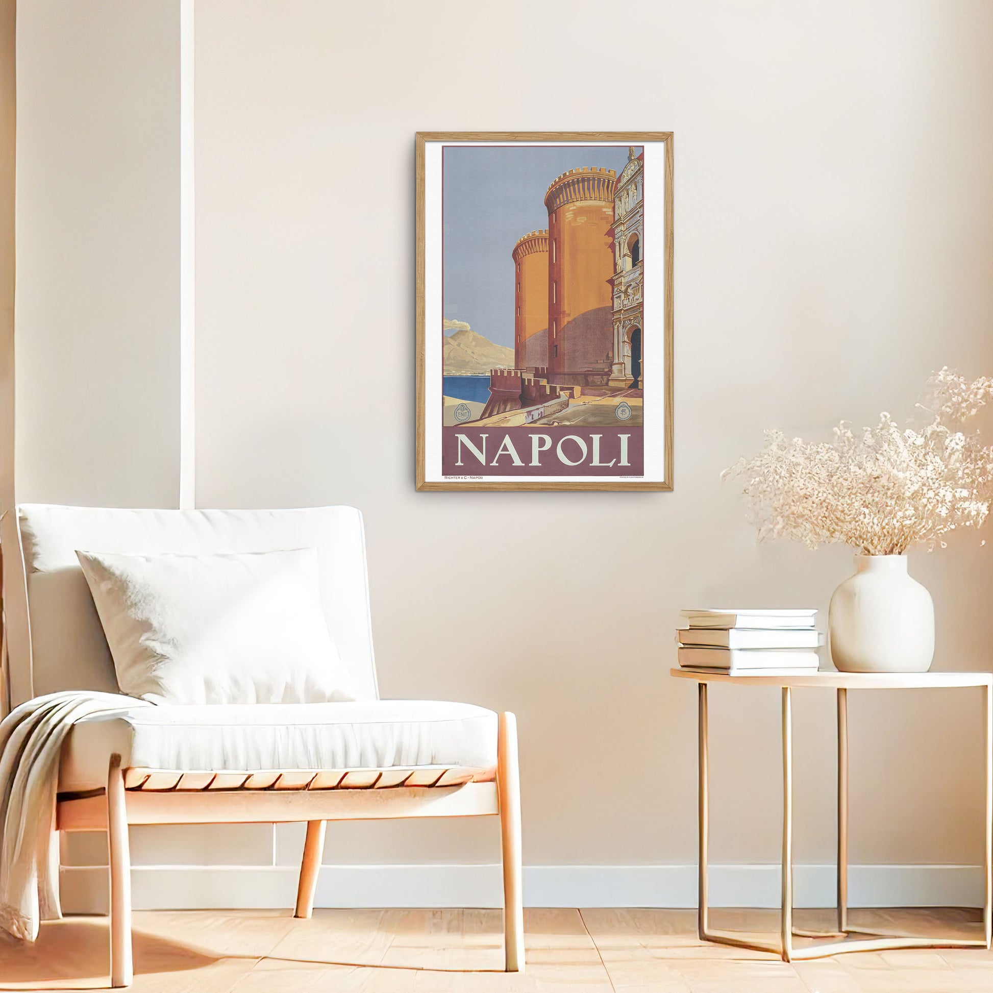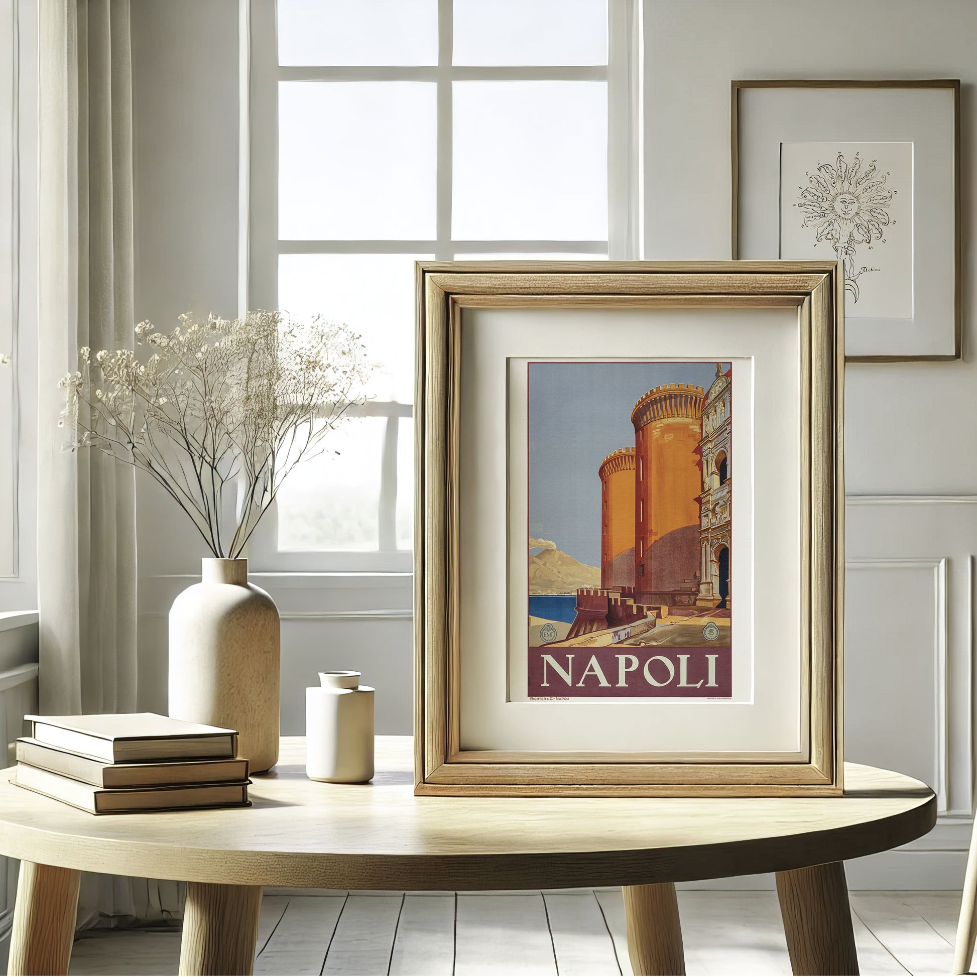 Napoli er en by fyldt med historie og skønhed. En pulserende italienske by, der lokker rejsende til at udforske dens vidundere. Plakaten her transporterer os tilbage i tiden og inviterer os til at forestille os, at vi står på den gammel fæstning Castel Nuovo, og stirrer på den skønne udsigt over den maleriske bugt ved Napoli. med Vesuv i baggrunden. Det er en scene, der virkelig tager pusten fra dig og efterlader et varigt indtryk på enhver, der er heldig nok til at være vidne til den.