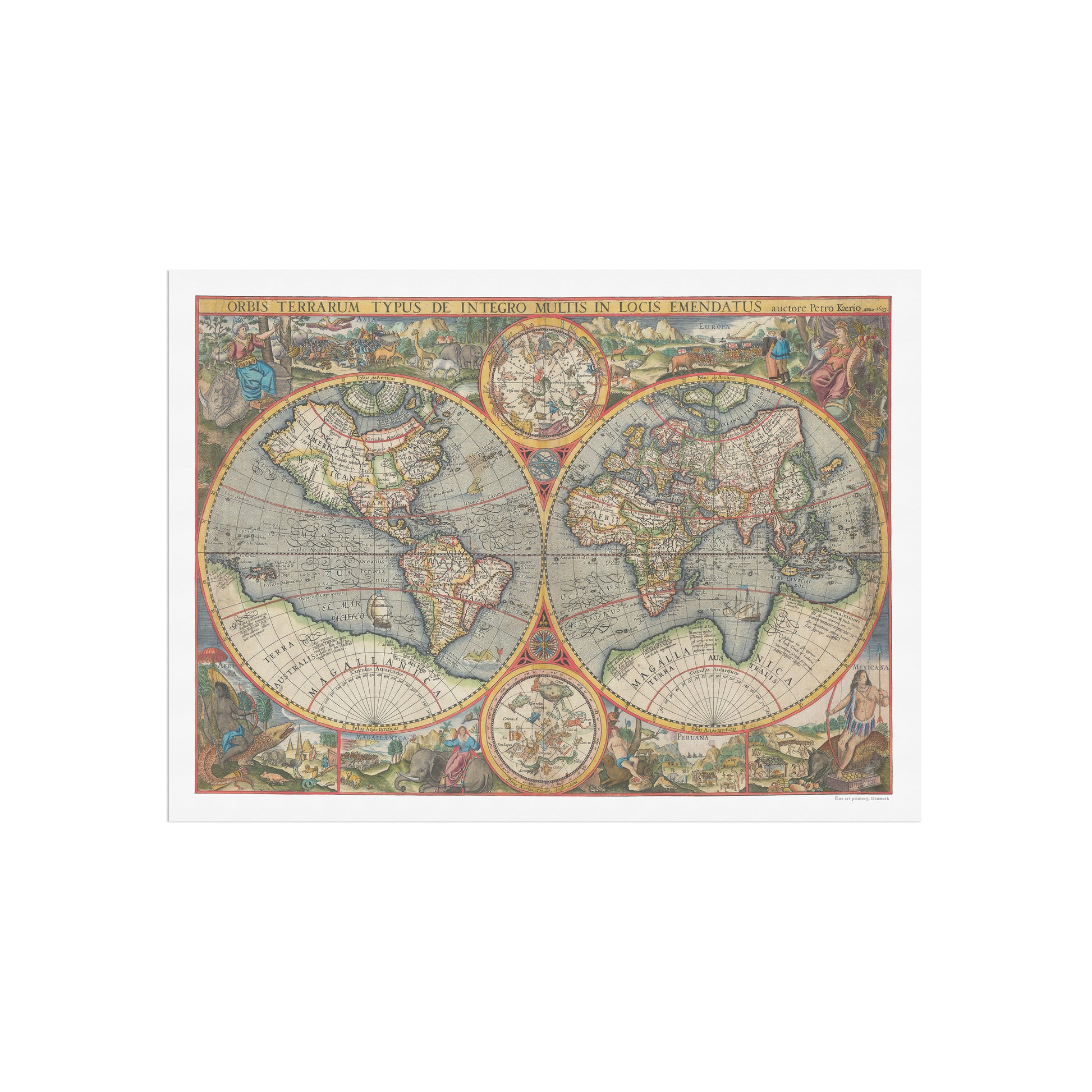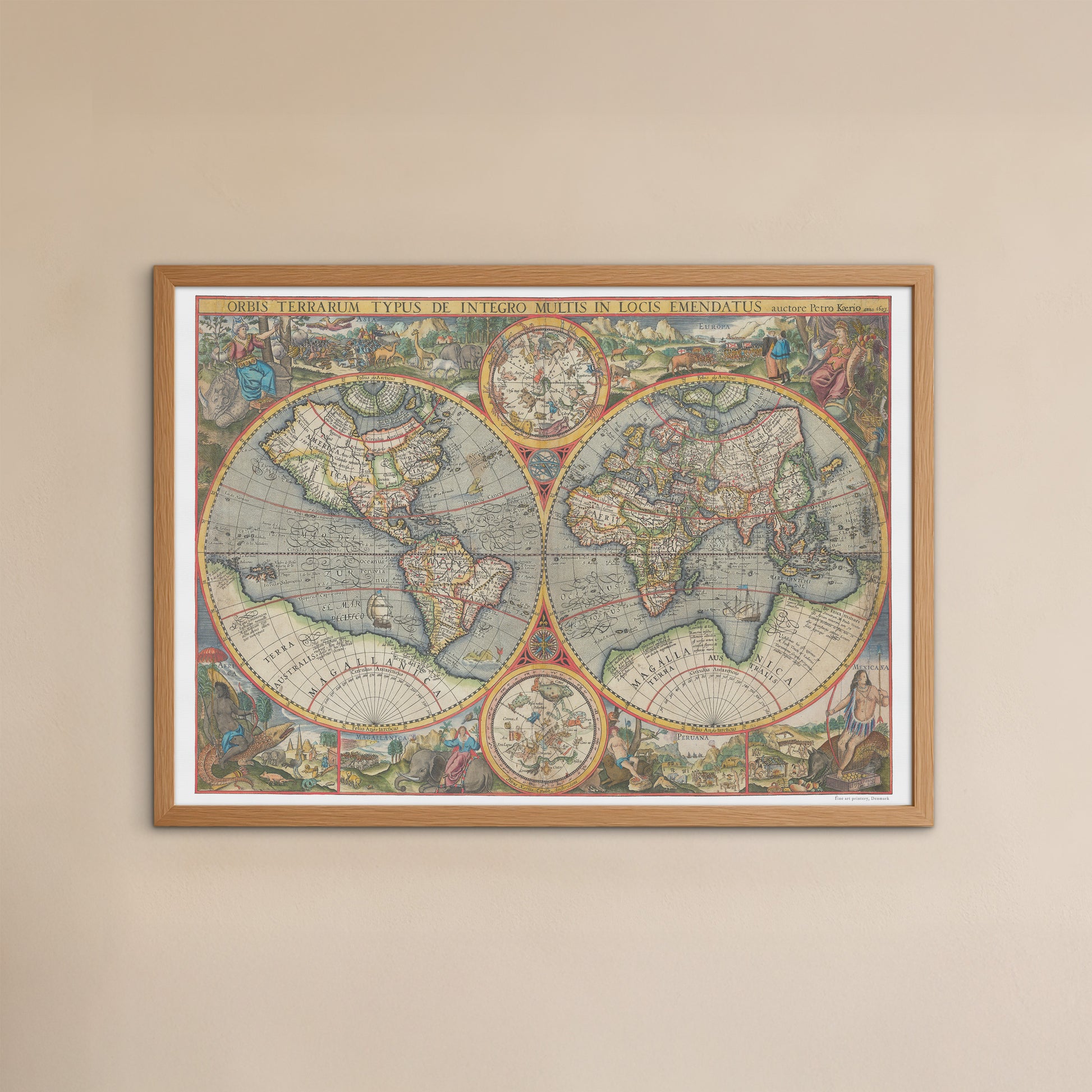 Et smukt og detaljeret verdenskort med titlen ‘Orbis Terrarum Typus De Integro Multis In Locis Emendatus’. Denne genskabelse er baseret på Petrus Kaerius’ ekstremt sjældne 1607 udgave af et dobbelt halvkugle verdenskort, som han byggede på Petrus Plancius’ kort fra 1594.