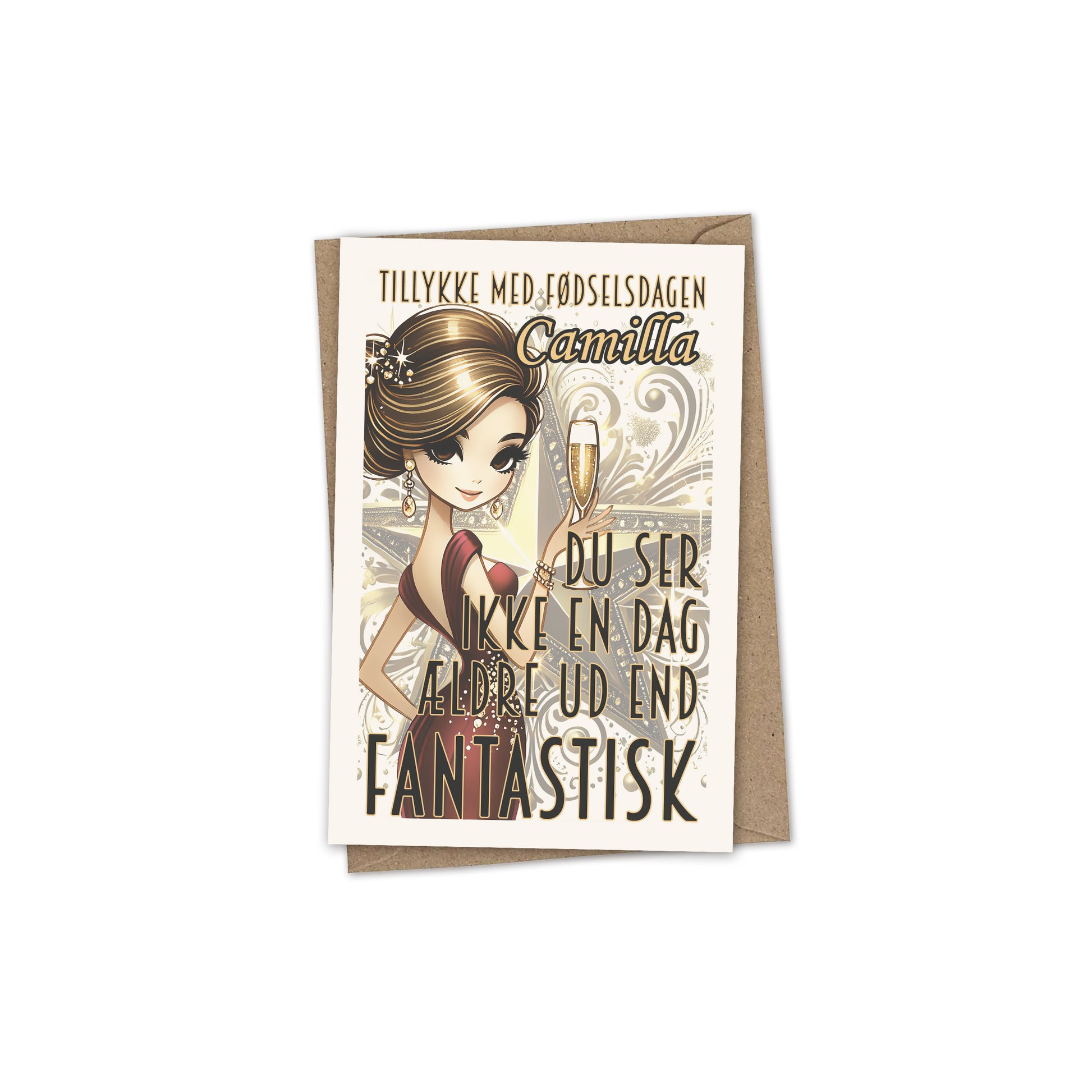 Gør fødselsdagen uforglemmelig med dette glamourøse fødselsdagskort i størrelsen 10x15 cm. Kortet prydes af den festlige hilsen “Du ser ikke en dag ældre ud end fantastisk” og kan personaliseres med modtagerens navn, så det bliver en helt særlig gave.