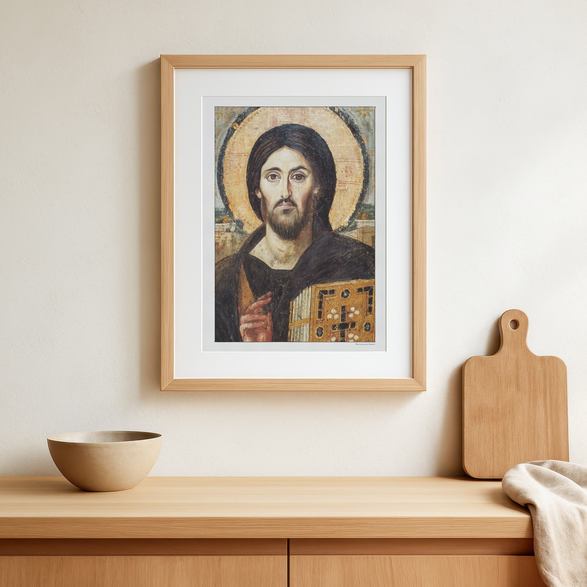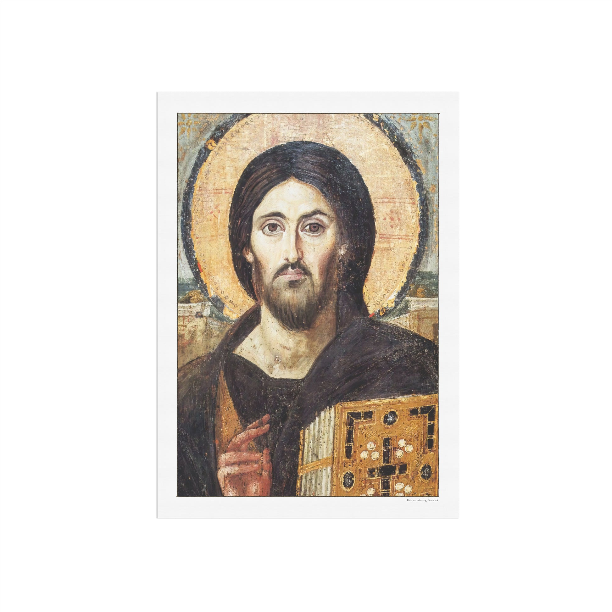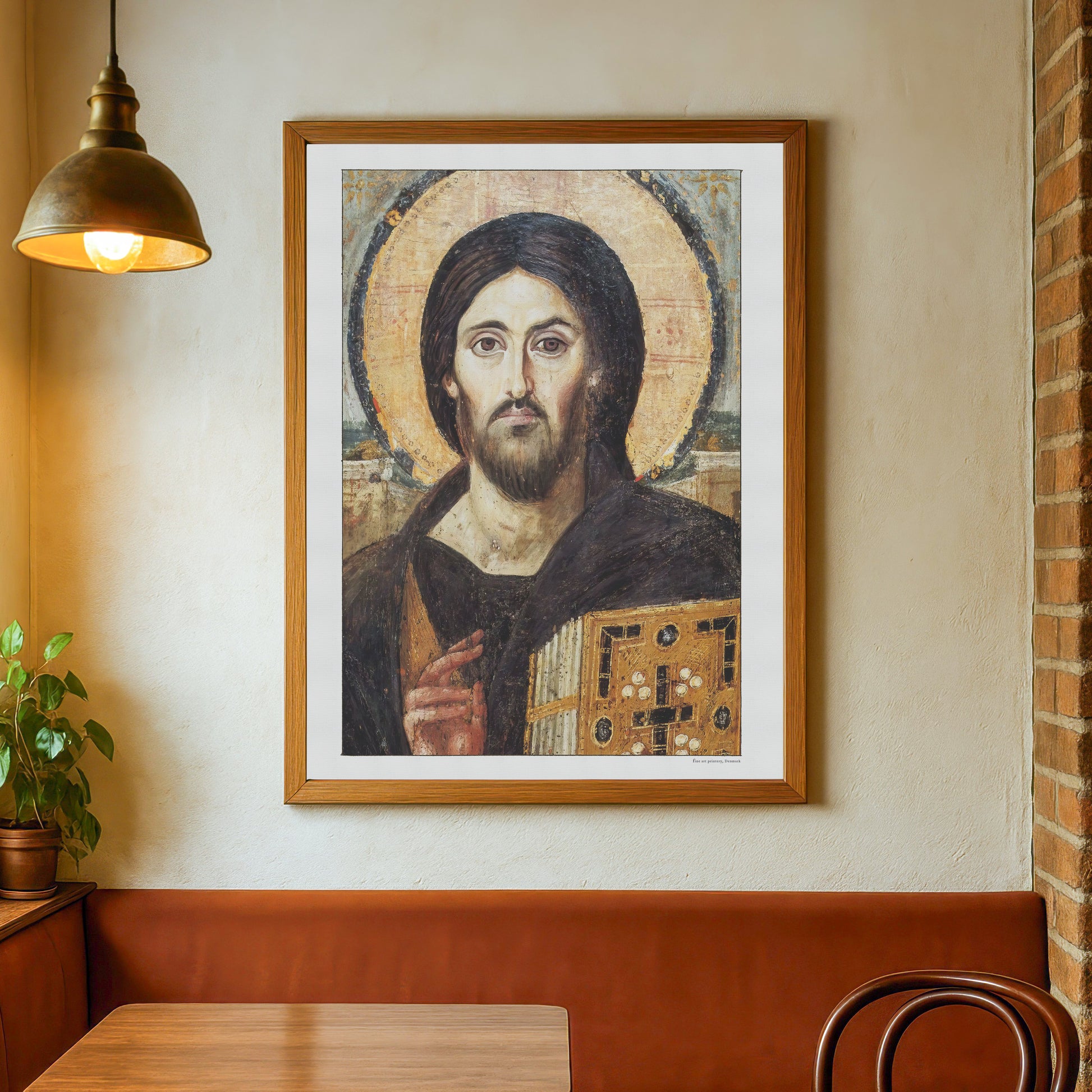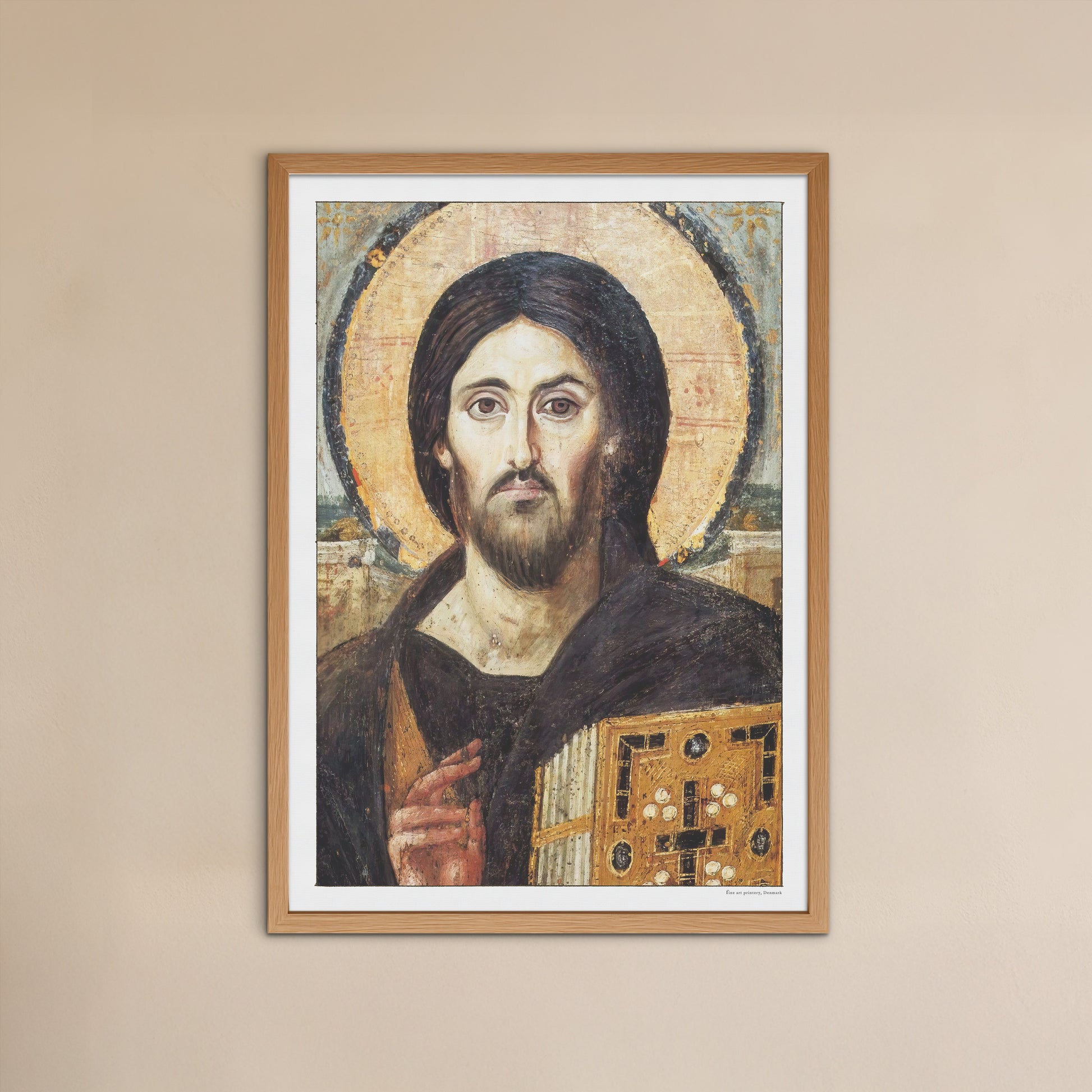 Plakatversionen af det ikoniske portræt af Jesus Kristus Pantocrator, der menes at dateres tilbage til det 6. århundrede, og befinder sig i Sankt Katharinas Kloster ved foden af Sinaibjerget.