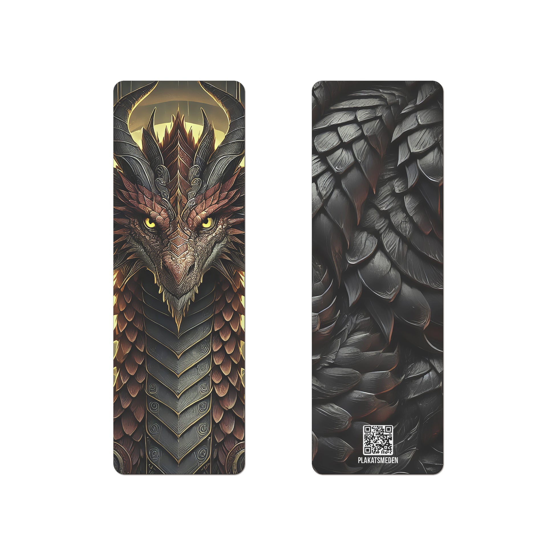 Dette bogmærke fremviser en kraftfuld rødbrun drage med intense, gyldne øjne og en næsten panseragtig, sort bug. Dragens skæl gløder i nuancer af kobber og mørk bronze. Den stirrer direkte frem med en blanding af årvågenhed og styrke, som om den vogter over noget dyrebart.