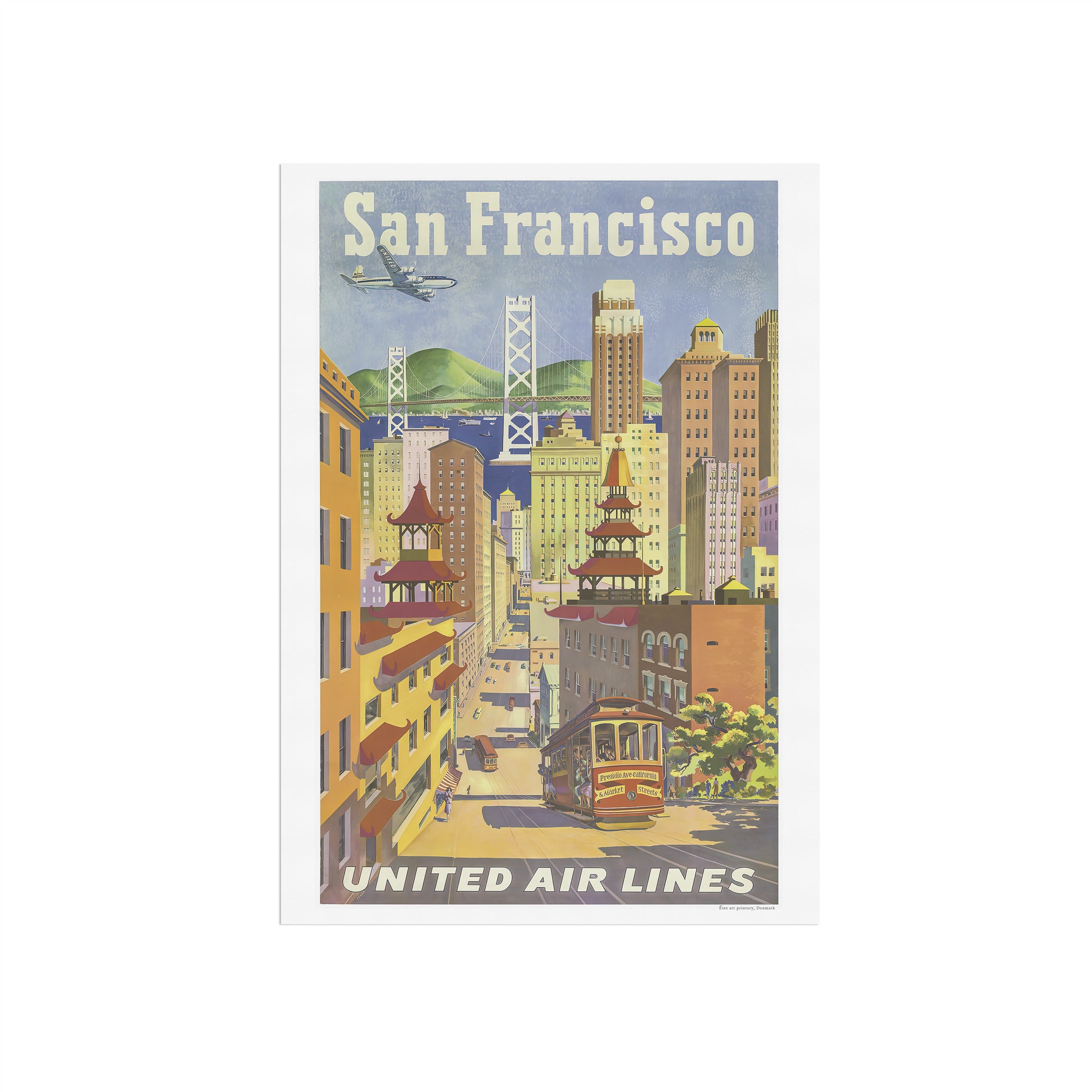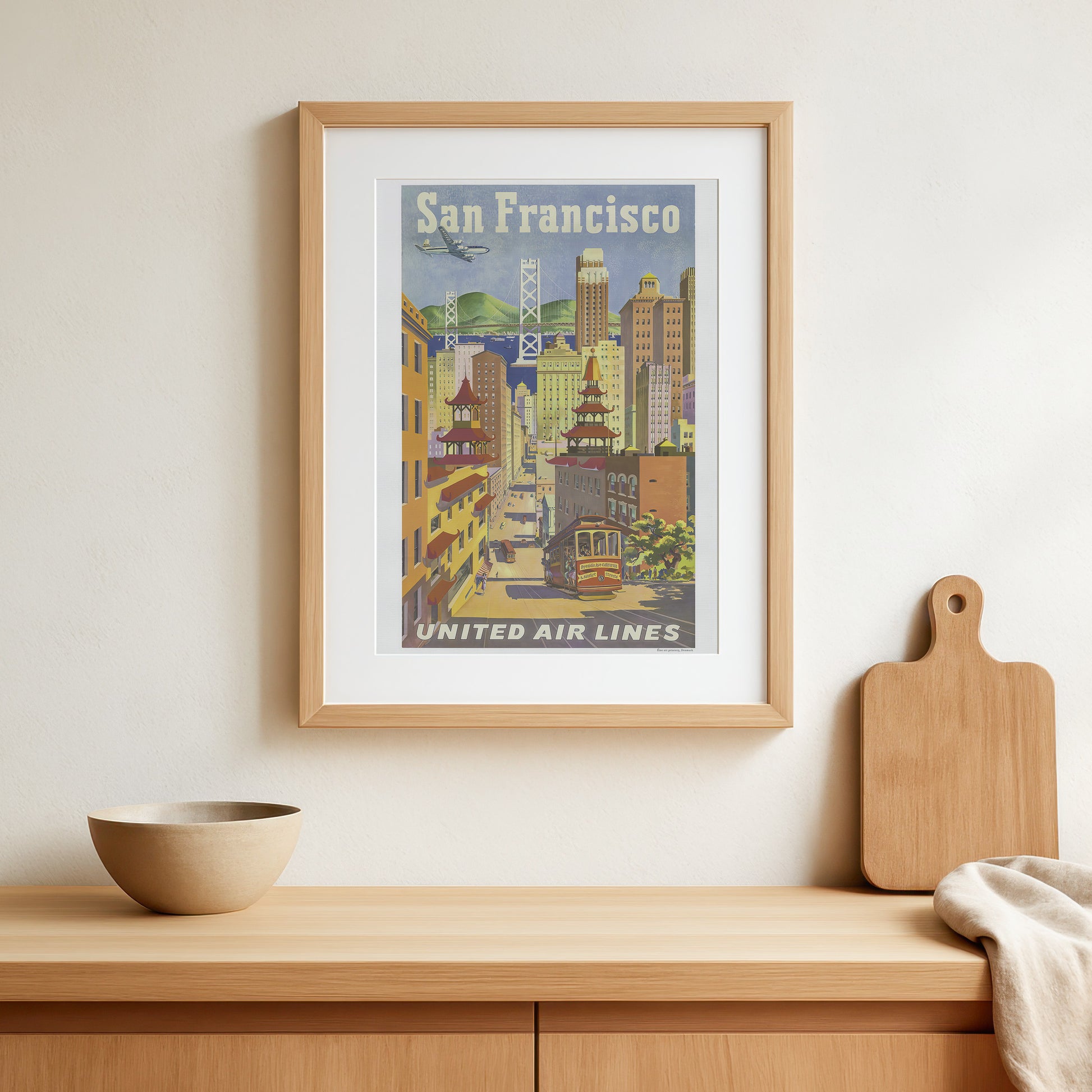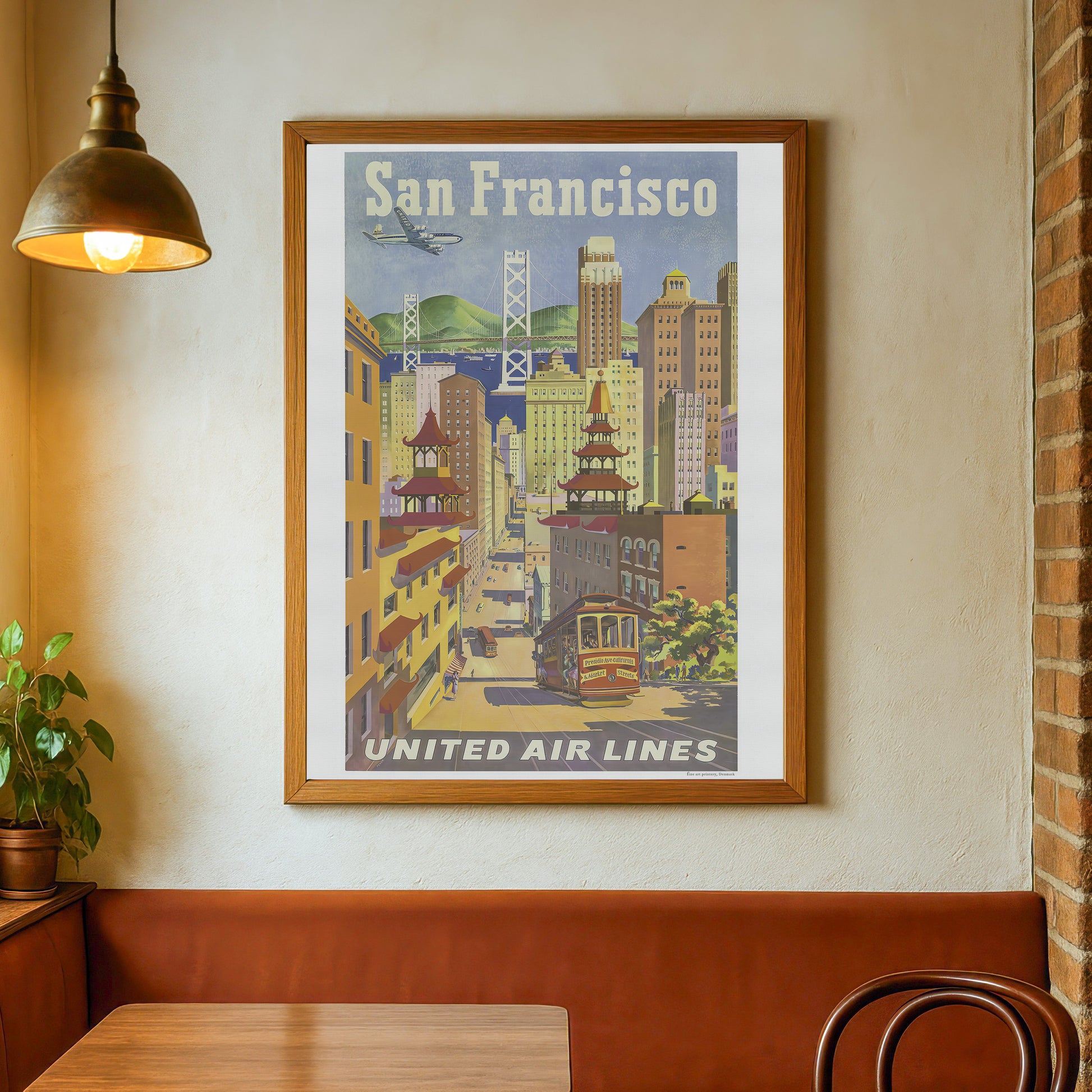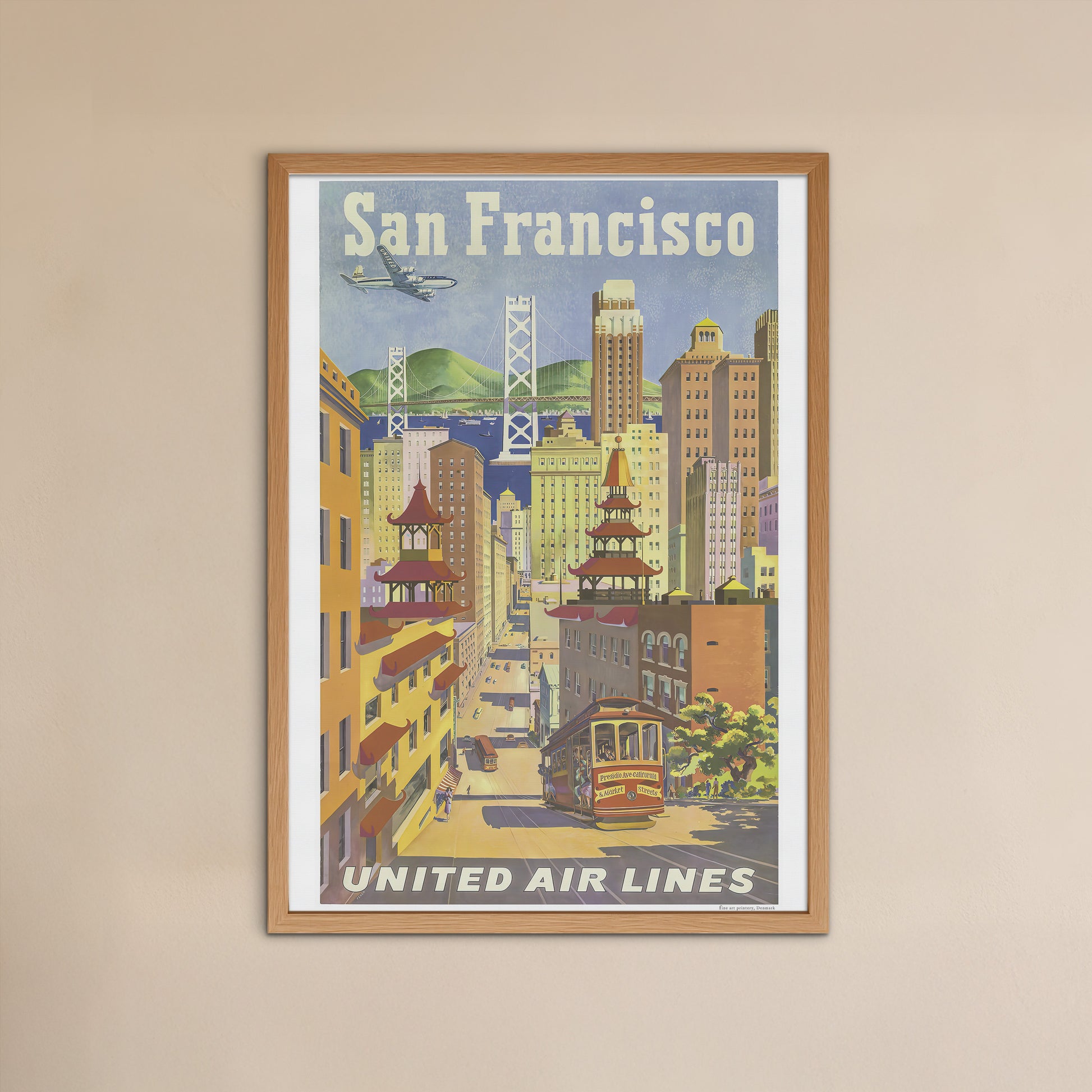 En fantastisk vintage San Francisco rejseplakat fra United Air Lines. Plakaten har alle de ikoniske vartegn og attraktioner, du kender og elsker, såsom Golden Gate og sporvognen. Art deco-stilen giver den en levende og charmerende stemning, der perfekt fanger essensen af San Francisco.