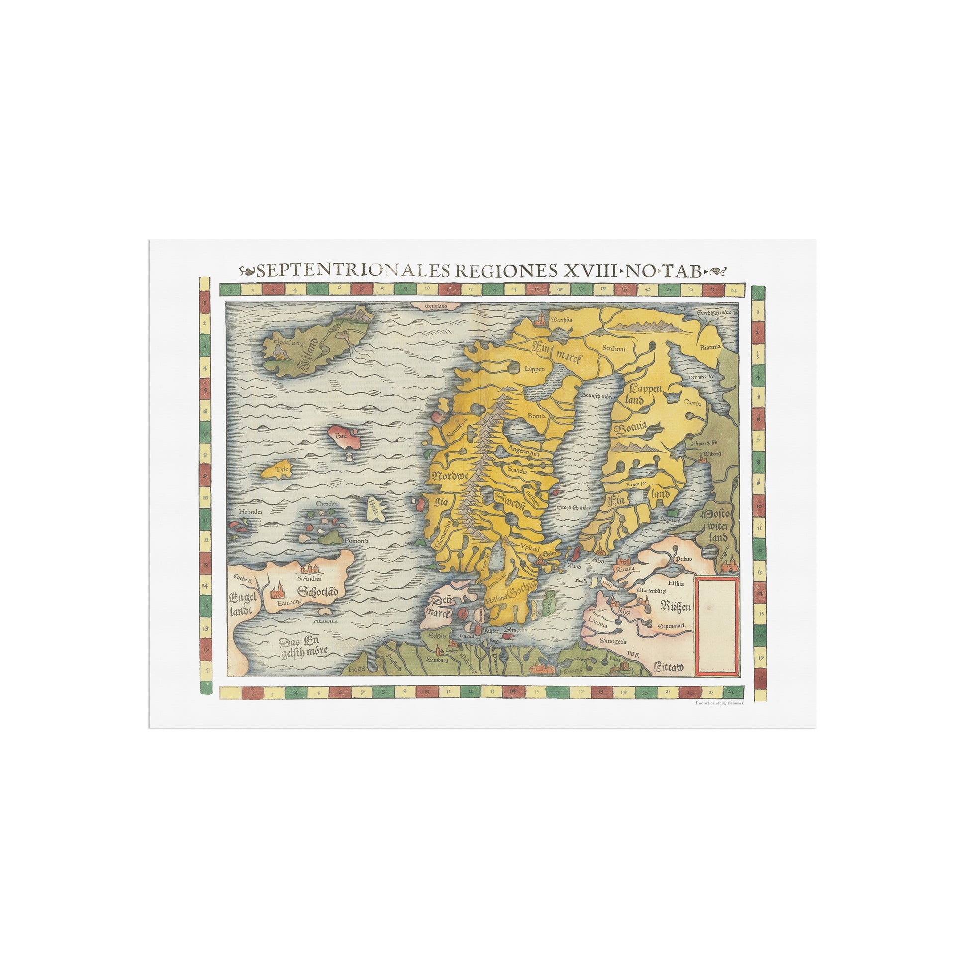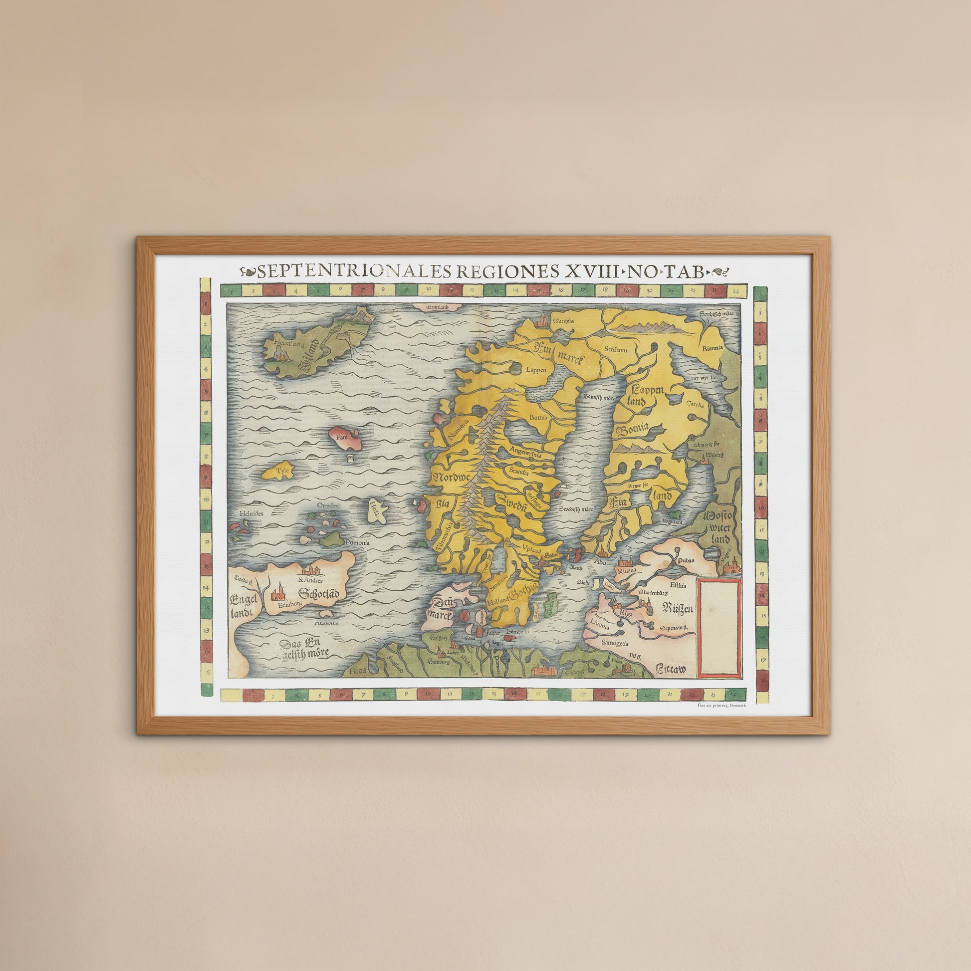 En smuk genskabelse af Sebastian Munsters kort over Skandinavien, indeholdende Danmark, Norge, Sverige, Island, Skotland, Færøerne og Finland. Sebastian Munster lavede flere opdateringer af kortet, og kortet som dette er lavet på, Septentrionales Regiones XVIII No Tab, blev udgivet i 1552. Det latinske Septentrionales Regiones, kan oversættes til Nordlige Regioner.