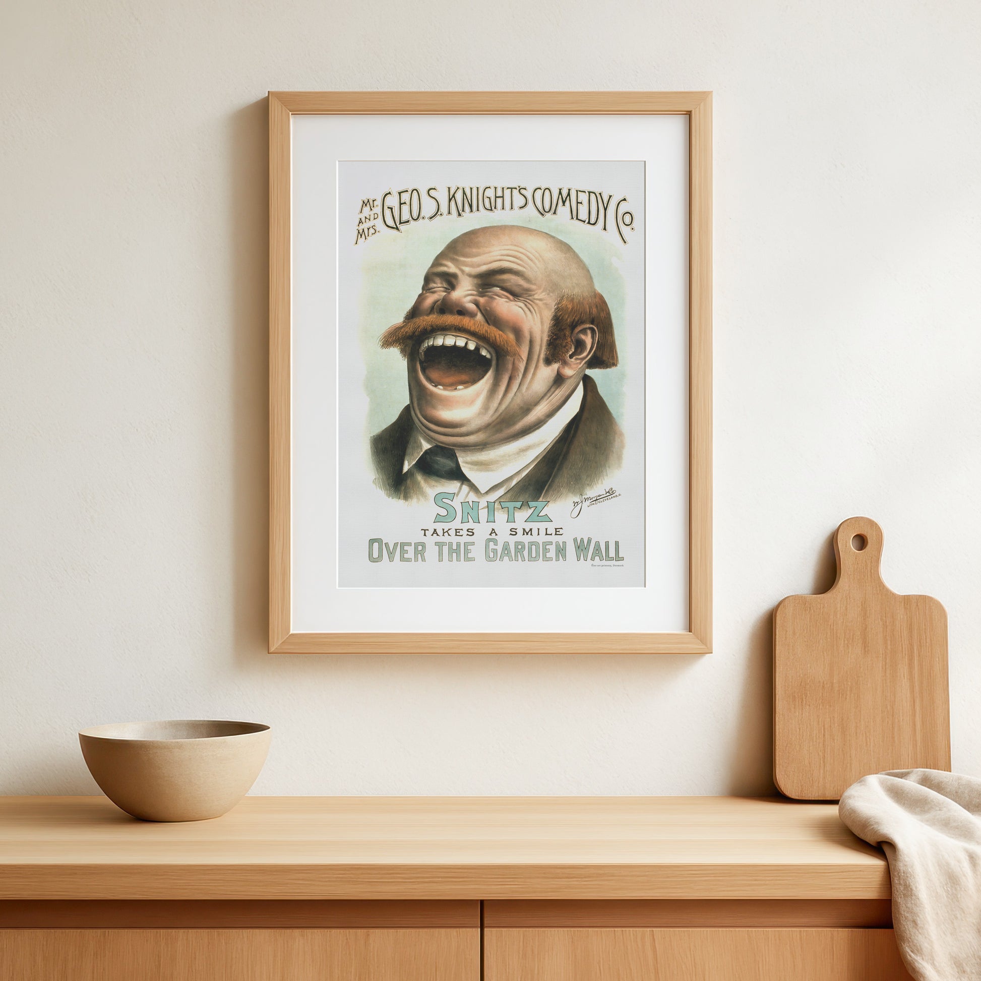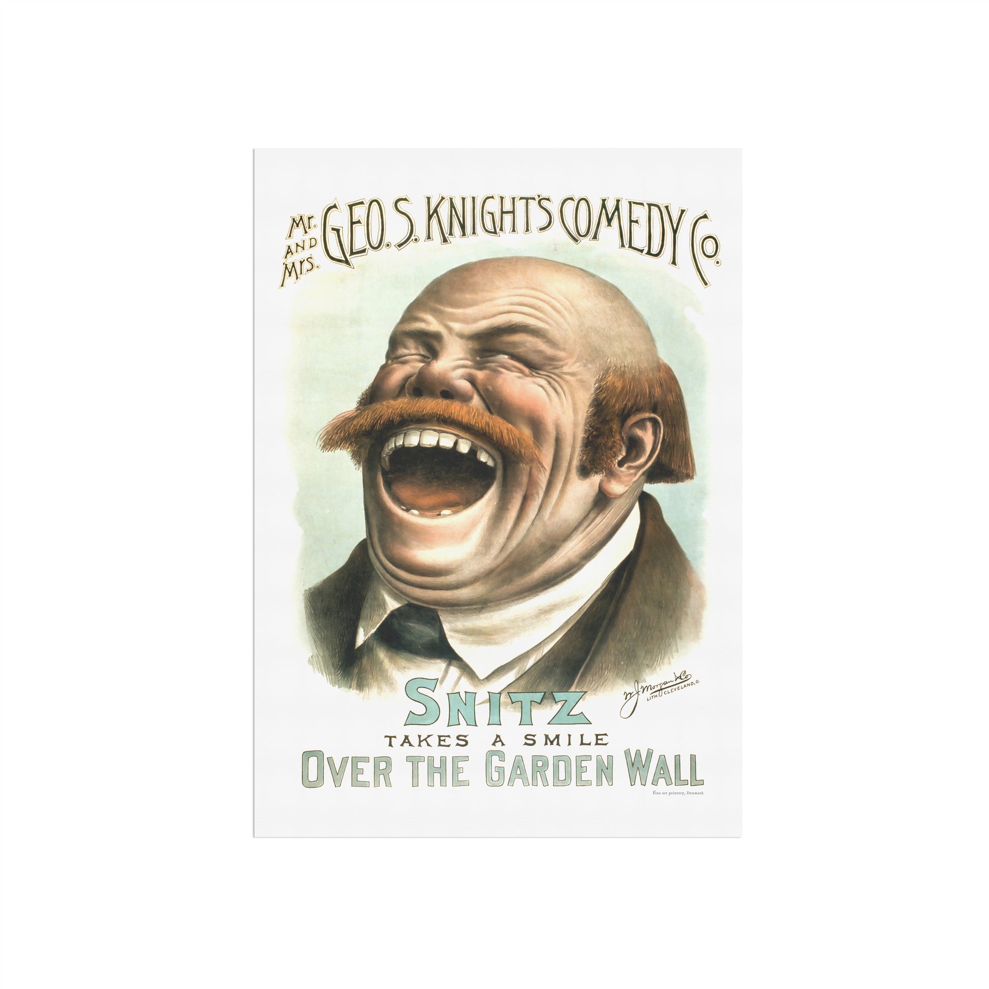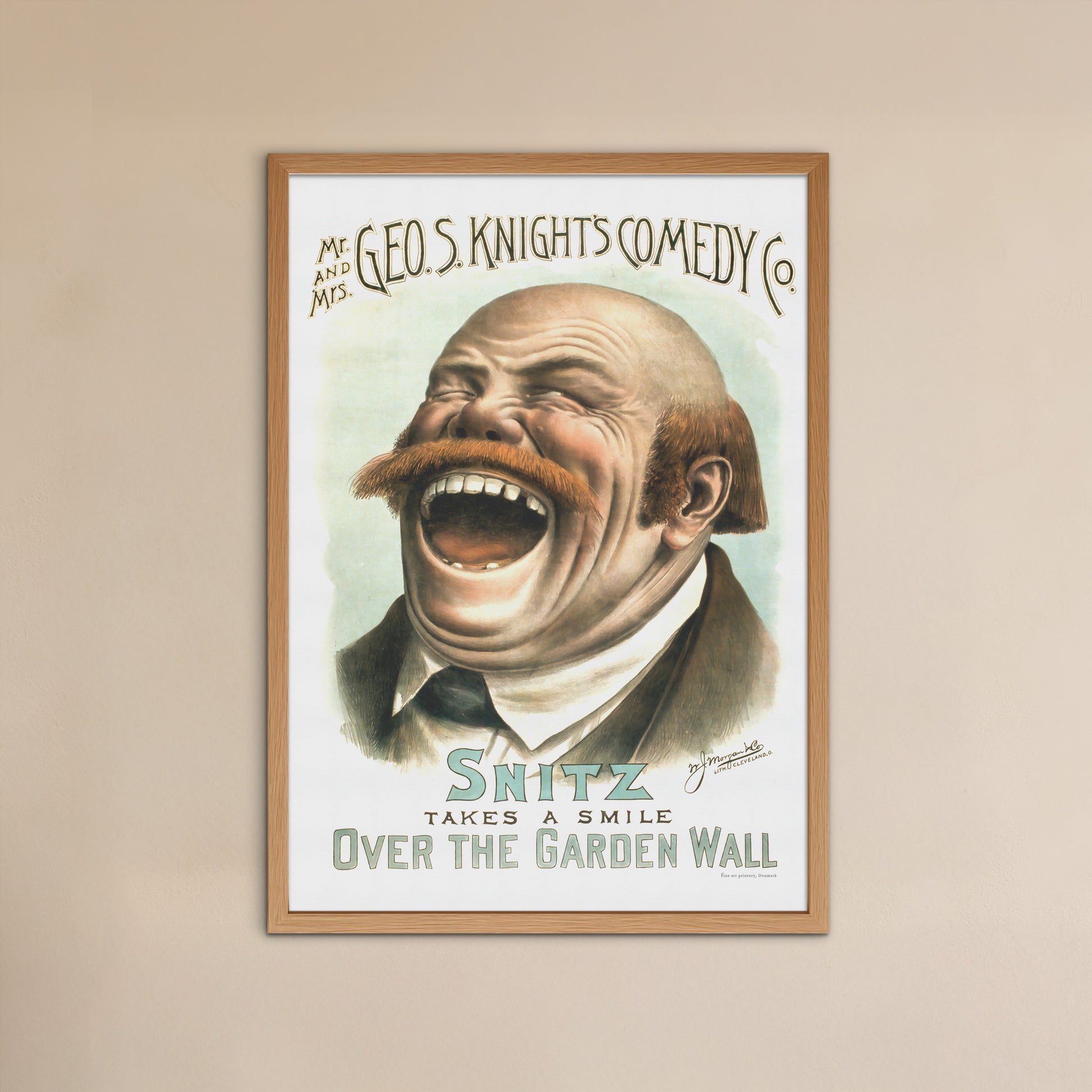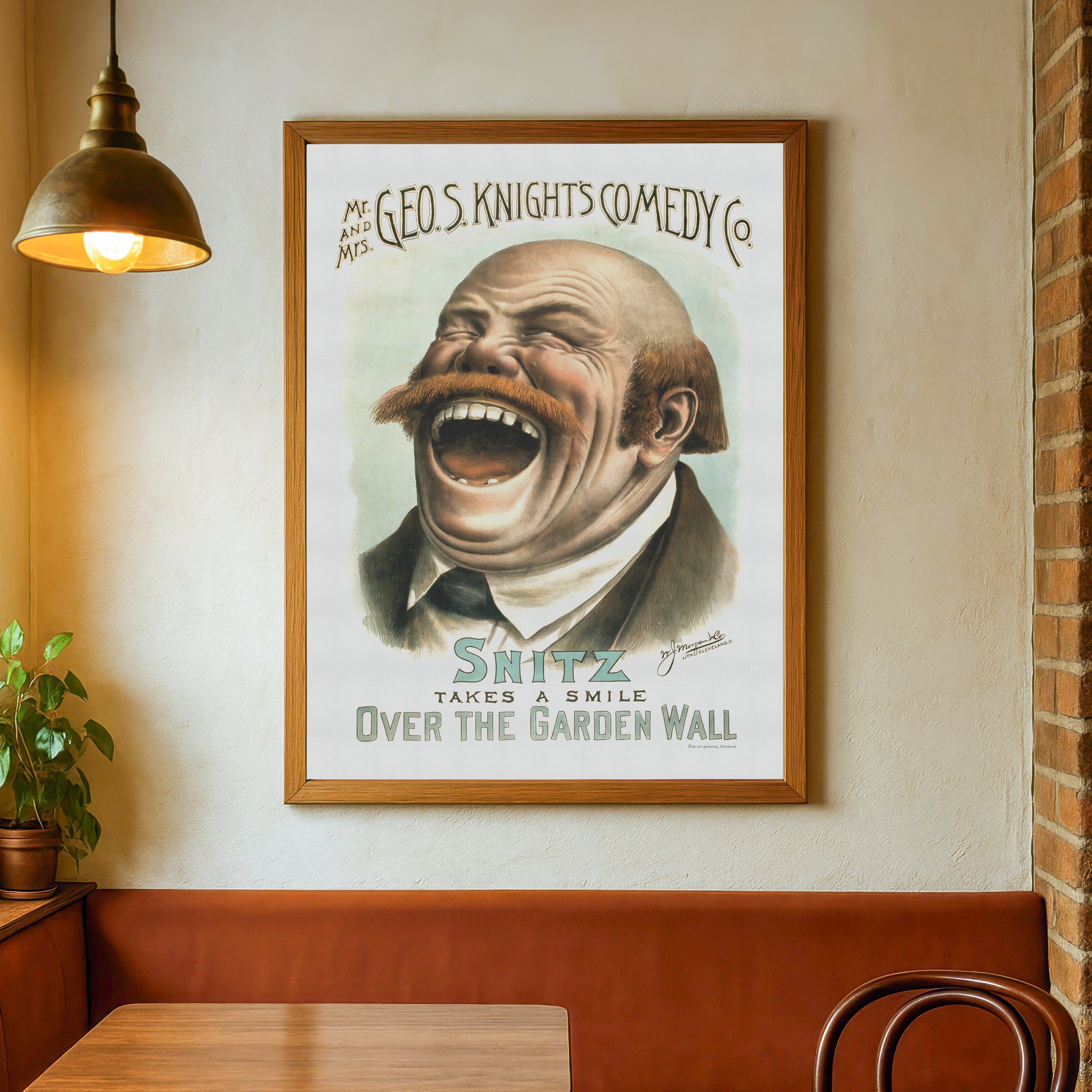 En gengivelse af den fantastiske teaterplakat fra 1885, Mr. and Mrs. Geo. S. Knights Comedy Co. - Snitz takes a smile over the garden wall.