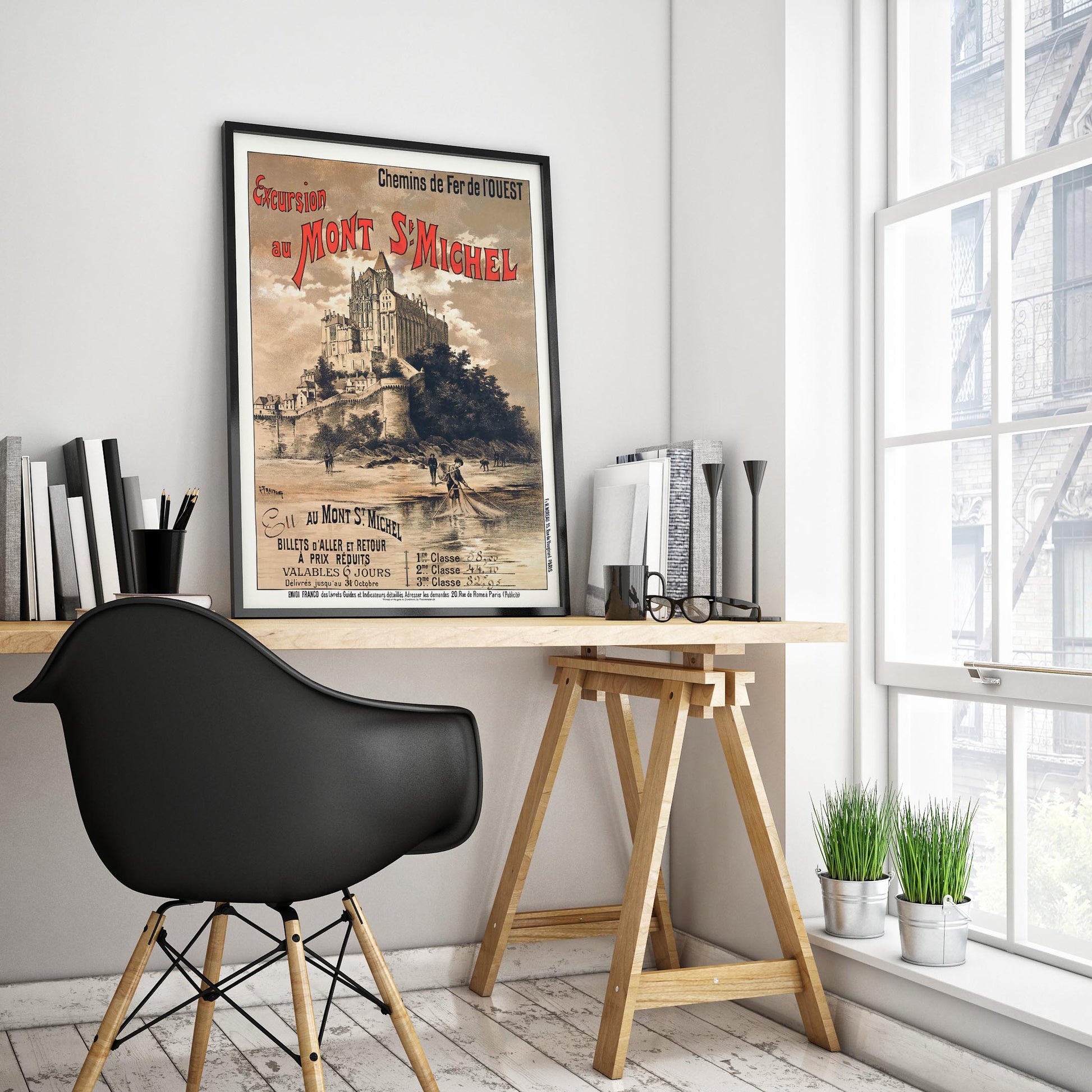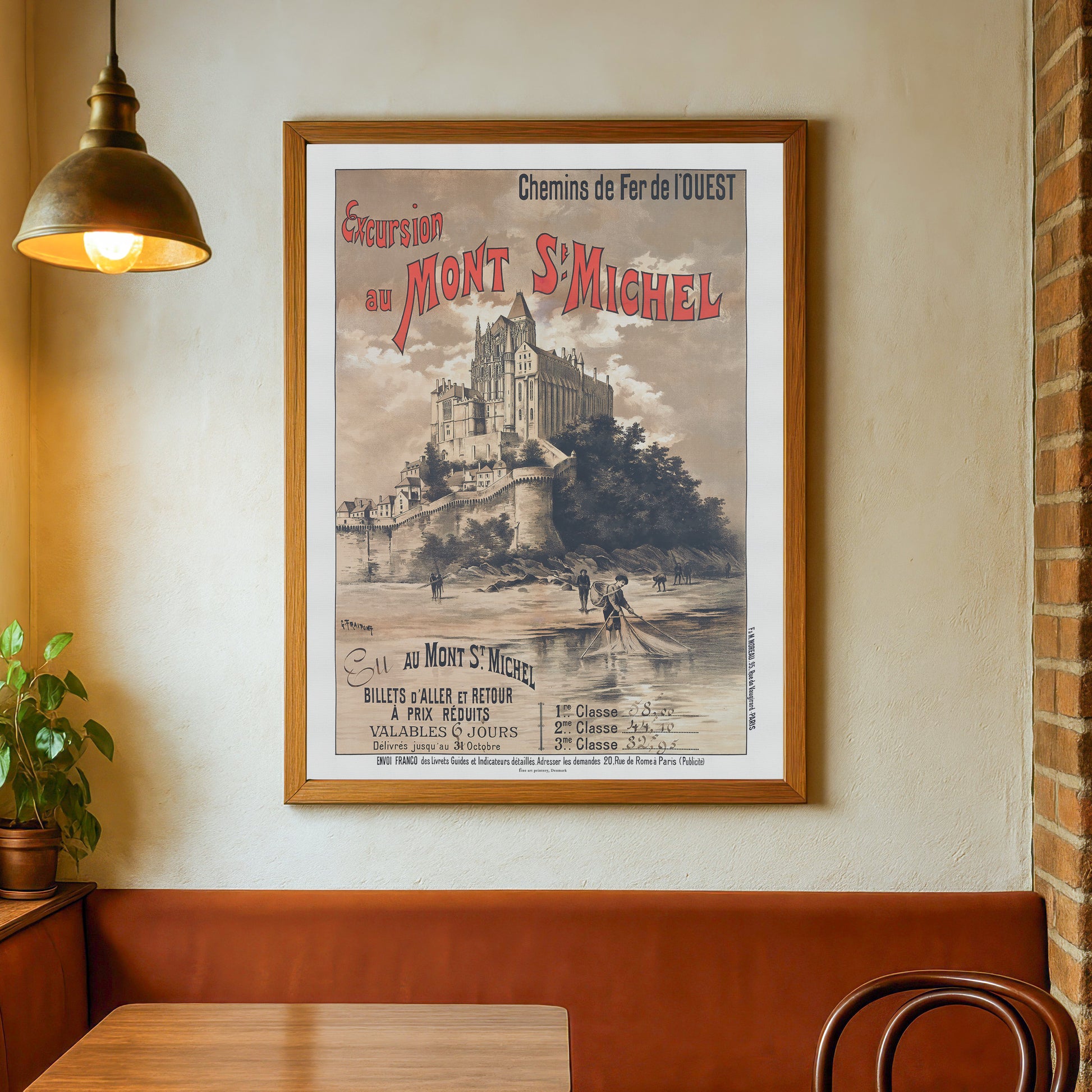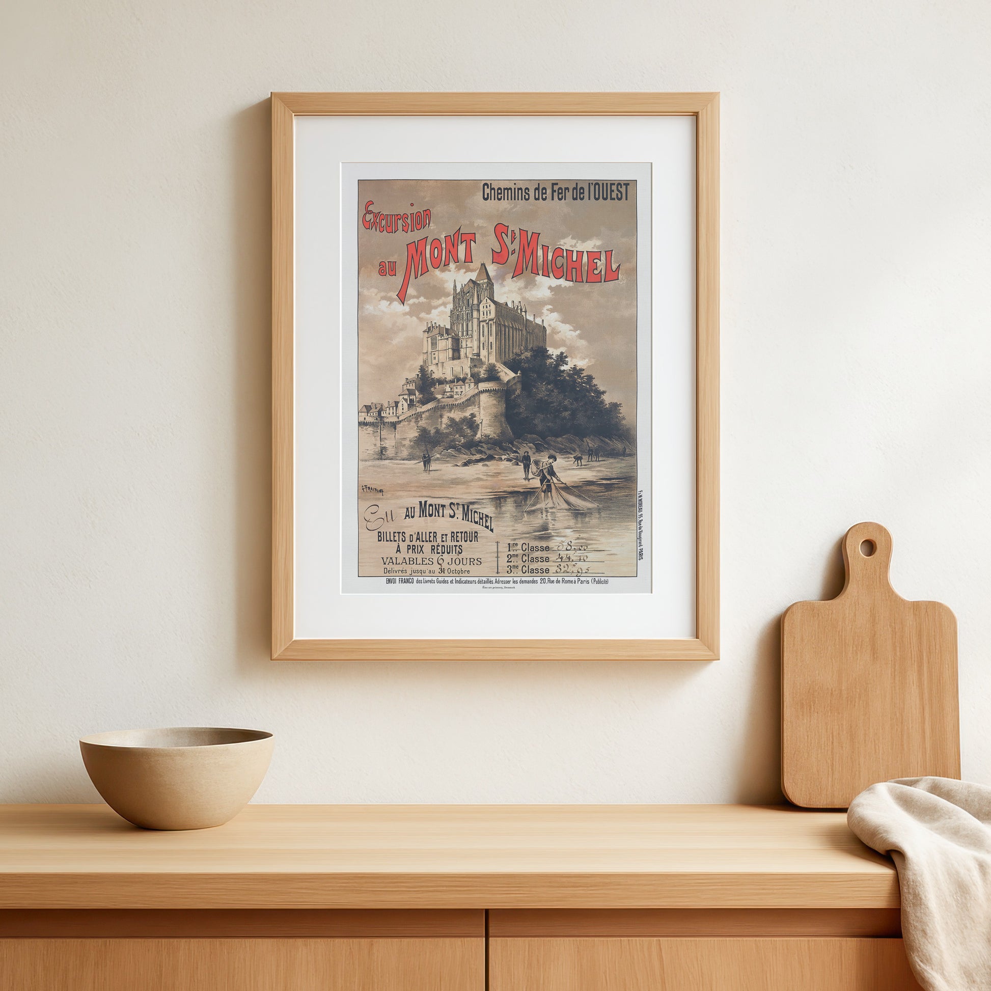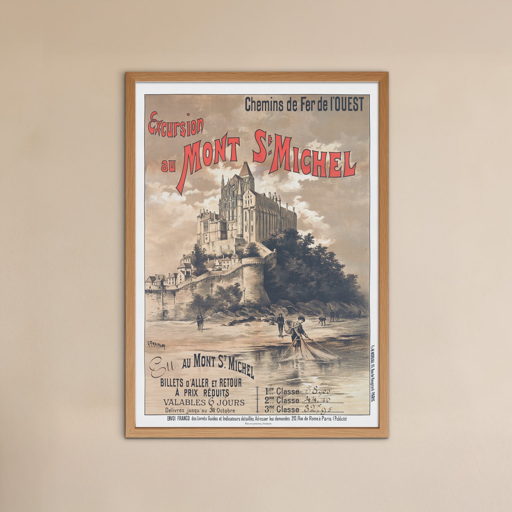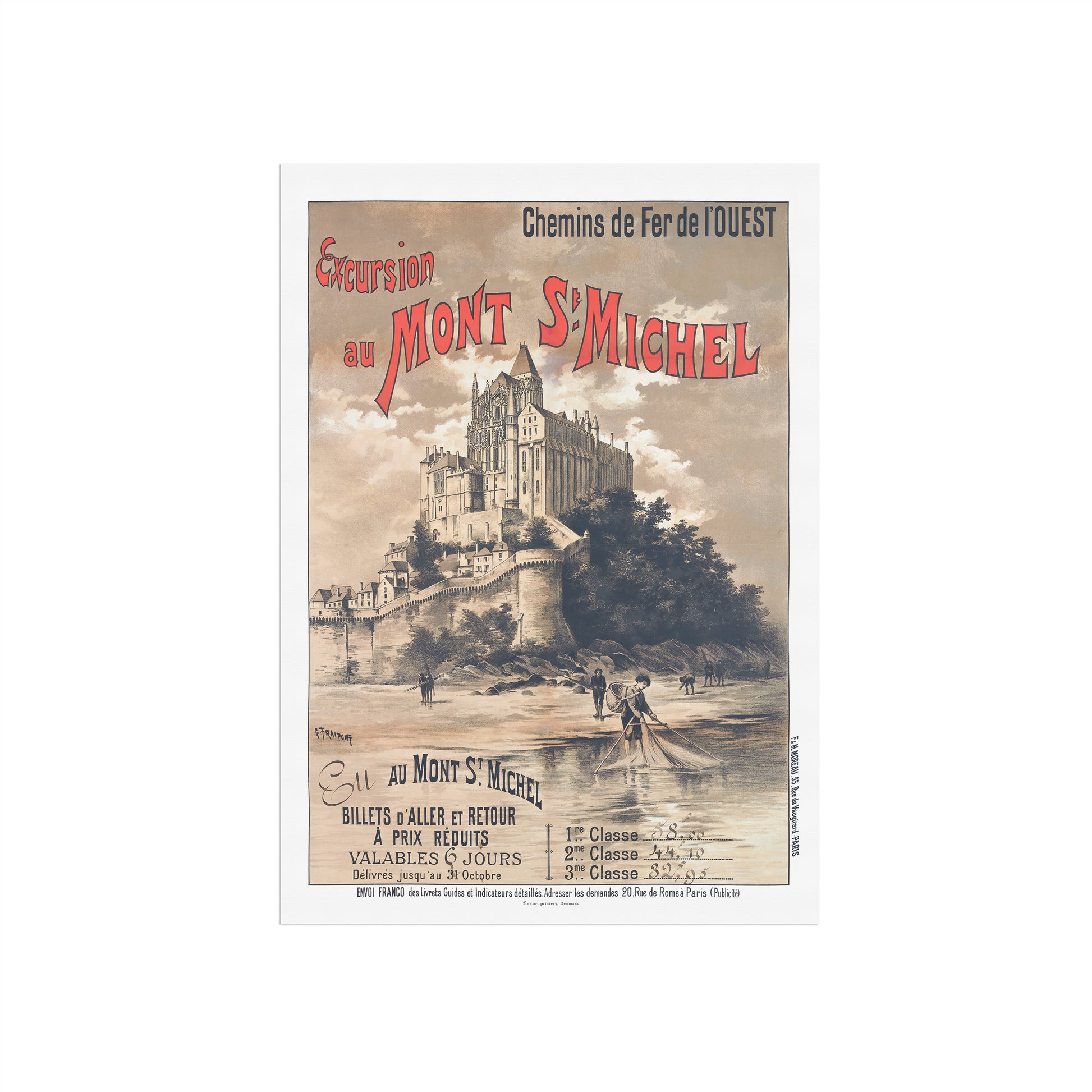 Oplev charmen ved slutningen af det 19. århundrede med denne smukke vintage rejseplakat, "Excursion au Mont St Michel" (Udflugt til Mont St Michel). På bestilling fra Chemins de Fer de l'Ouest (Det Vestlige Jernbaneselskab i Frankrig) for at fremme udflugter til det ikoniske Mont Saint-Michel, er rejseplakaten skabt af den berømte kunstner Gustave Fraipont,