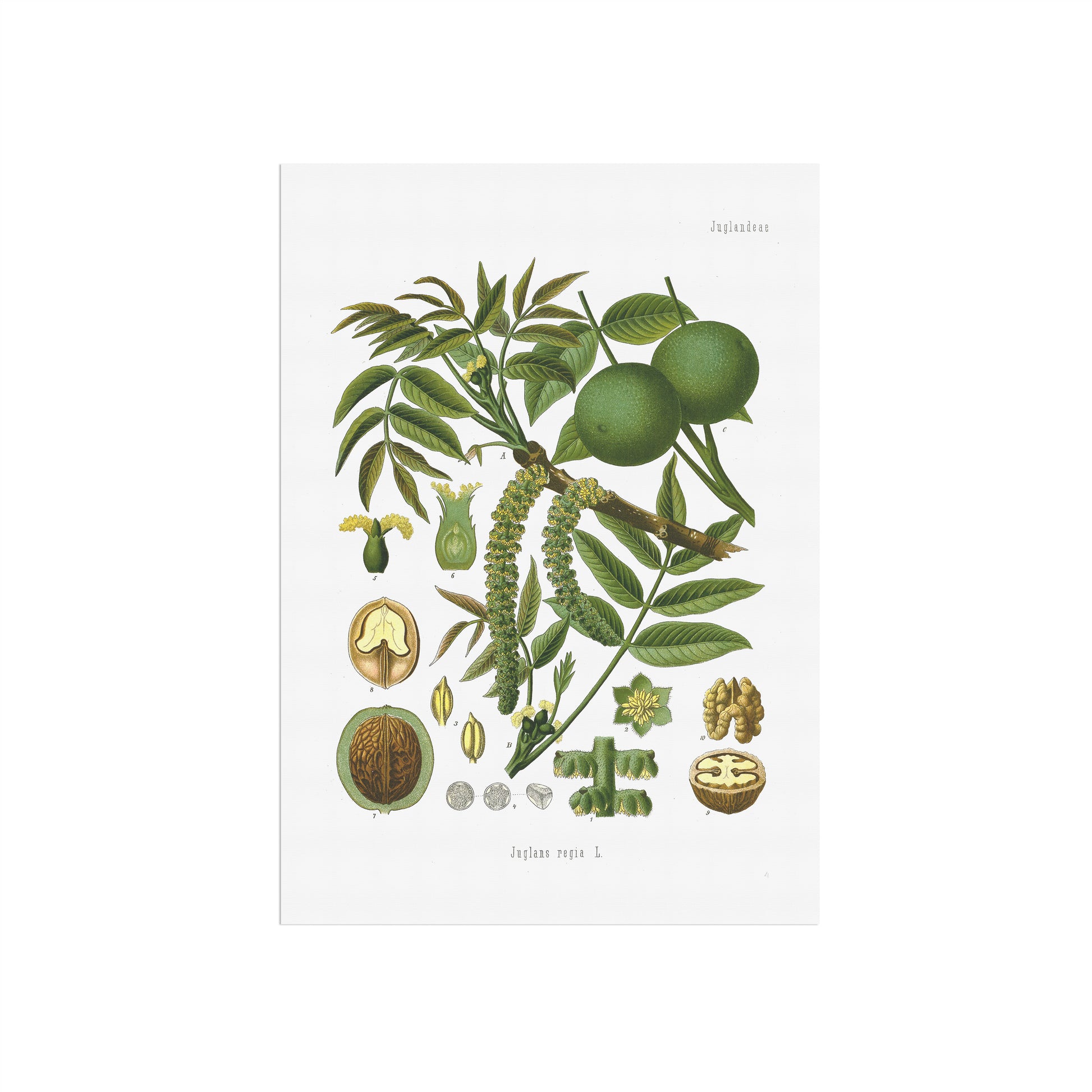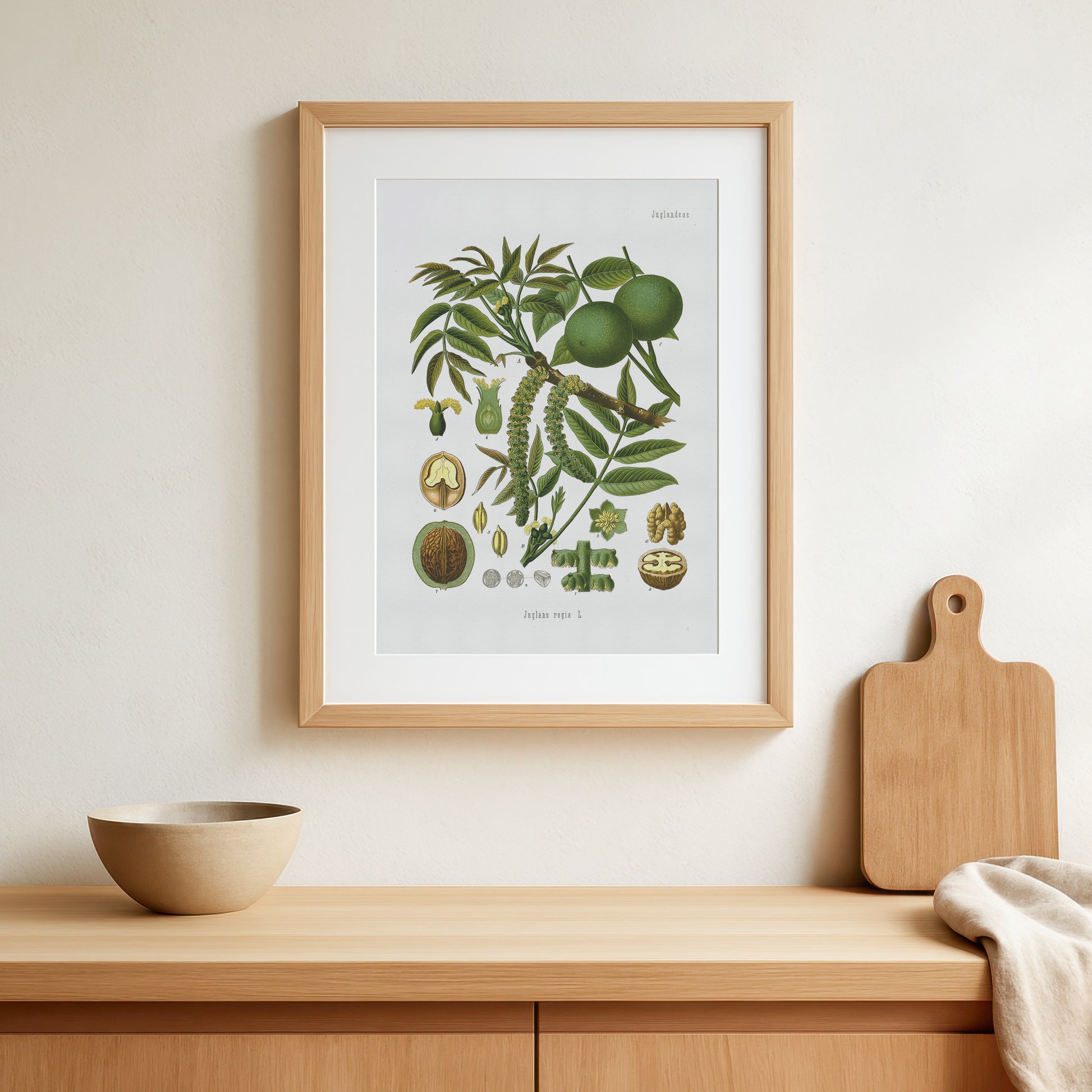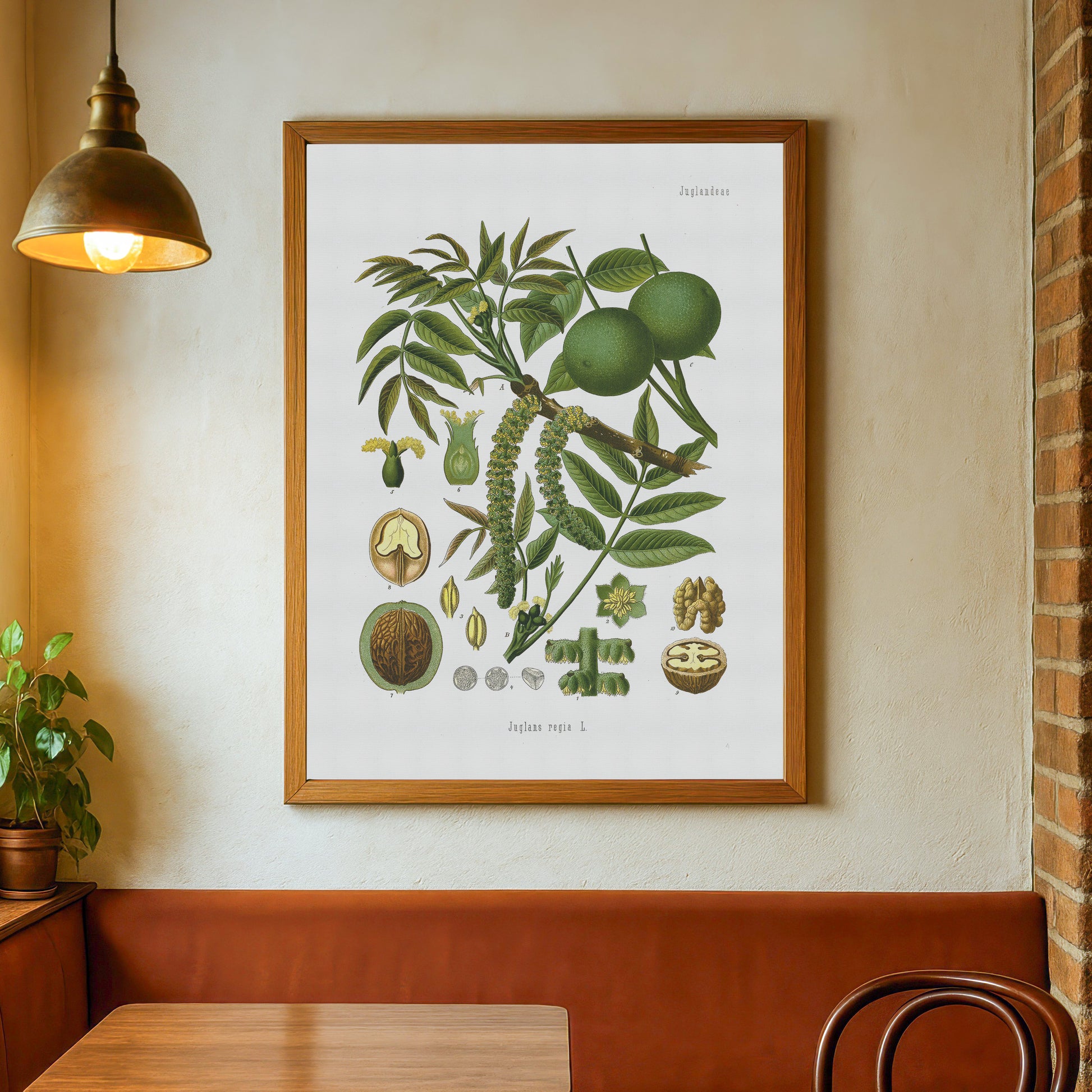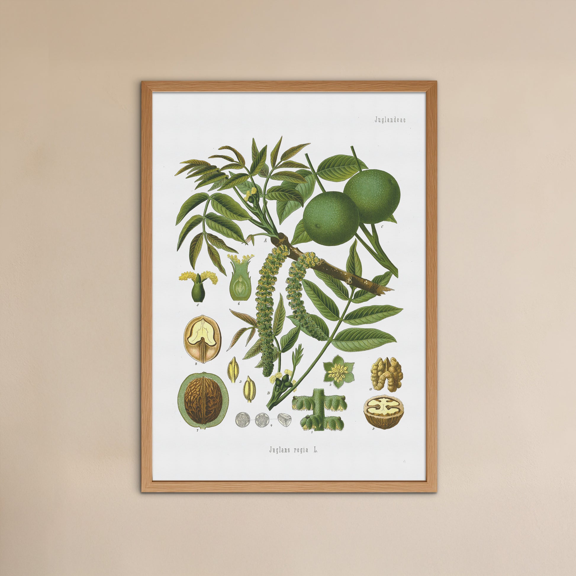 Denne plakat af Valnødden (Juglans regia) fra en gammel botanikbog er simpelthen fantastisk! Den er rig på detaljer og smukt farvet, hvilket gør den til en fantastisk tilføjelse i ethvert hjem. Dens livlige grønlige farver og brun-gule valnødder, mod den lysere baggrund, skaber med sikkerhed en balance for øjet der ser den. Plakaten viser den unikke struktur af det hårde, fibrøse skal samt dets indre frø, som har forsynet mennesker med næring i århundreder. Det er en dejlig påmindelse om, hvordan naturen forbinder os alle gennem tiden, selv nu.