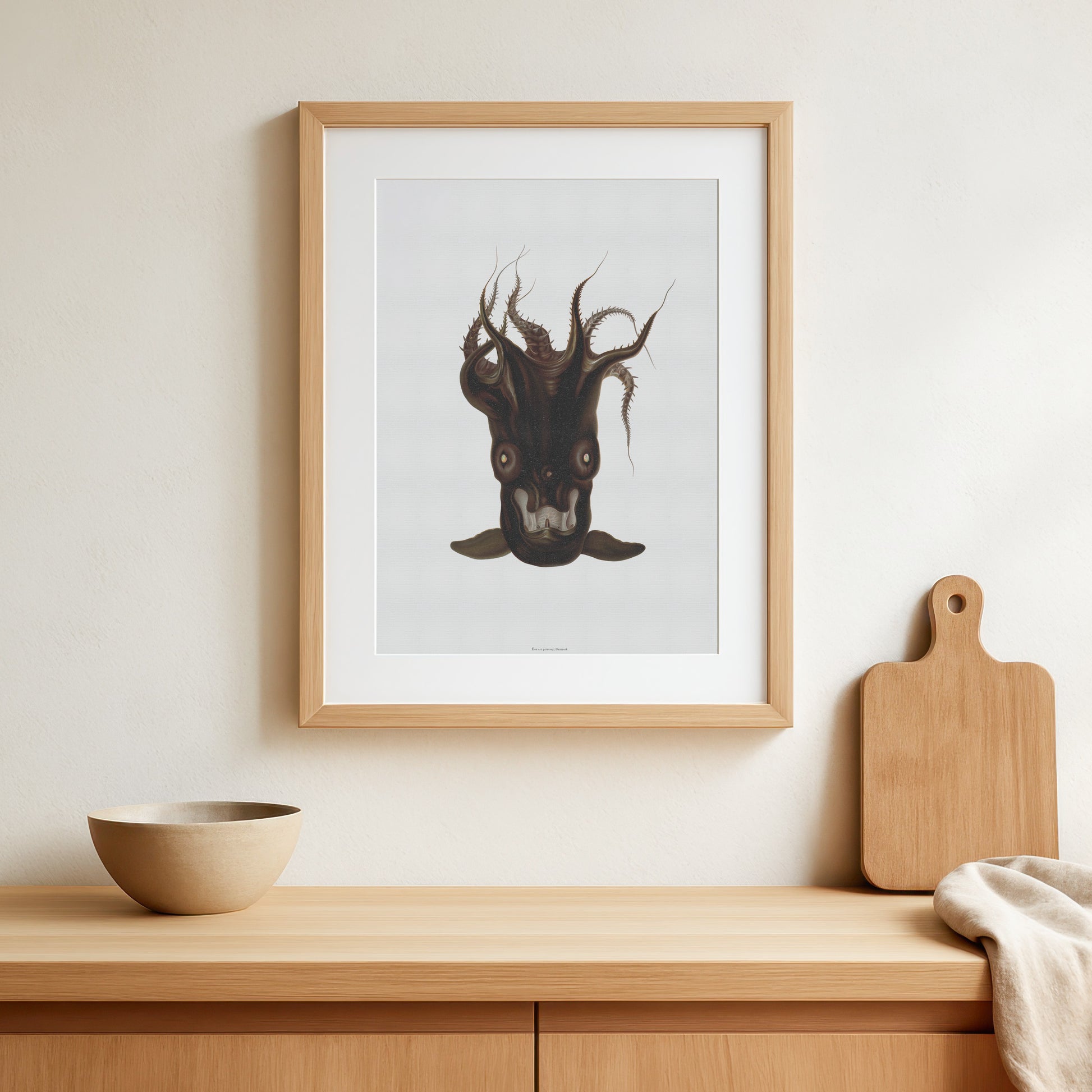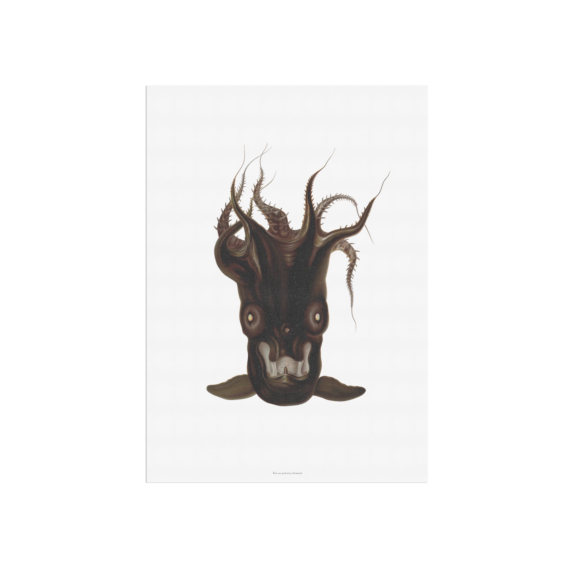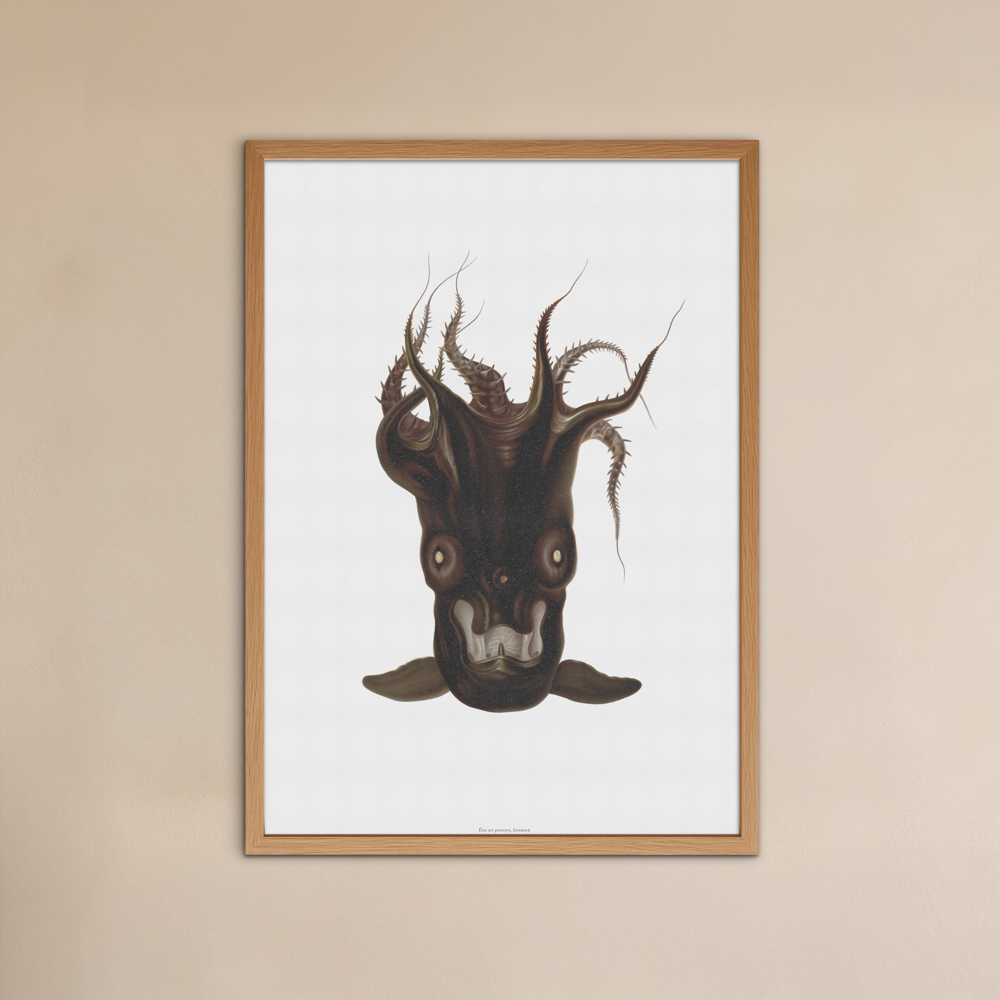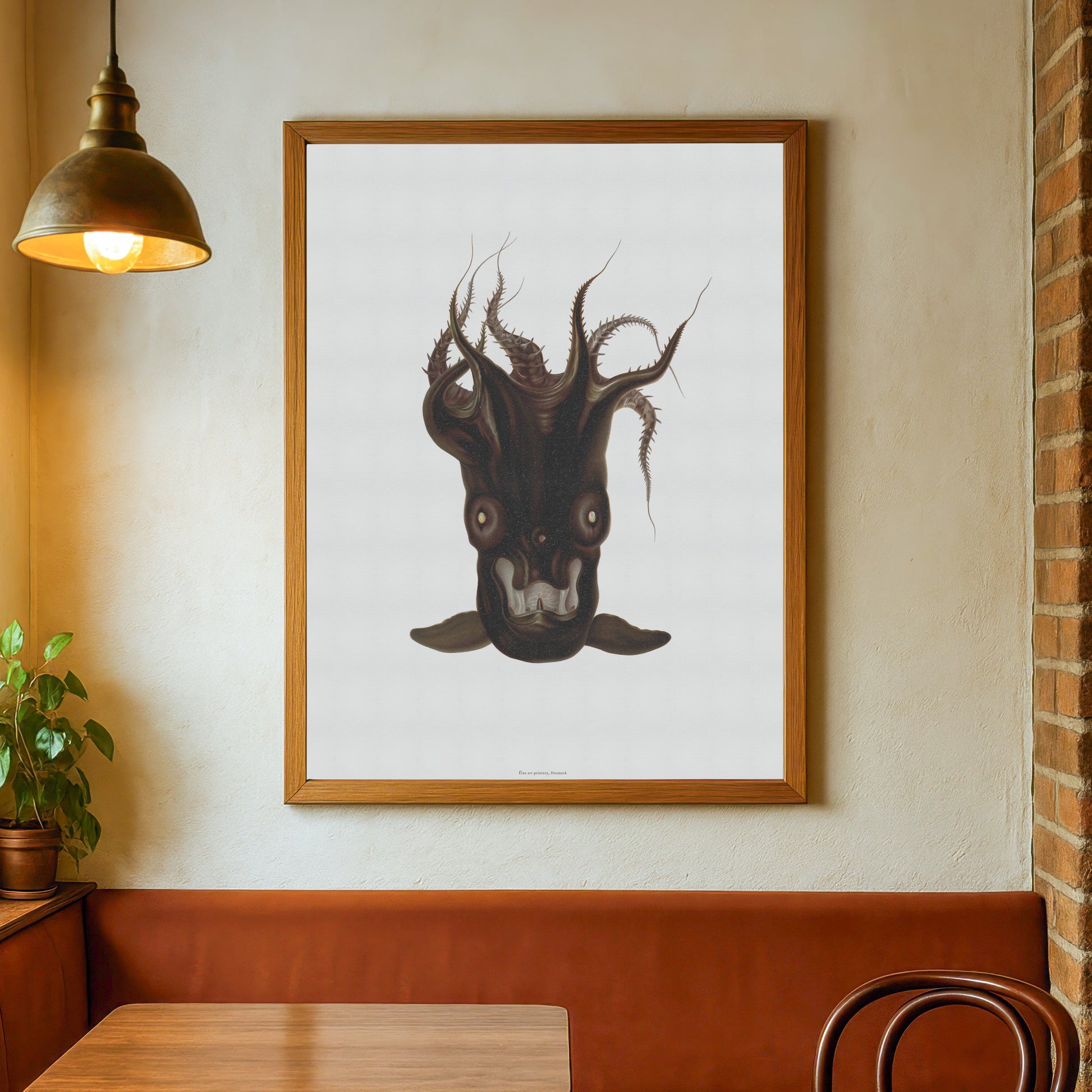 Indret med et strejf af havets mest mystiske væsener med denne fascinerende vintage plakat, der viser den uhyggelige, men smukke, vampyrblæksprutte (Melanoteuthis lucens). Motivet er en autentisk reproduktion af en illustration fra den videnskabelige publikation "Résultats des Campagnes Scientifiques", udgivet i 1920. Dette værk dokumenterede de banebrydende opdagelser fra Prins Albert I af Monacos dybhavsekspeditioner.