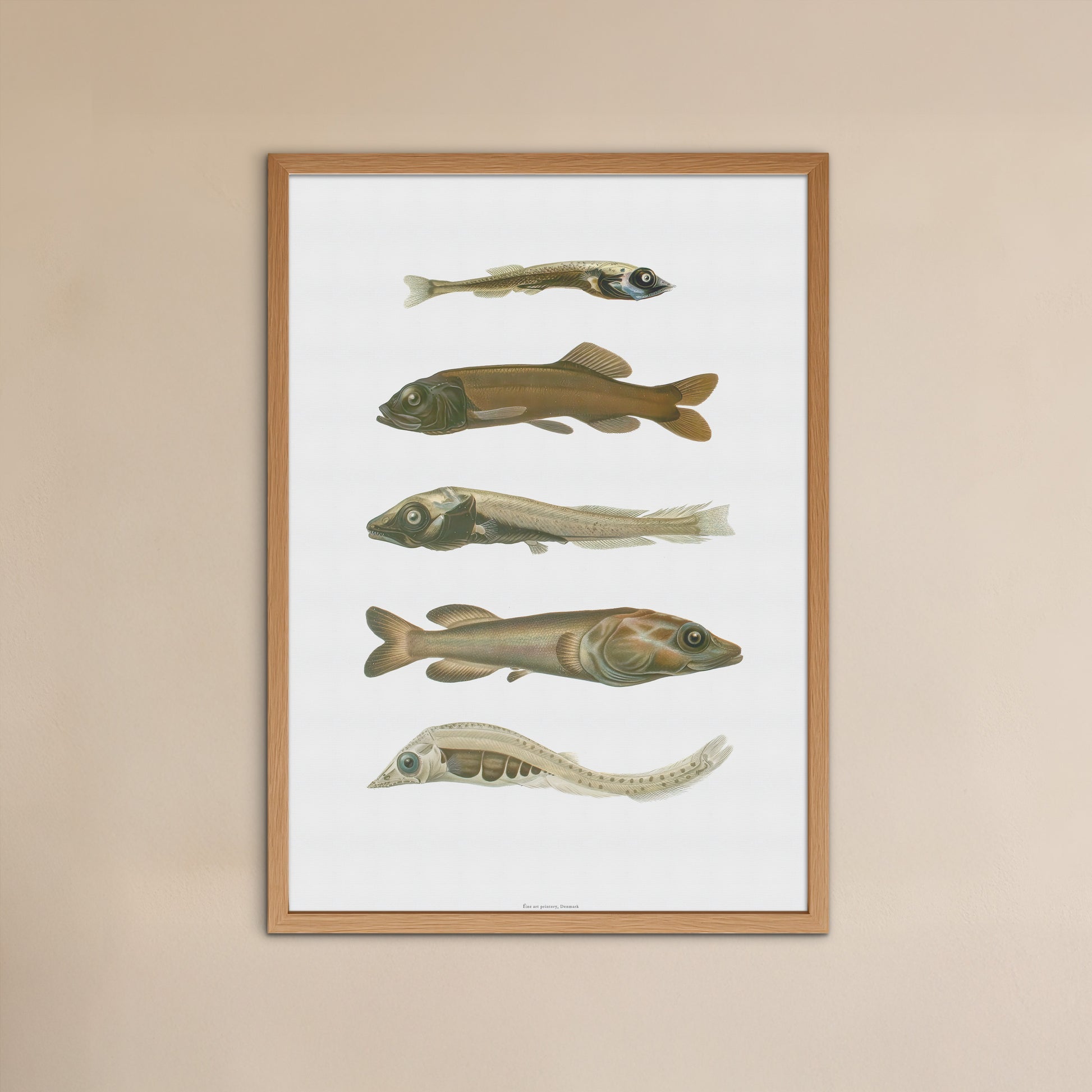 Plakaten præsenterer fem forskellige dybhavsfisk, herunder medlemmer af familierne Smooth-Heads og Spookfish (Spøgelsesfisk). Illustration er en kunstnerisk gengivelse af originalen, der viser fiskenes unikke og næsten overjordiske former, som er tilpasset til at leve i havets mørkeste regioner.