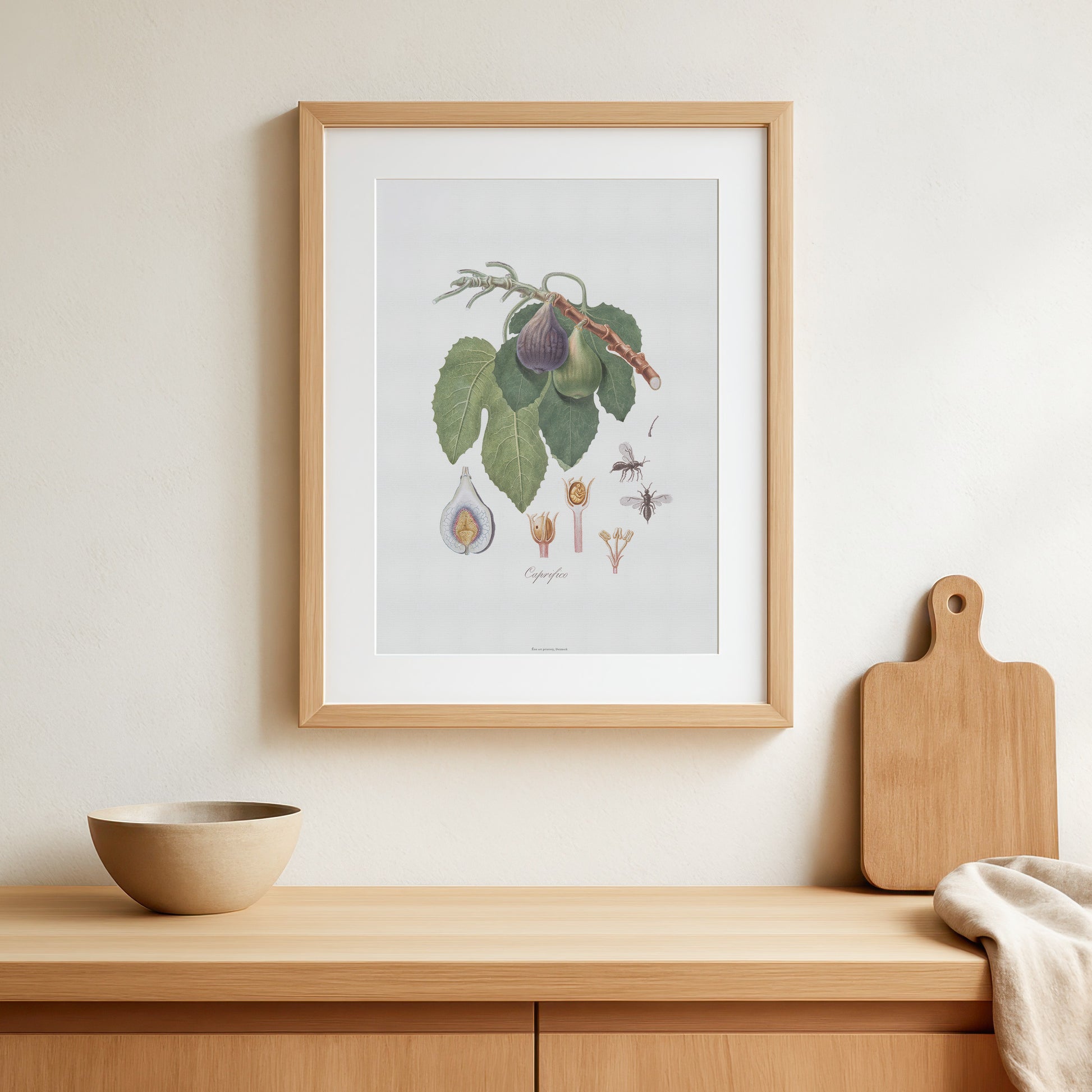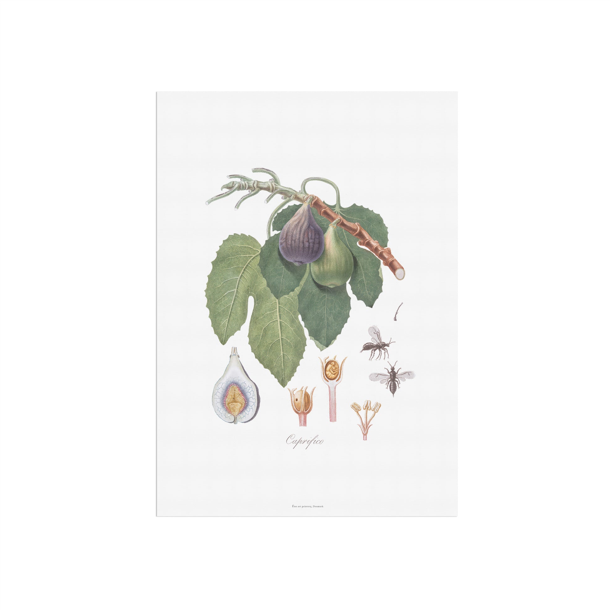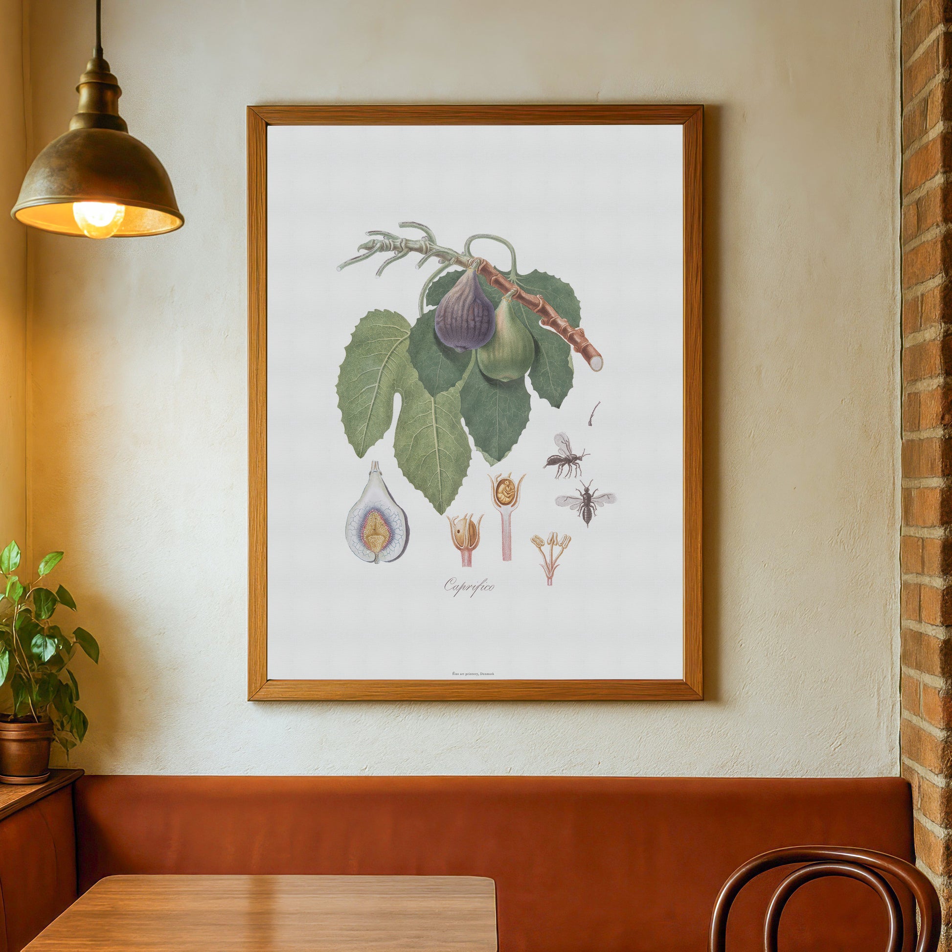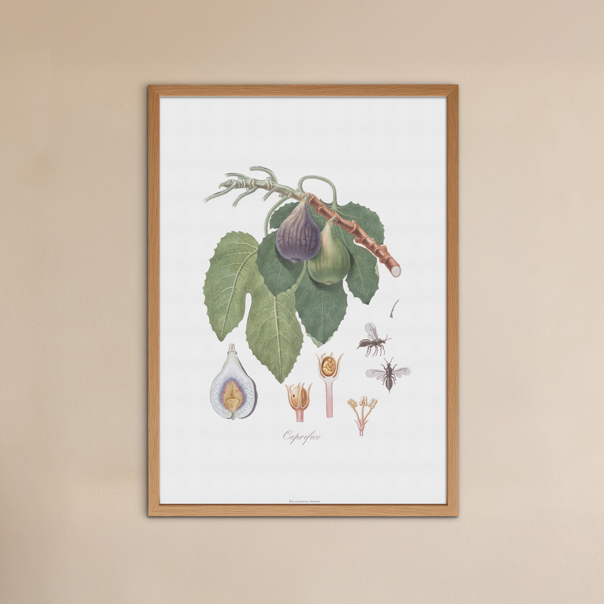 Plakaten viser en detaljeret gengivelse af en Caprifigen, en vild form for figen, som er afgørende for bestøvningen af spiselige figner. Illustrationen er en visuel fortælling om naturens kompleksitet. Du ser figenbladene og fignerne på grenen, men det mest spændende element er det detaljerede tværsnit af figenfrugten, der afslører dens indre struktur. Og ikke mindst: Den lille figenhveps (Blastophaga psenes), som er vital for figenens reproduktion, er også illustreret. Figenhvepsen lever i et symbiotisk forhold med figenplanten, hvor hvepsen bestøver blomsterne inde i frugten, og til gengæld lægger sine æg der.
